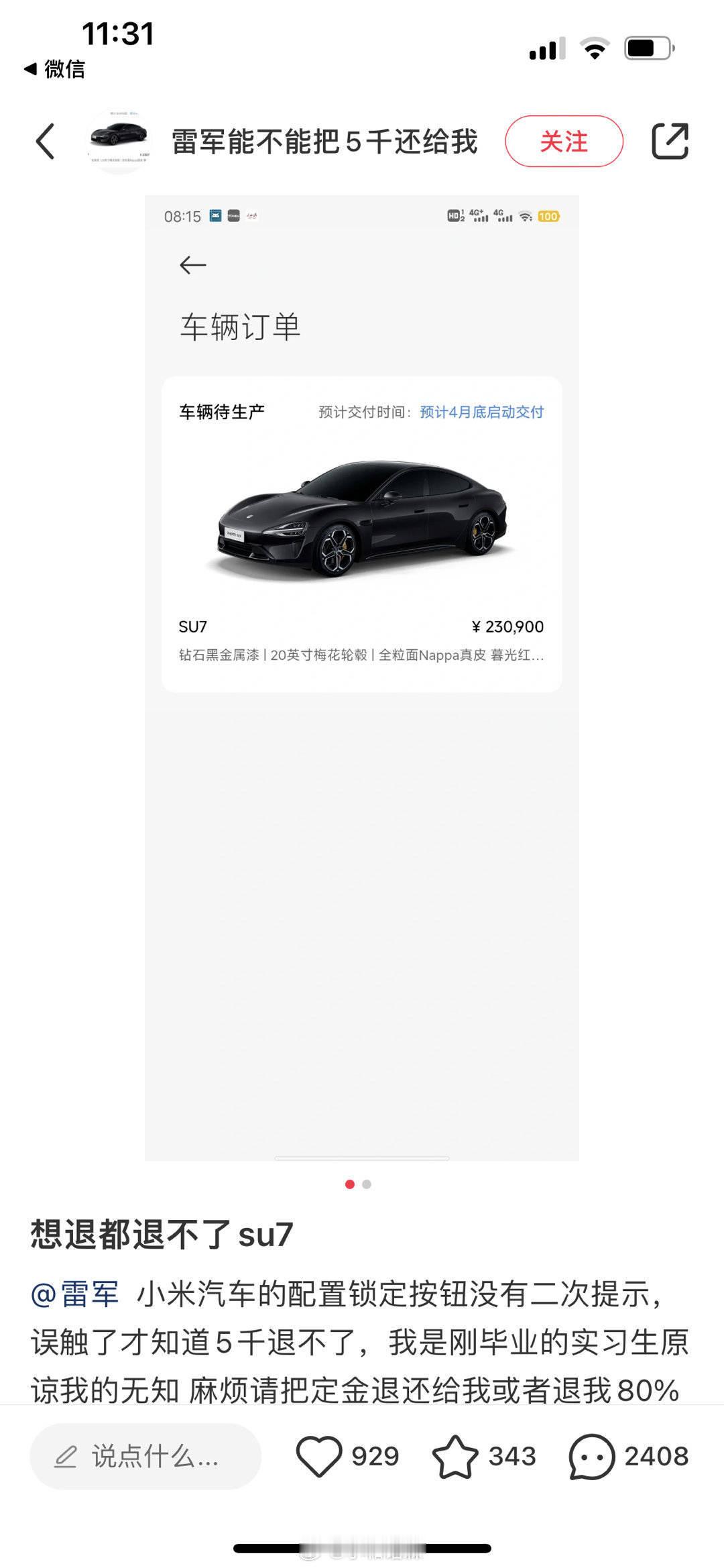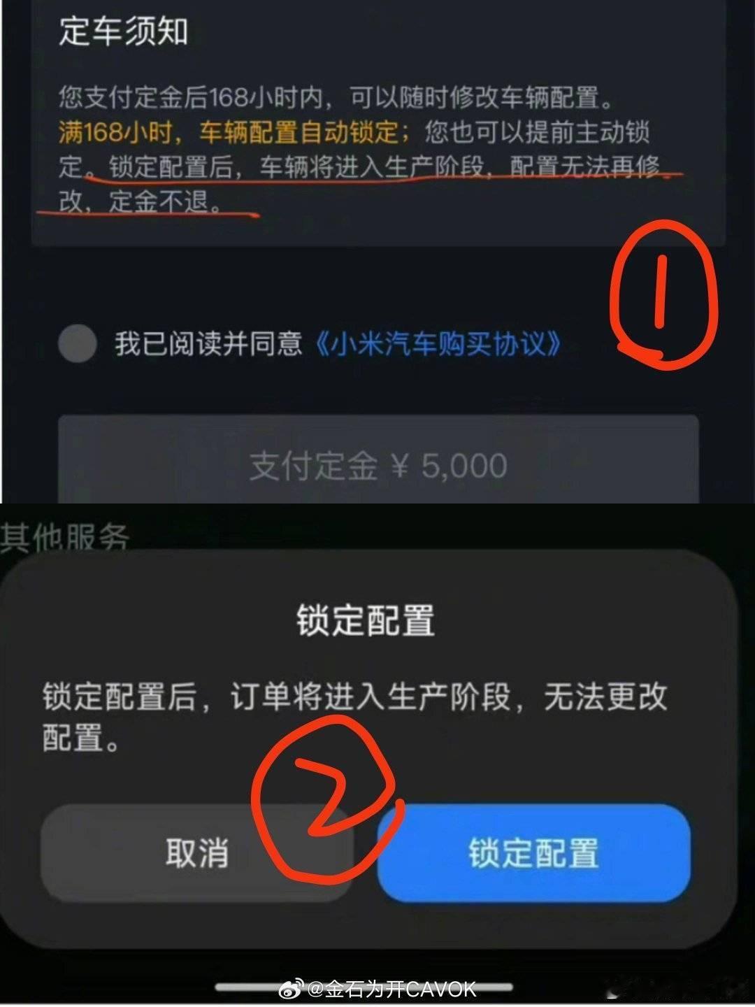 但其实,小米这次没有像其他汽车一样盲订,然后小定转大定,然后补尾款,而是一种特别的,用抢购创始版的模式来推新车,而且承诺七天内定金可以退,所以一大部分凑热闹又想假装自己也买了小米汽车,结果没看清楚的人,就点了锁单按钮。