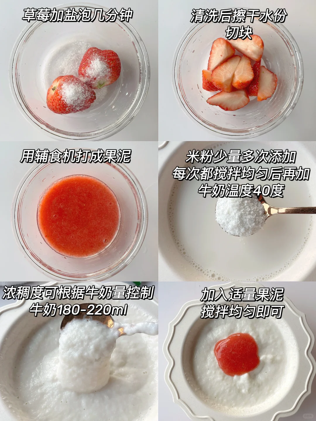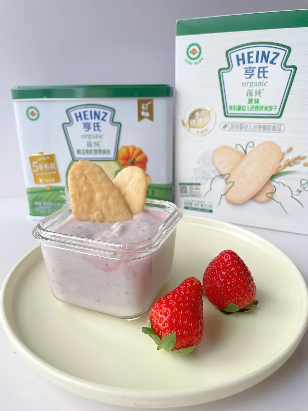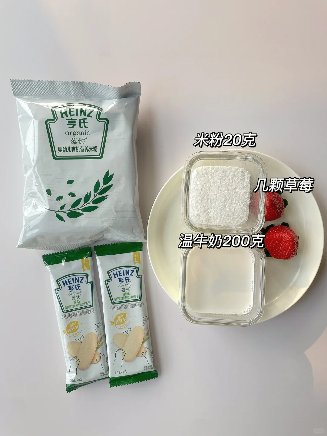 🌈给宝宝安排这款下午茶吧~ 酸甜可口的草莓果泥加上浓郁的米粉,再搭配两块米饼,营养和口感上都得到了满足~ ✅准备食材: 1.亨氏米粉20克,草莓3、4颗,温牛奶180-220ml,亨氏米饼两块; ✅制作步骤: 1.草莓加盐泡几分钟,洗净后擦干表面水份,切小块放入辅食机打成果泥; 2.准备40度左右的温牛奶,米粉少量多次加入,边加边搅拌,奶量可根据浓稠度来增减; 3.米粉冲好后加入果泥,搅拌均匀即可。 今天用的是亨氏的婴幼儿有机米粉和米饼,草莓+米粉这个搭配大家可以试试,有草莓酸奶的口感哦~这款亨氏的米粉采用了预糊化工艺,形状是片状的,这样会让米粉吸水更均匀,容易冲调的更细腻方便宝宝进食。 👩🏻‍🏫而且米粉还是5重有机:有机种植、原料、加工、专项检测和管理,可以说做到了全链有机~ 还添加了Oligo有机FOS益生元,可以呵护宝宝肠道环境; 宝宝很喜欢米饼,一口气吃了两袋~味道很香甜,是大米本身的香甜味。米饼里含有6大高配营养强化钙铁锌,宝宝好吸收; 👩🏻‍🏫而且亨氏的米饼钠含量远低于小白菜,也没有添加盐、白砂糖和香精等,保护宝宝的味蕾哦,还是独立小包装,方便又卫生~