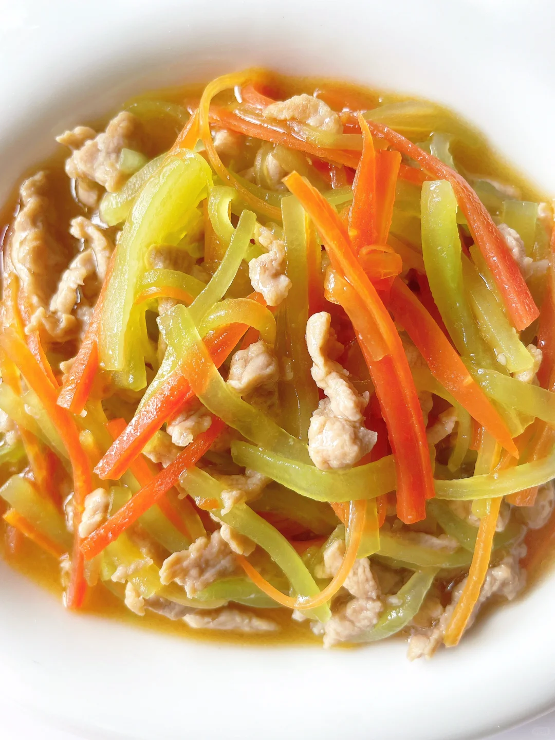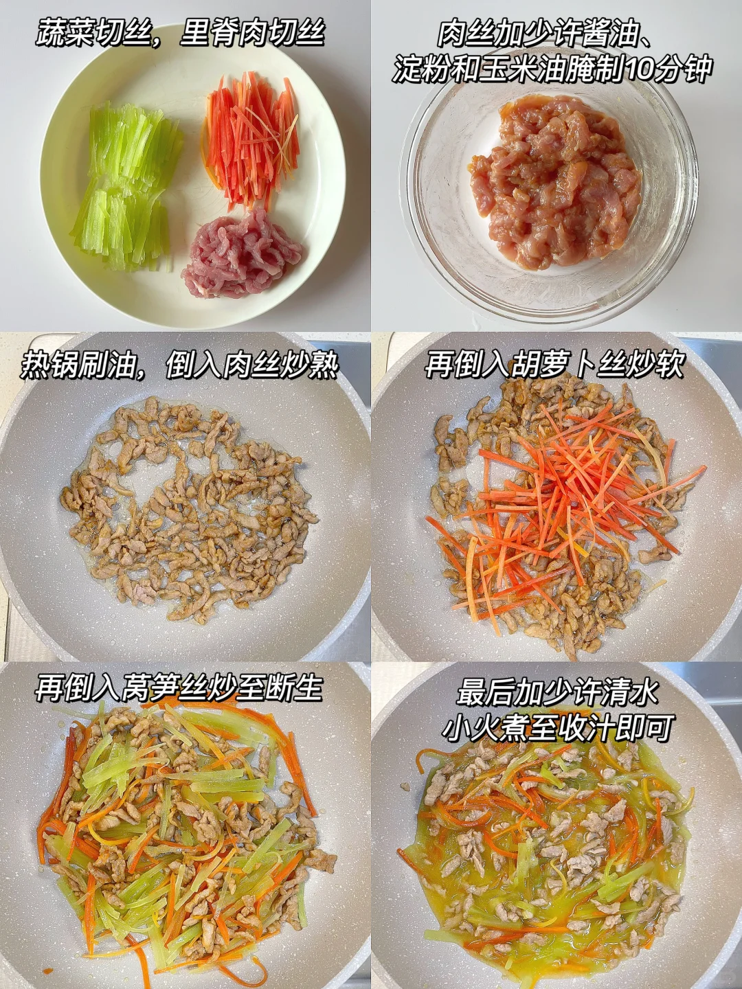 🌈鲜香下饭的家常菜,宝宝爱吃 🎈准备食材: 1️⃣芦笋一段,胡萝卜一块,瘦肉一小块; 🎈制作步骤: 1️⃣蔬菜和瘦肉切丝; 2️⃣肉丝+少许酱油+少许淀粉和玉米油腌制10分钟; 3️⃣热锅刷油,倒入肉丝炒熟,再倒入蔬菜丝炒至断生,再加少许清水煮至收汁,再撒入少许盐炒匀;