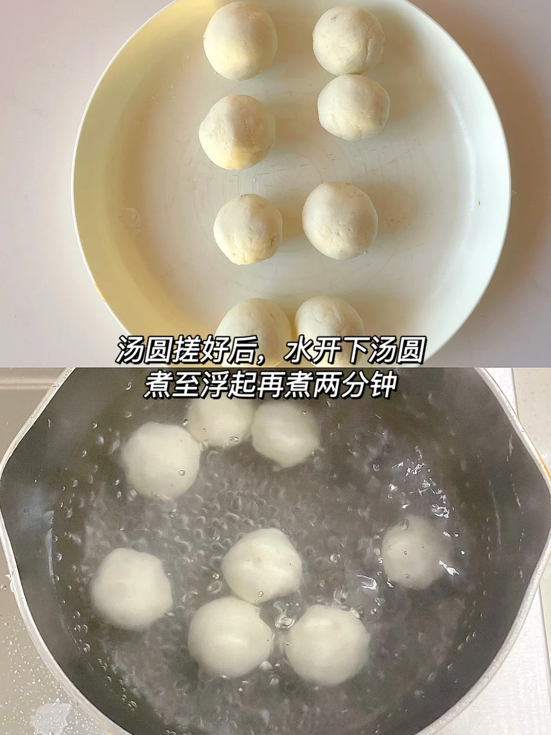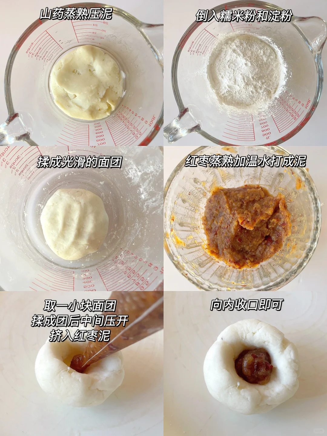 🌈香甜软糯的小汤圆~ 🎈准备食材: 1️⃣铁棍山药100克(去皮),糯米粉20克,淀粉10克,红枣适量; 🎈制作步骤: 1️⃣山药蒸熟压泥,倒入糯米粉和淀粉揉成光滑的面团,红枣蒸熟加温水打成泥; 2️⃣枣泥装入裱花袋备用,取一小块面团揉圆,把中间按下去,尽量把四周的皮按薄点,把枣泥挤入中间,向内收口搓圆即可; 3️⃣锅中烧水,水开后下汤圆,煮至浮起时再煮两分钟即可。