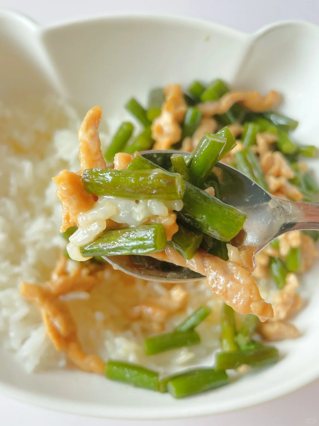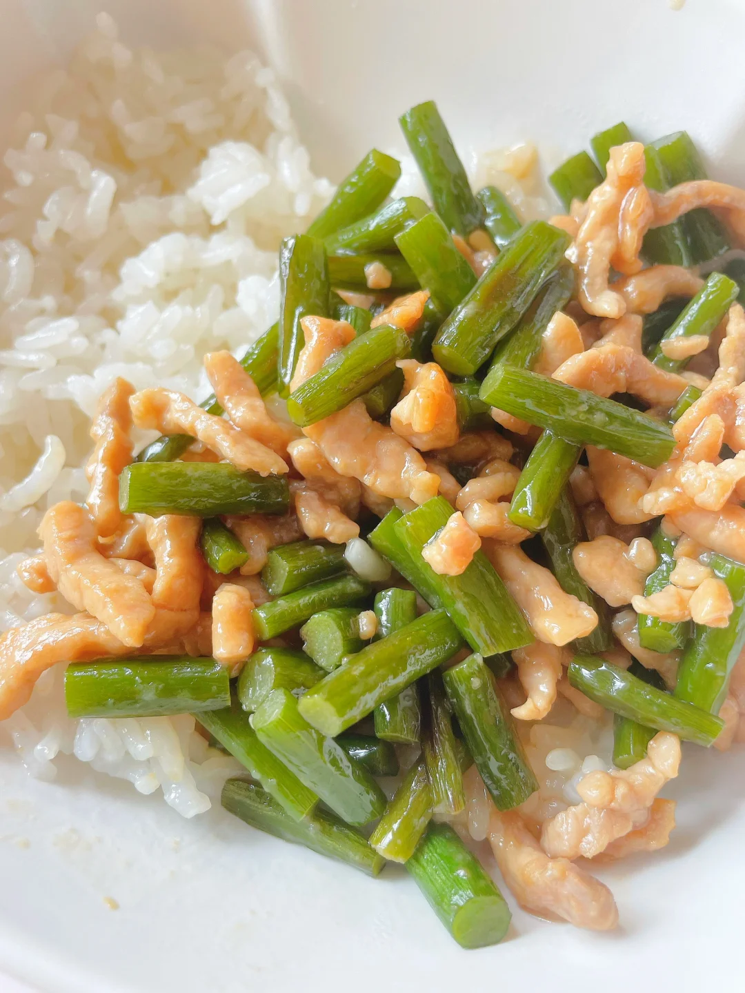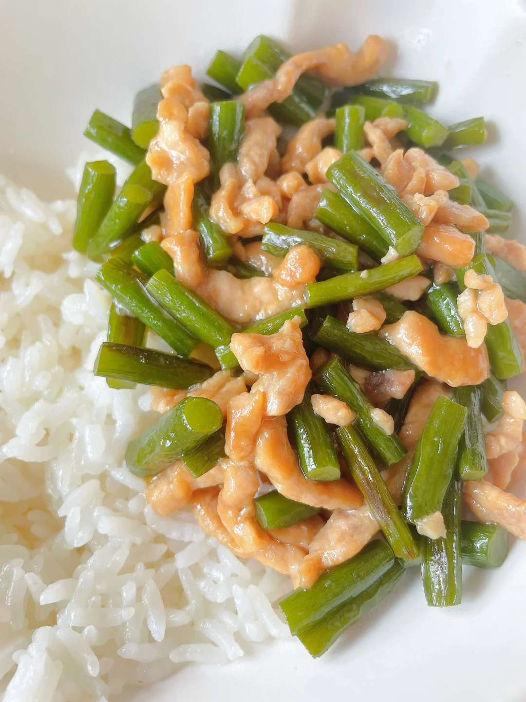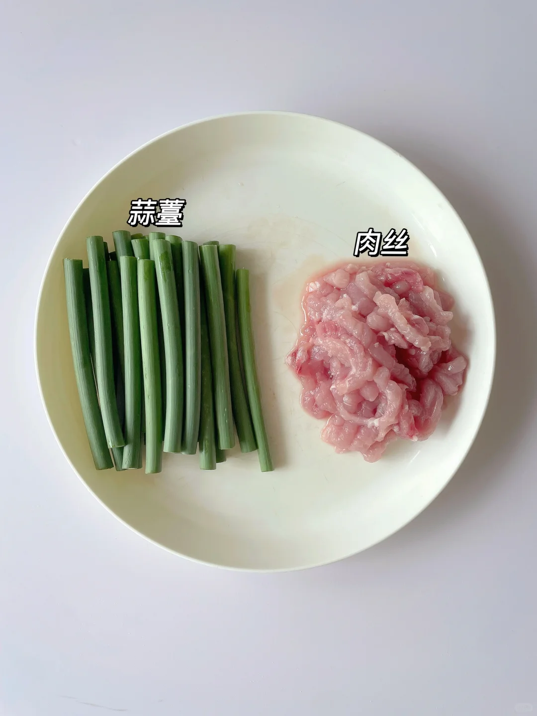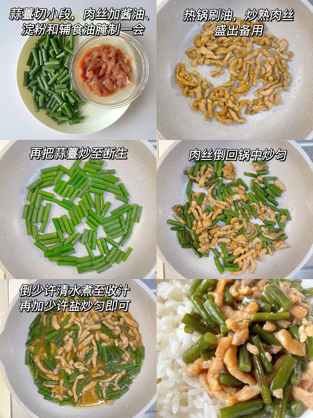 🌈清甜的蒜薹和肉丝在一起太下饭了~ 🎈准备食材: 1️⃣蒜薹三、四根,肉丝适量; 🎈制作步骤 1️⃣蒜薹洗净切小段,肉丝加少许酱油、淀粉和辅食油腌制十几分钟; 2️⃣热锅刷油,先倒入肉丝炒熟炒香,盛出备用,锅中再倒少许油,倒入蒜薹炒至断生; 3️⃣肉丝倒回锅中炒匀,加少许清水煮至收汁,再加点盐翻炒均匀即可出锅。