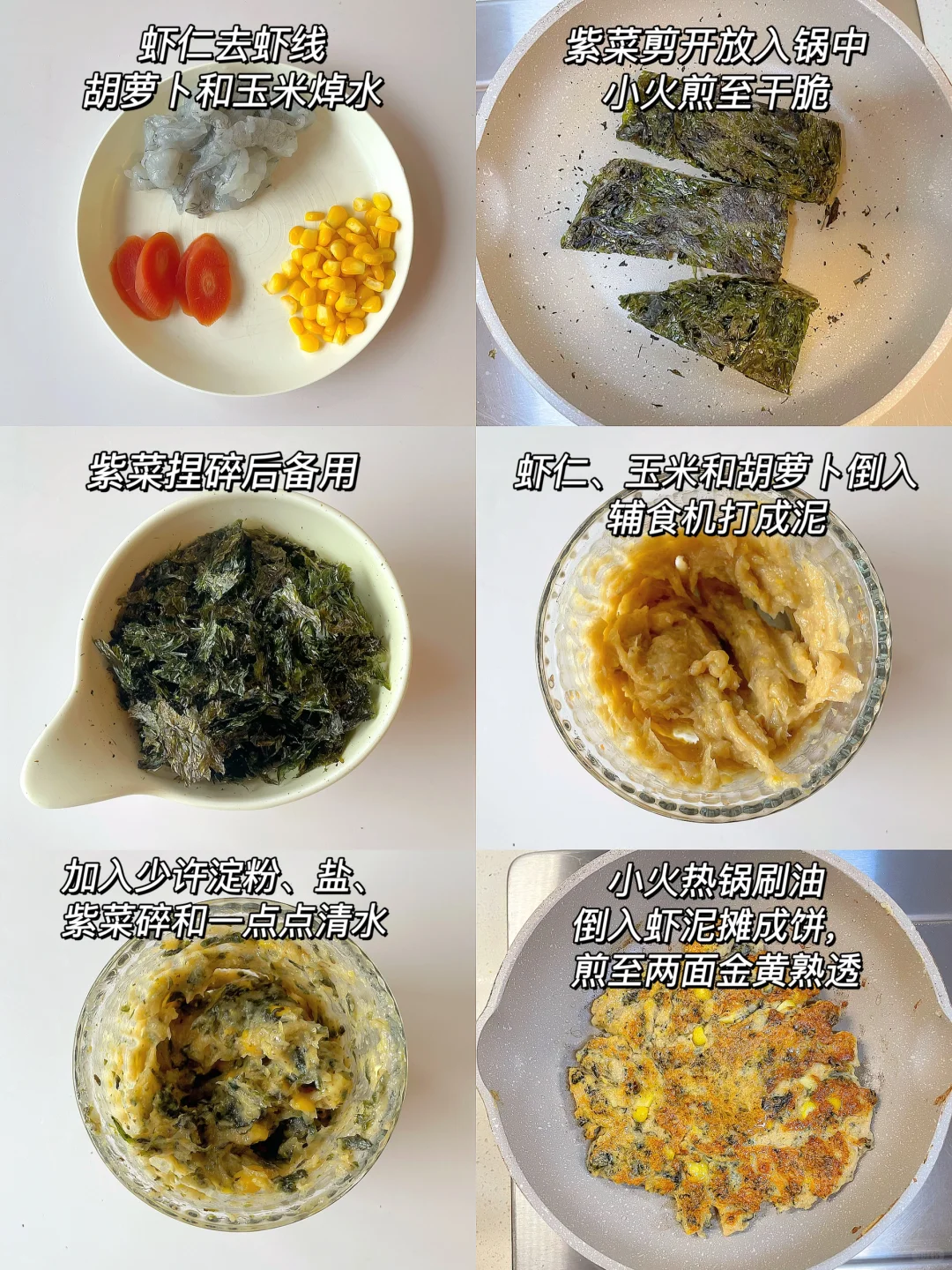 🌈大家都知道DHA对孩子大脑发育的重要性,今天我就用紫菜和鲜虾这两种富含DHA的食材做了一款虾排,鲜美又营养~ 🎈准备食材: 1️⃣免洗紫菜适量,鲜虾六只,玉米粒和胡萝卜适量; 🎈制作步骤: 1️⃣紫菜剪成小块,放入平底锅中,开小火剪至两面干脆,捏碎备用; 2️⃣鲜虾取虾仁去虾线,玉米和胡萝卜焯水后捞出,然后一起倒入辅食机中打成泥; 3️⃣虾泥中加入少许淀粉、盐、清水和紫菜碎,搅拌均匀; 4️⃣平底锅小火热锅刷油,倒入虾泥摊成饼,煎至两面金黄熟透即可~ 家长们都很重视对宝宝DHA的补充,因为它对大脑发育有着至关重要的影响。平时可以多给宝宝摄入富含DHA的食物,例如鱼虾,海藻类,干果类等等; 除了饮食之外,还可以给宝宝吃星鲨的DHA藻油,这款藻油DHA味道宝宝愿意接受,平时剪开可以直接食用也可滴在辅食上吃。它的DHA含量高达120mg/粒,每天一粒刚好符合宝宝一天所需量; 并且是以非海洋打捞的裂壶藻为原料,通过专门的工艺提取的,无海洋污染。纯度也是高达45%,远超国家35%的标准,在目前行业中也是少见的 配料表只有DHA 和 葵花籽油,没有色素和香精等,宝宝吃的放心,更适合中国宝宝,新生宝宝15天就可食用了~