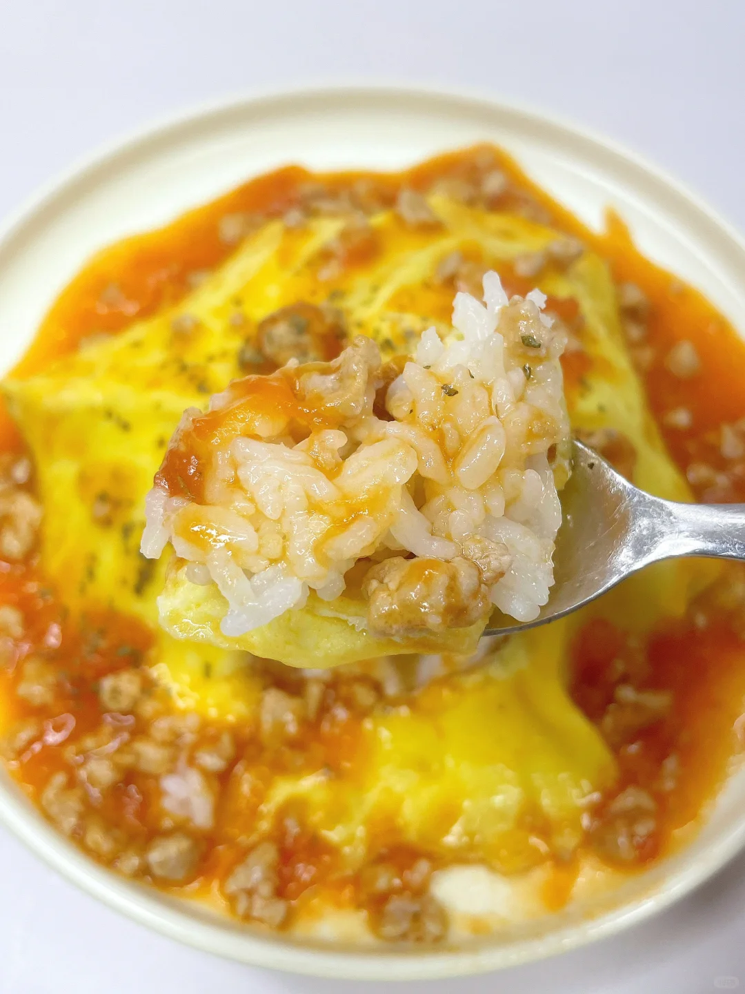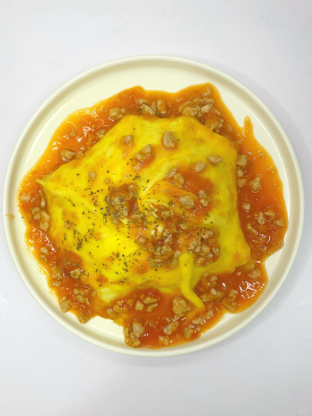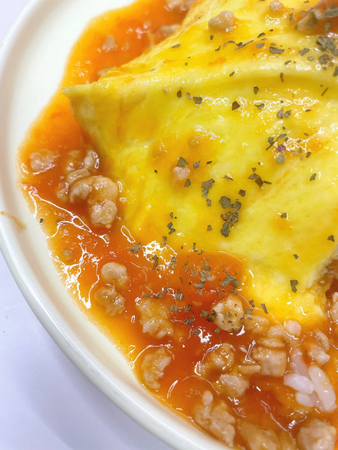 🎈把蛋皮盖在米饭上,再浇上番茄肉酱,撒入少许欧芹碎即可~