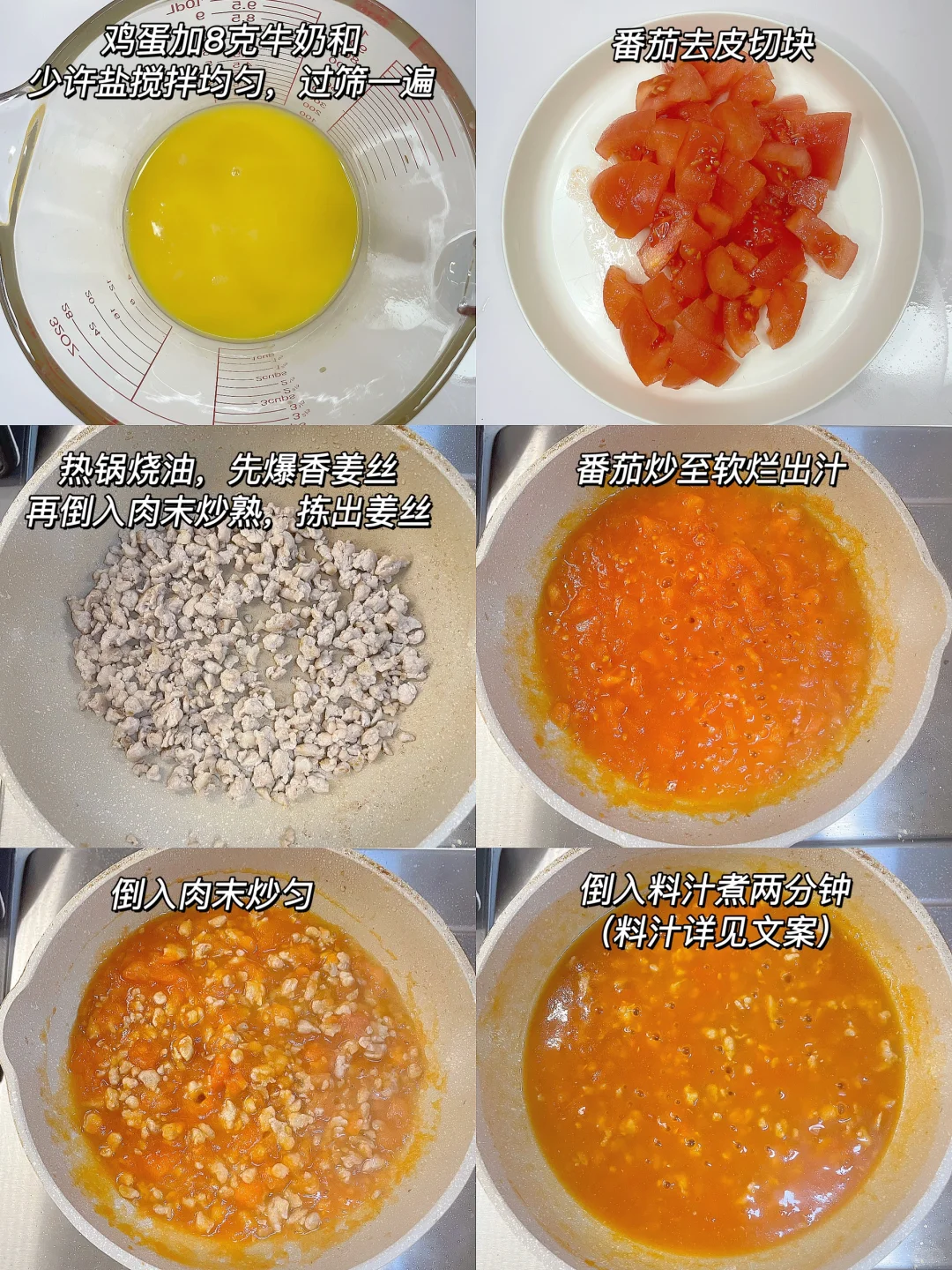 1️⃣番茄去皮切块,鸡蛋加8克牛奶和少许盐搅拌均匀,最好过筛一遍;