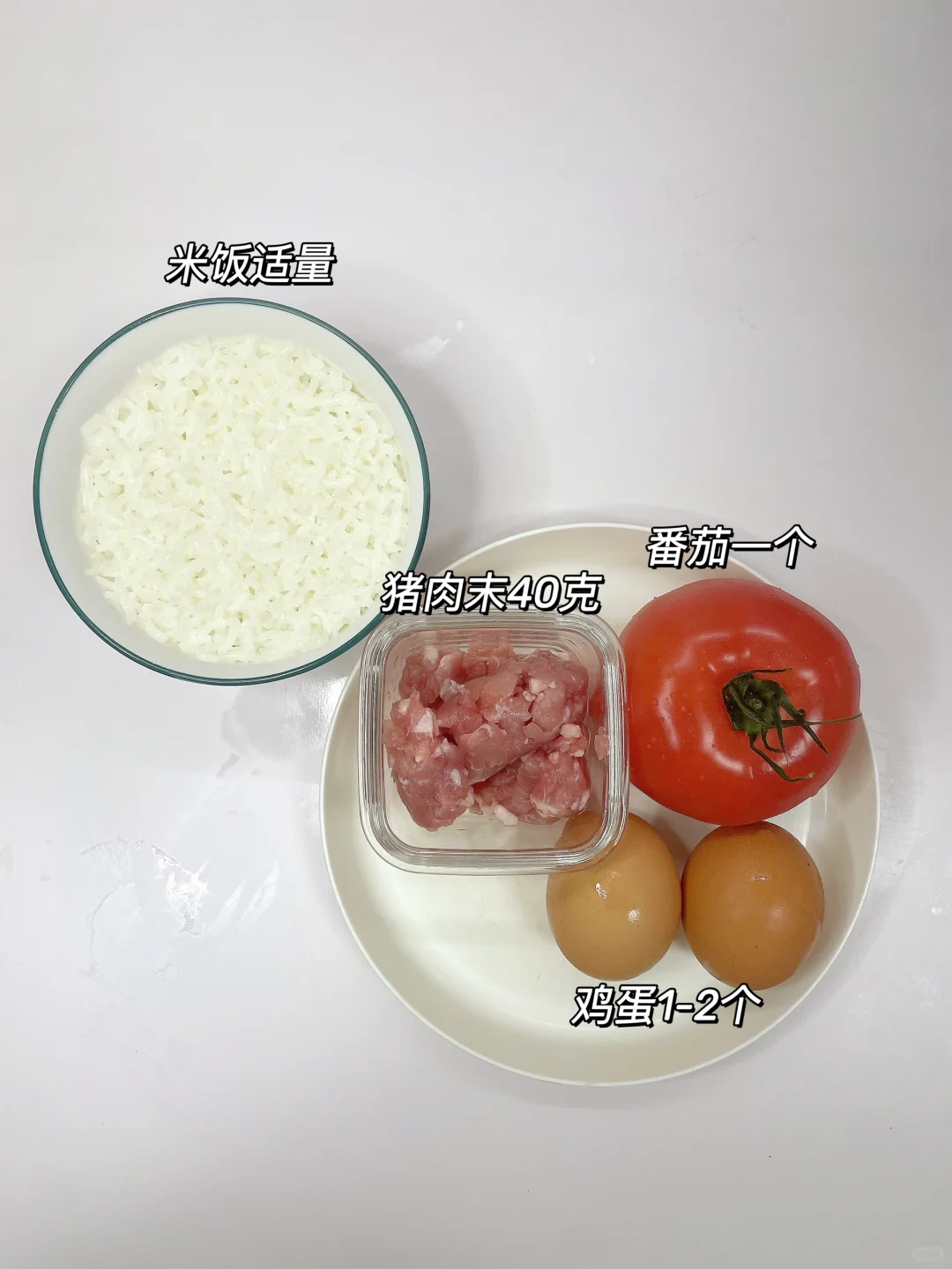 1️⃣米饭适量,鸡蛋1-2个,番茄一个,猪肉末40克;