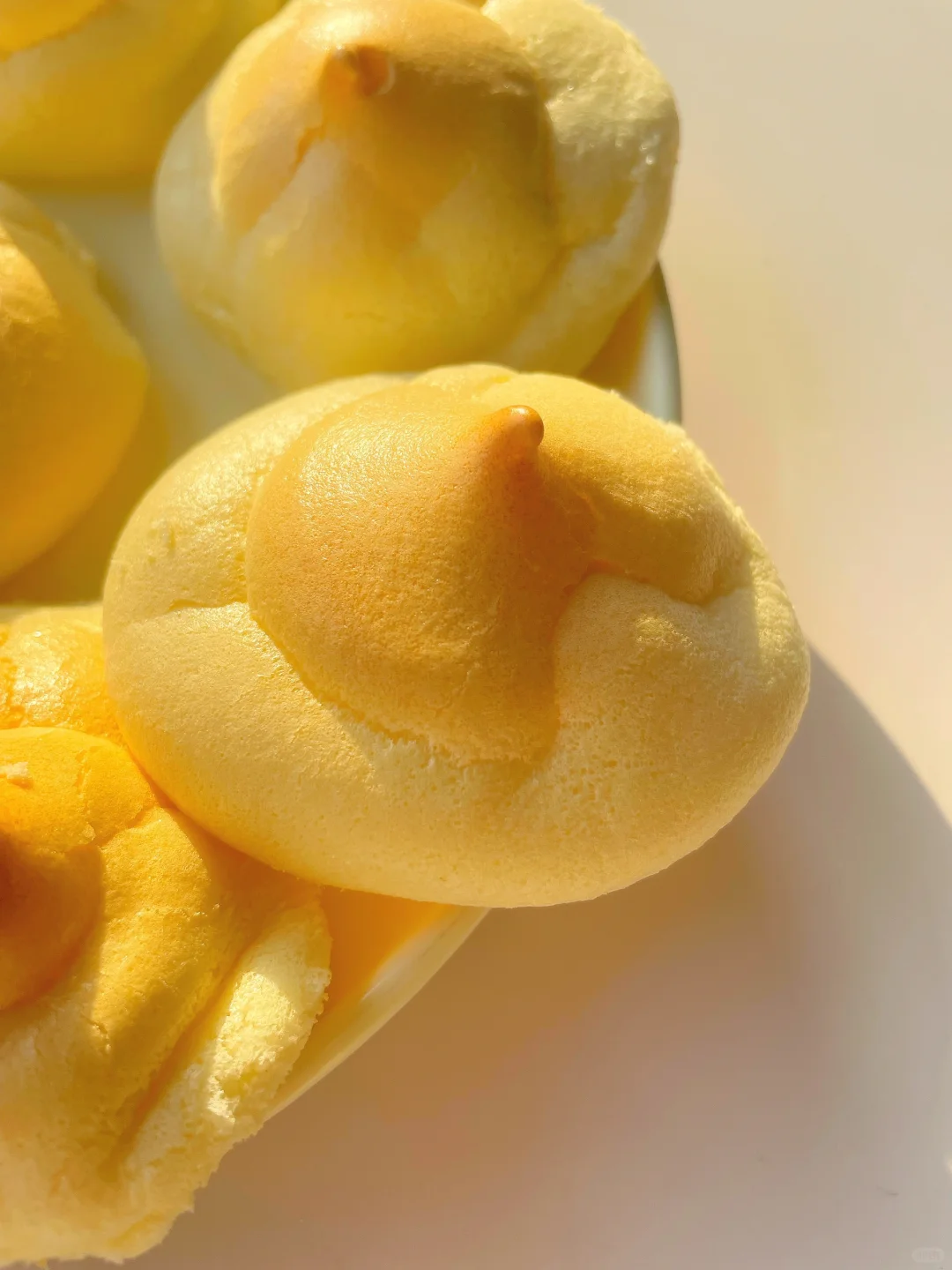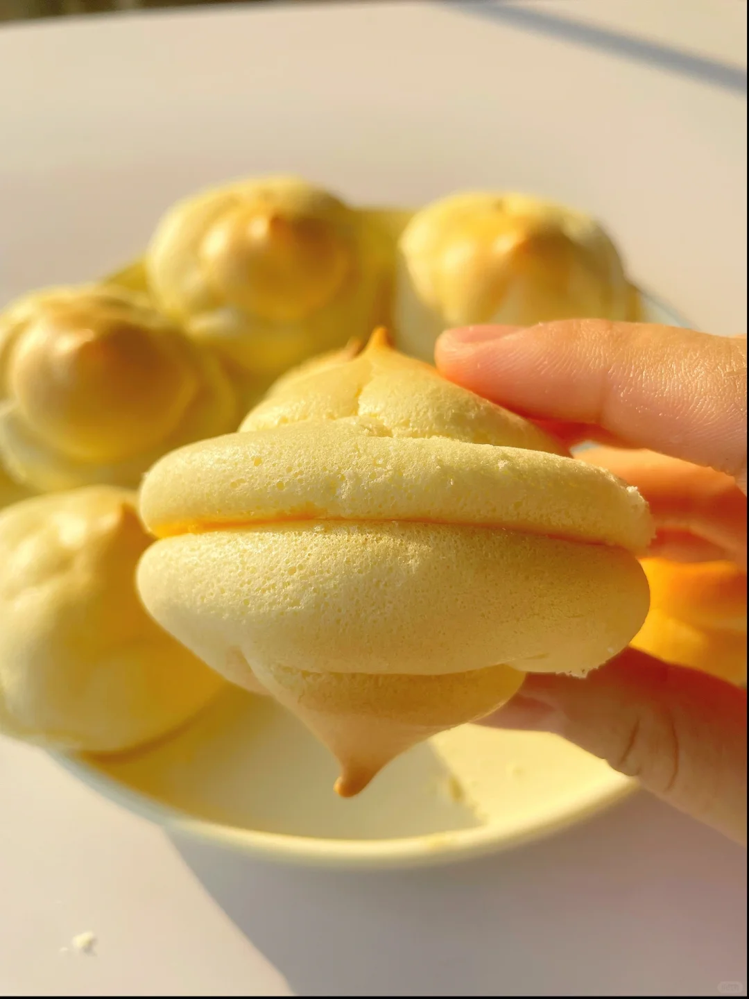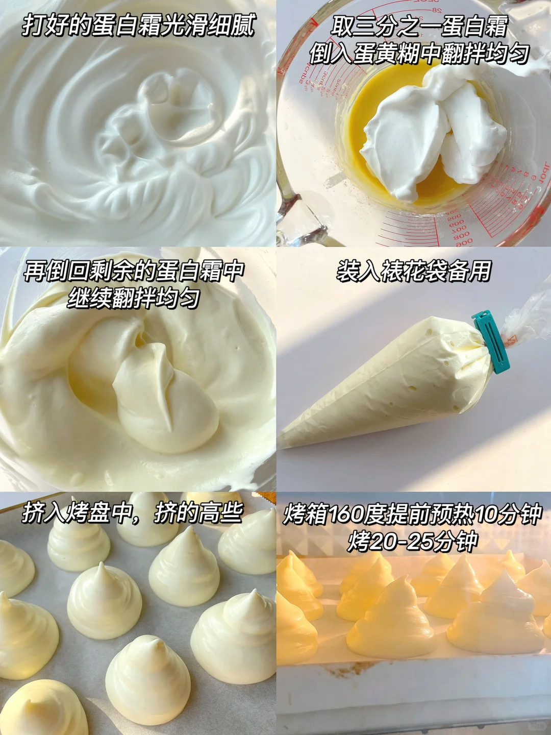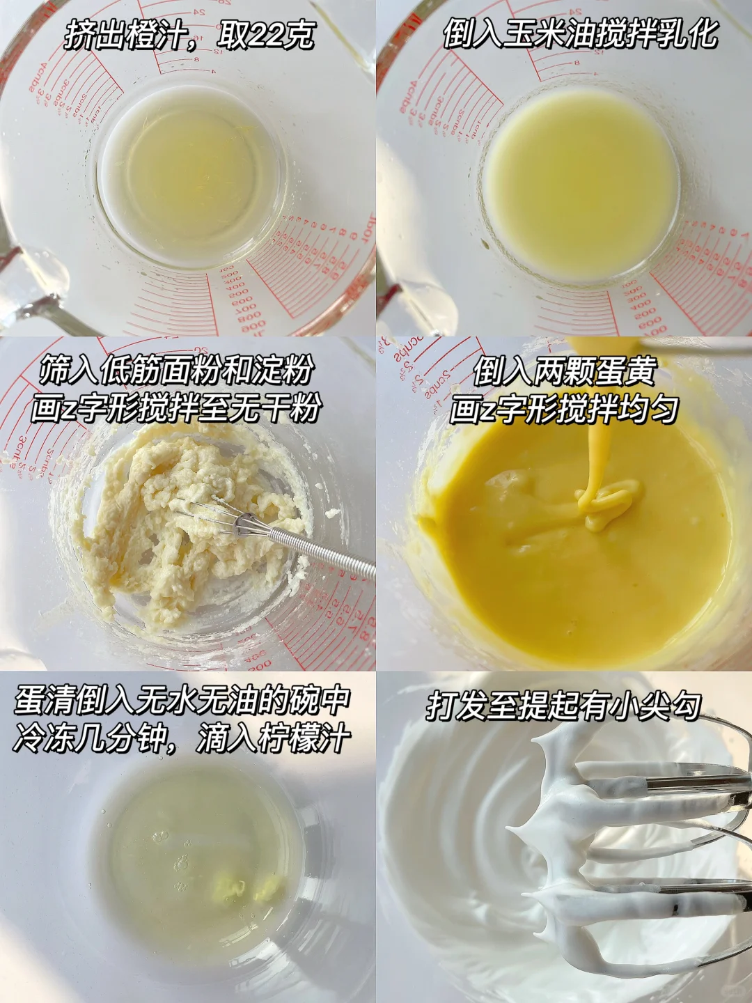 🍊又到了吃橙子的季节啦~ 🍰试试用橙汁给宝宝做这个小贝吧,清香柔软~ 🎈准备食材: 1️⃣橙子半个,玉米油18克,鸡蛋两个,低筋面粉30克,淀粉7克; 🎈制作步骤: 1️⃣挤出橙汁,取22克倒入碗中,加入玉米油搅拌至完全融合,筛入低筋面粉和淀粉,画一字形搅拌至无干粉; 2️⃣倒入两颗蛋黄,画一字形搅拌均匀,最后是可以滴落的顺滑酸奶状; 3️⃣蛋清倒入无水无油的碗中,放冰箱冷冻几分钟,取出滴入几滴柠檬汁,打发至提起有小尖勾,蛋白霜细腻有光泽; 4️⃣取三分之一蛋白霜倒入蛋黄糊中翻拌均匀,再倒回剩余蛋白霜中继续翻拌均匀,装入裱花袋备用; 5️⃣挤入铺了油纸的烤盘中,尽量挤的高些。烤箱160度预热10分钟(打发蛋白的时候开始预热),烤20-25分钟即可。