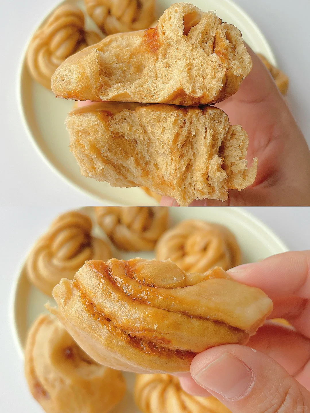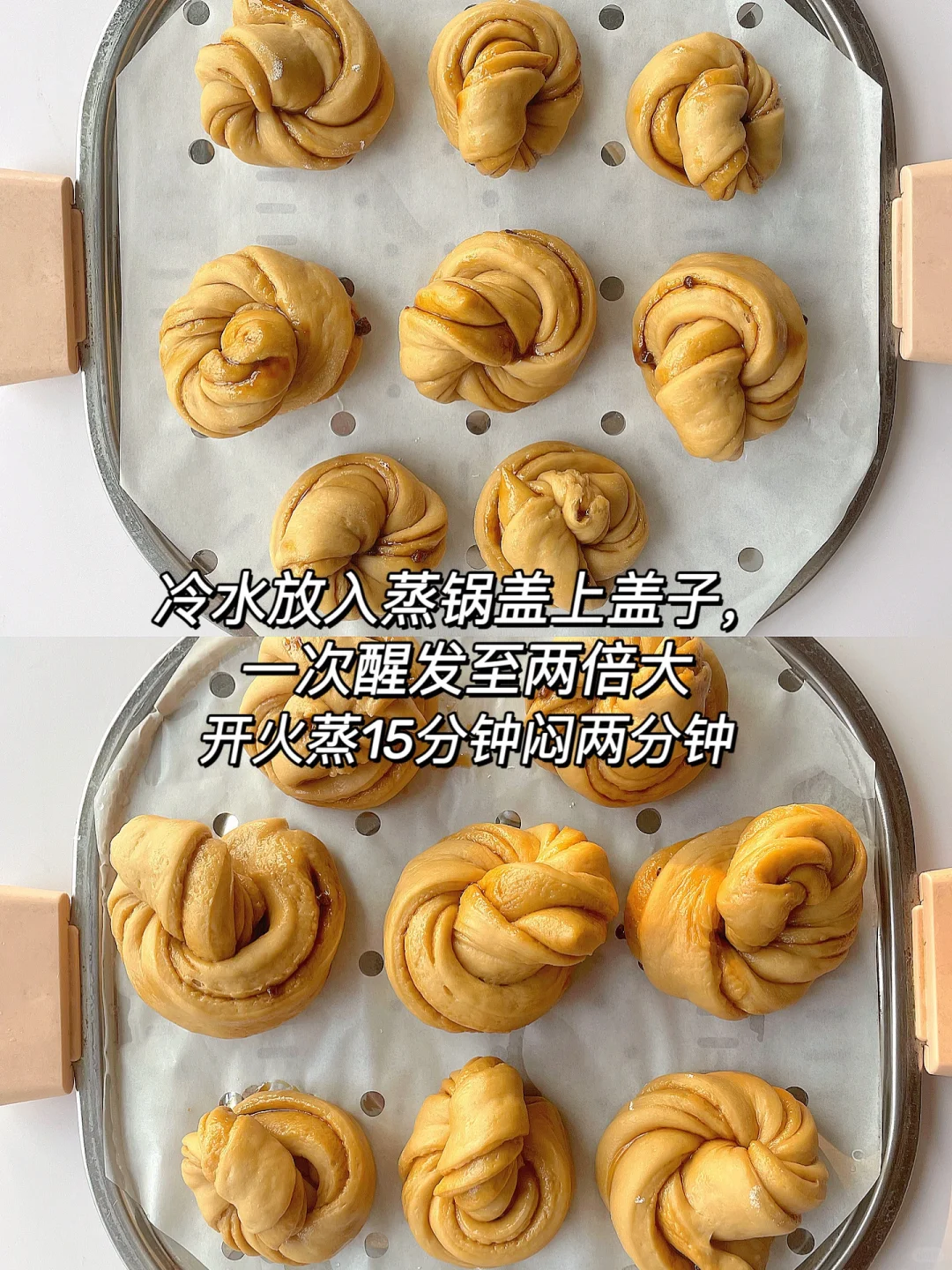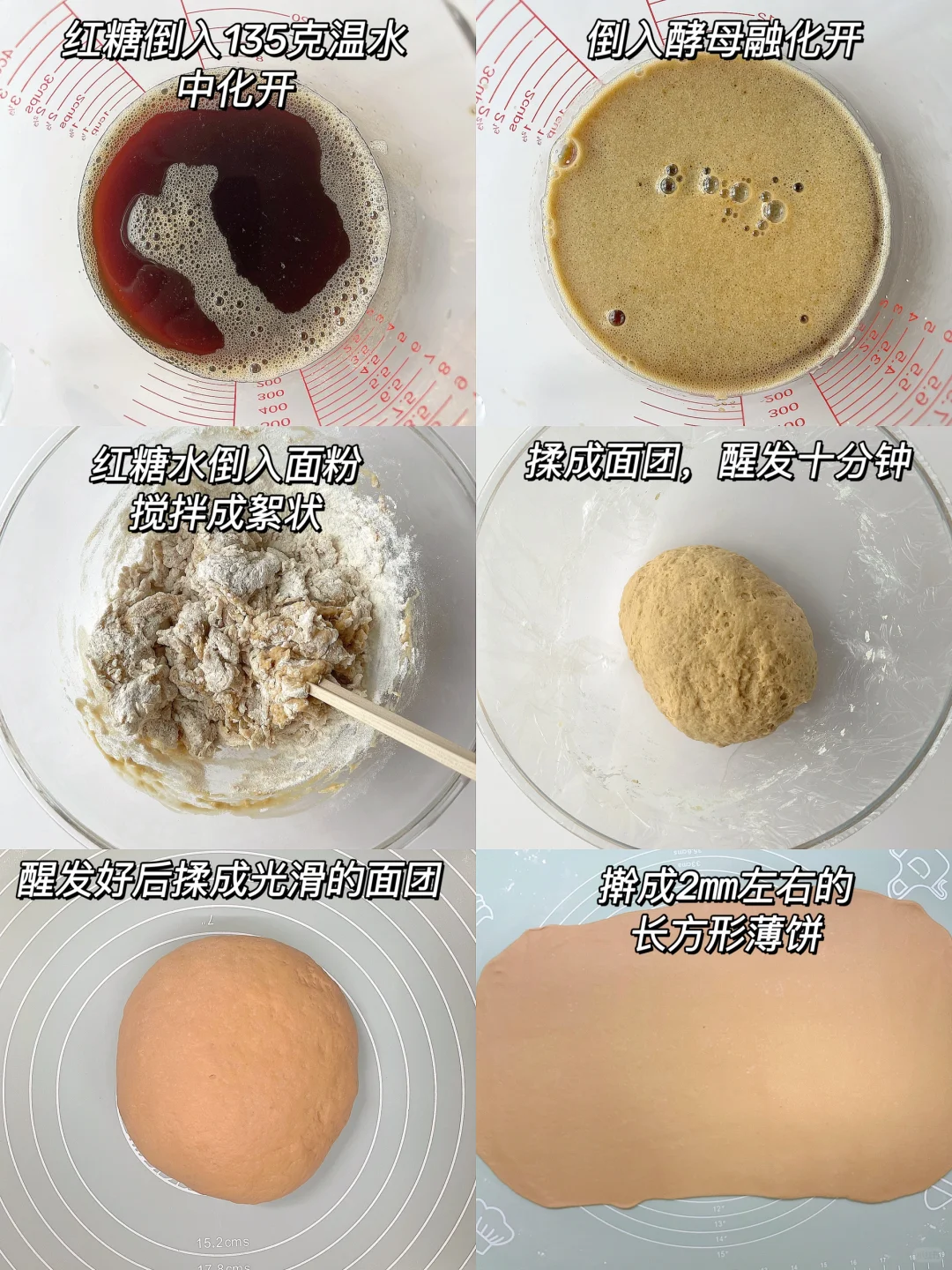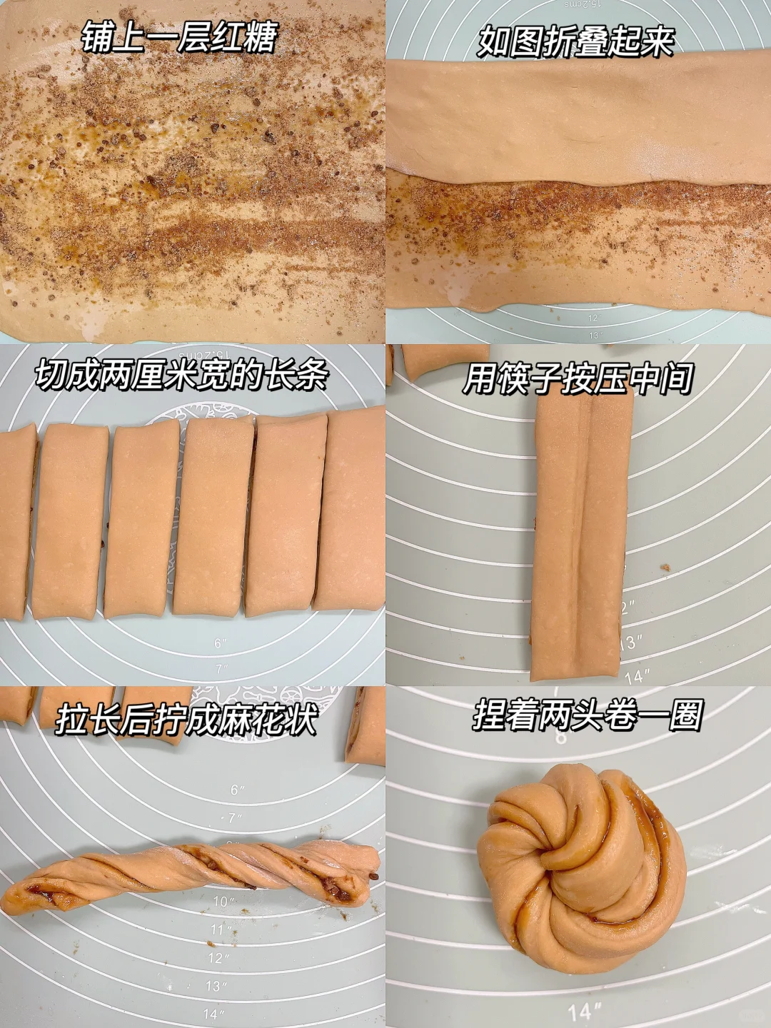 🌈暄软香甜的红糖花卷~ 🎈准备食材: 1️⃣面粉250克,红糖50克,温水135克,酵母3克; 🎈制作步骤: 1️⃣红糖倒入温水中化开,放入酵母完全融化; 2️⃣红糖水倒入面粉,边到边搅拌,搅拌成絮状后用手揉成面团,密封后醒10分钟,然后揉成光滑的面团; 3️⃣把面团擀成2㎜厚的长方形薄饼,铺上一层红糖,如图折叠起来,切成两厘米宽的长条,用筷子按压中间,拉长后拧成麻花状,捏着两头转一圈即可; 4️⃣花卷摆入蒸笼,盖上盖子发酵45-50分钟左右,两倍大这样,冷水上锅蒸15分钟闷两分钟。