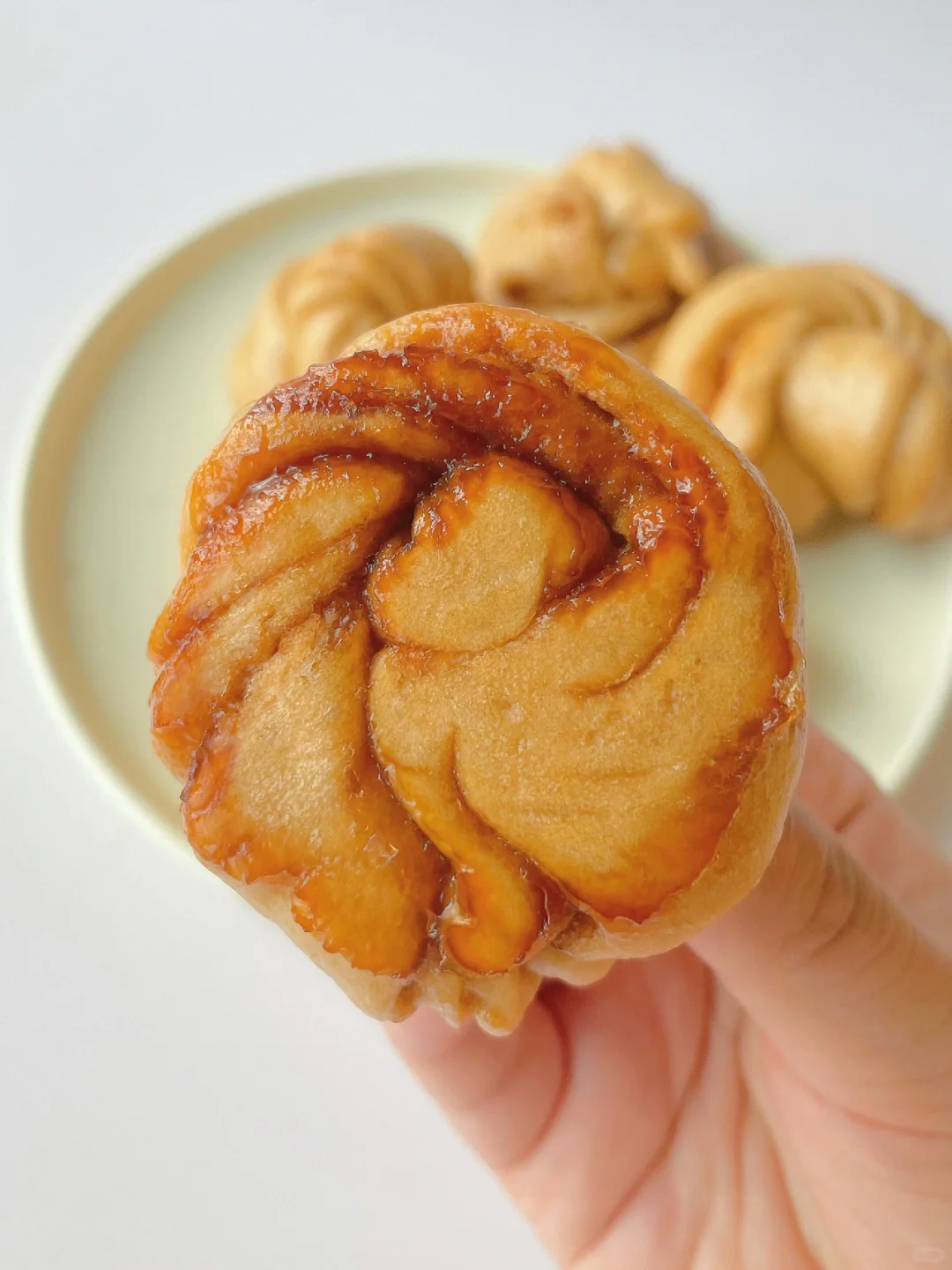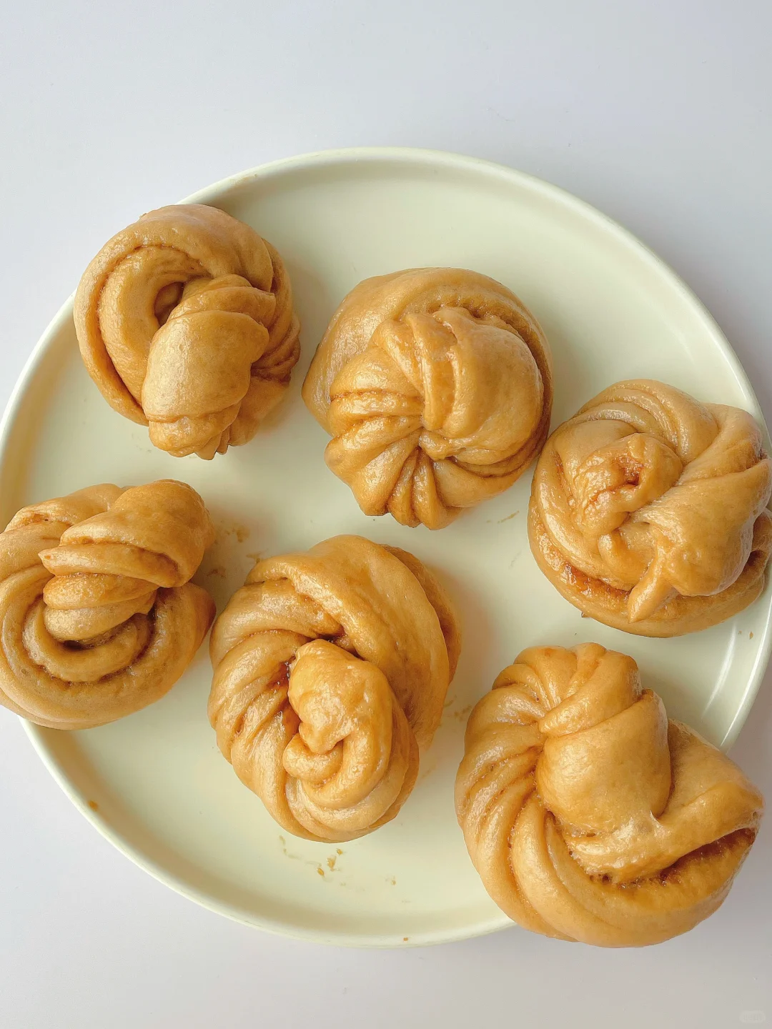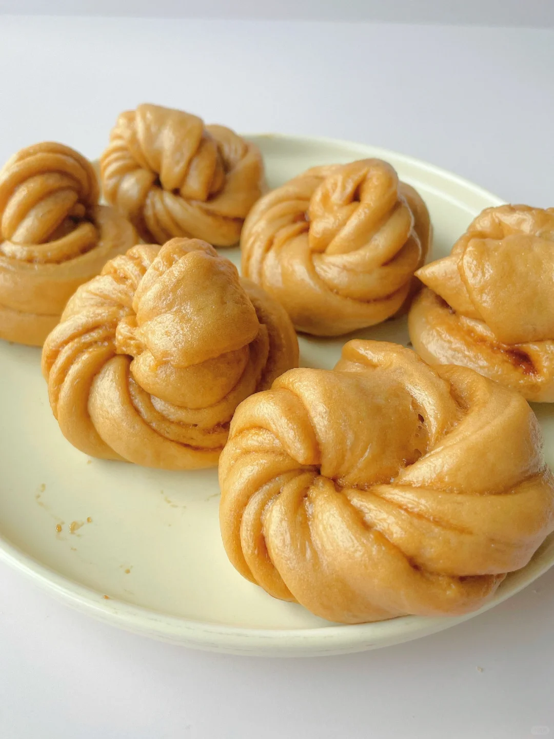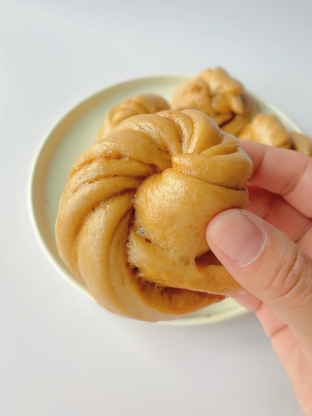 🌈暄软香甜的红糖花卷~ 🎈准备食材: 1️⃣面粉250克,红糖50克,温水135克,酵母3克; 🎈制作步骤: 1️⃣红糖倒入温水中化开,放入酵母完全融化; 2️⃣红糖水倒入面粉,边到边搅拌,搅拌成絮状后用手揉成面团,密封后醒10分钟,然后揉成光滑的面团; 3️⃣把面团擀成2㎜厚的长方形薄饼,铺上一层红糖,如图折叠起来,切成两厘米宽的长条,用筷子按压中间,拉长后拧成麻花状,捏着两头转一圈即可; 4️⃣花卷摆入蒸笼,盖上盖子发酵45-50分钟左右,两倍大这样,冷水上锅蒸15分钟闷两分钟。