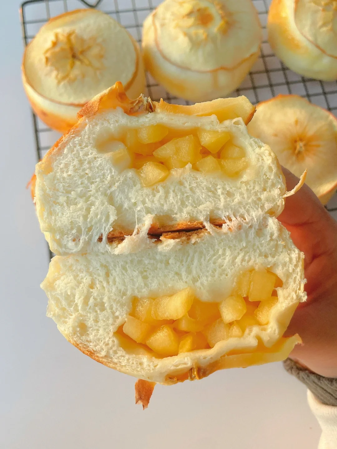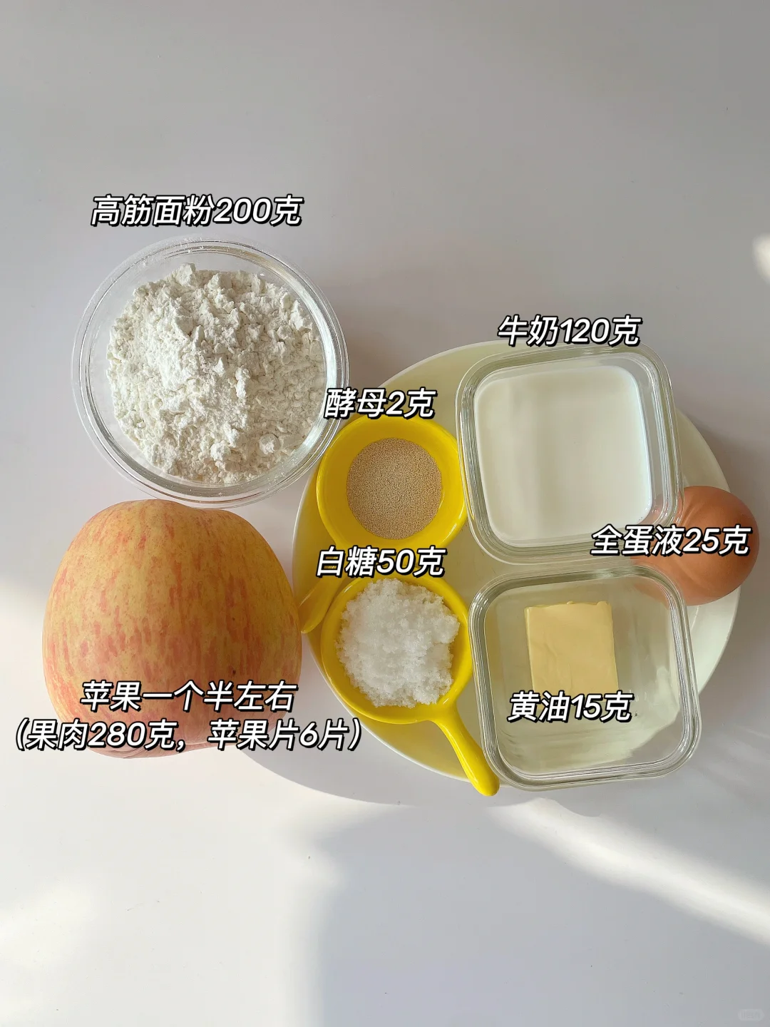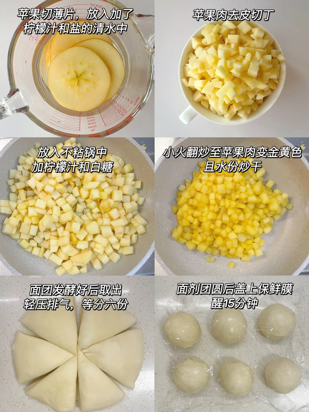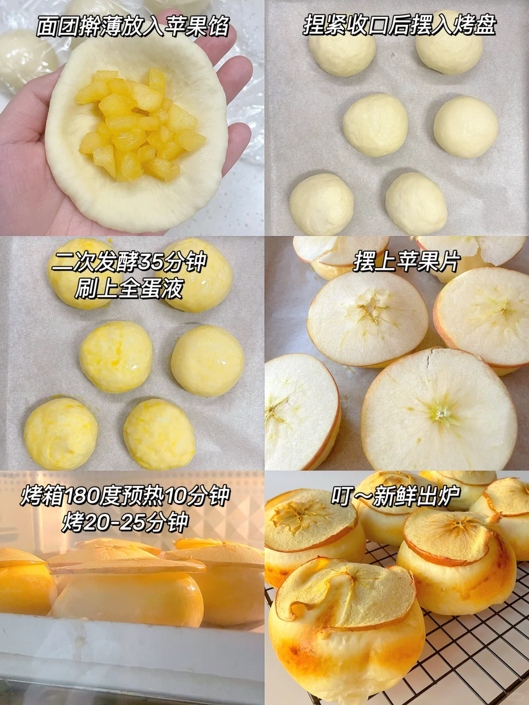 🌈酸甜可口的苹果馅搭配柔软的面包~ 🎈准备食材: 1️⃣面包:高筋面粉200克,酵母2克,糖20克,牛奶120克,全蛋液2克,盐1克,黄油15克; 2️⃣苹果馅:苹果肉280克,柠檬汁5克左右,糖30克; 🎈制作步骤: 1️⃣苹果切六片薄片,放入加了柠檬汁和盐的水中浸泡。苹果肉去皮切丁,加白糖和柠檬汁放入不粘锅中小火炒至果肉变成金黄色,切水份炒干 2️⃣除黄油和盐外所有面包食材倒入厨师机中,先打出粗膜,再倒入黄油和盐打出手套膜; 3️⃣面包整理团圆后盖上保鲜膜,放入温暖处发酵至两倍大,28度发酵一个小时左右; 4️⃣面团取出轻压排气,等分成六份,把面剂团圆后盖上保鲜膜醒15分钟,醒好后取出面剂擀成饼,放入苹果馅,收口捏紧摆入烤盘; 5️⃣盖上保鲜膜二次醒发38度35分钟,刷上全蛋液,放上苹果片,烤箱180度预热10分钟,烤20-25分钟即可。