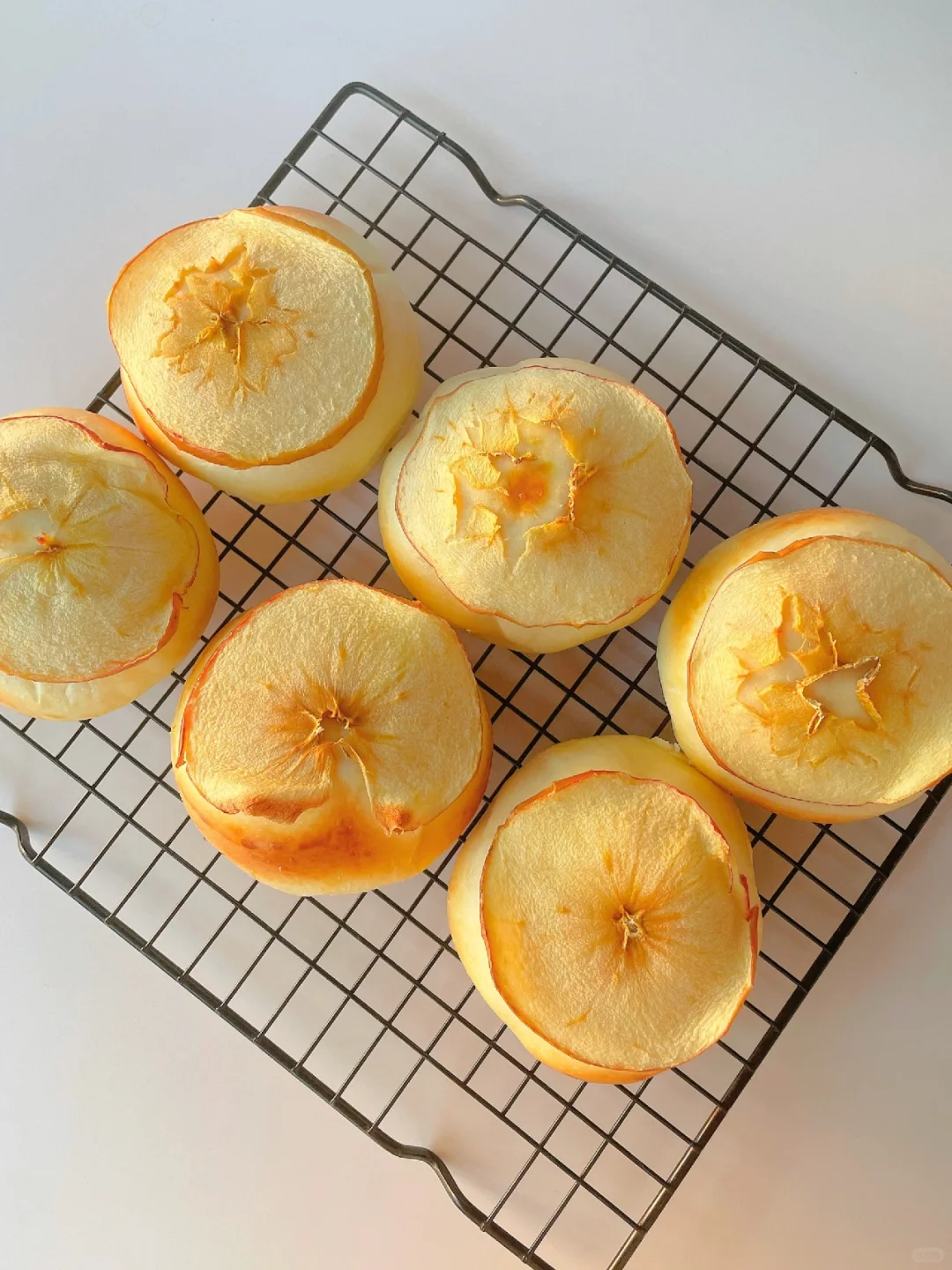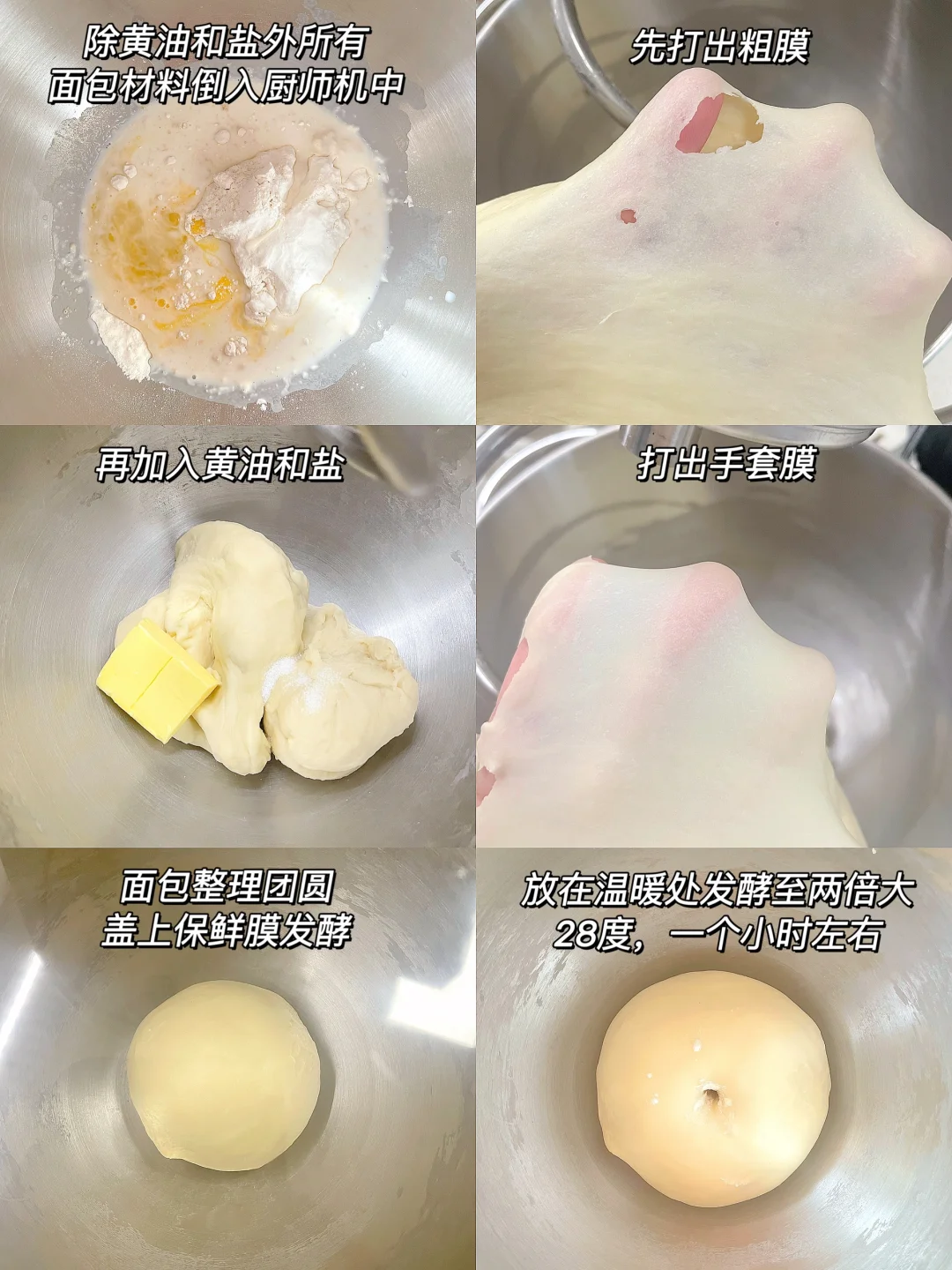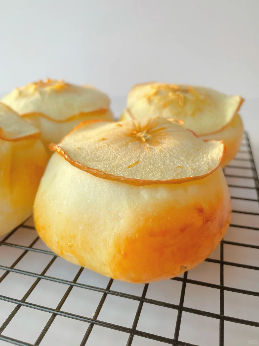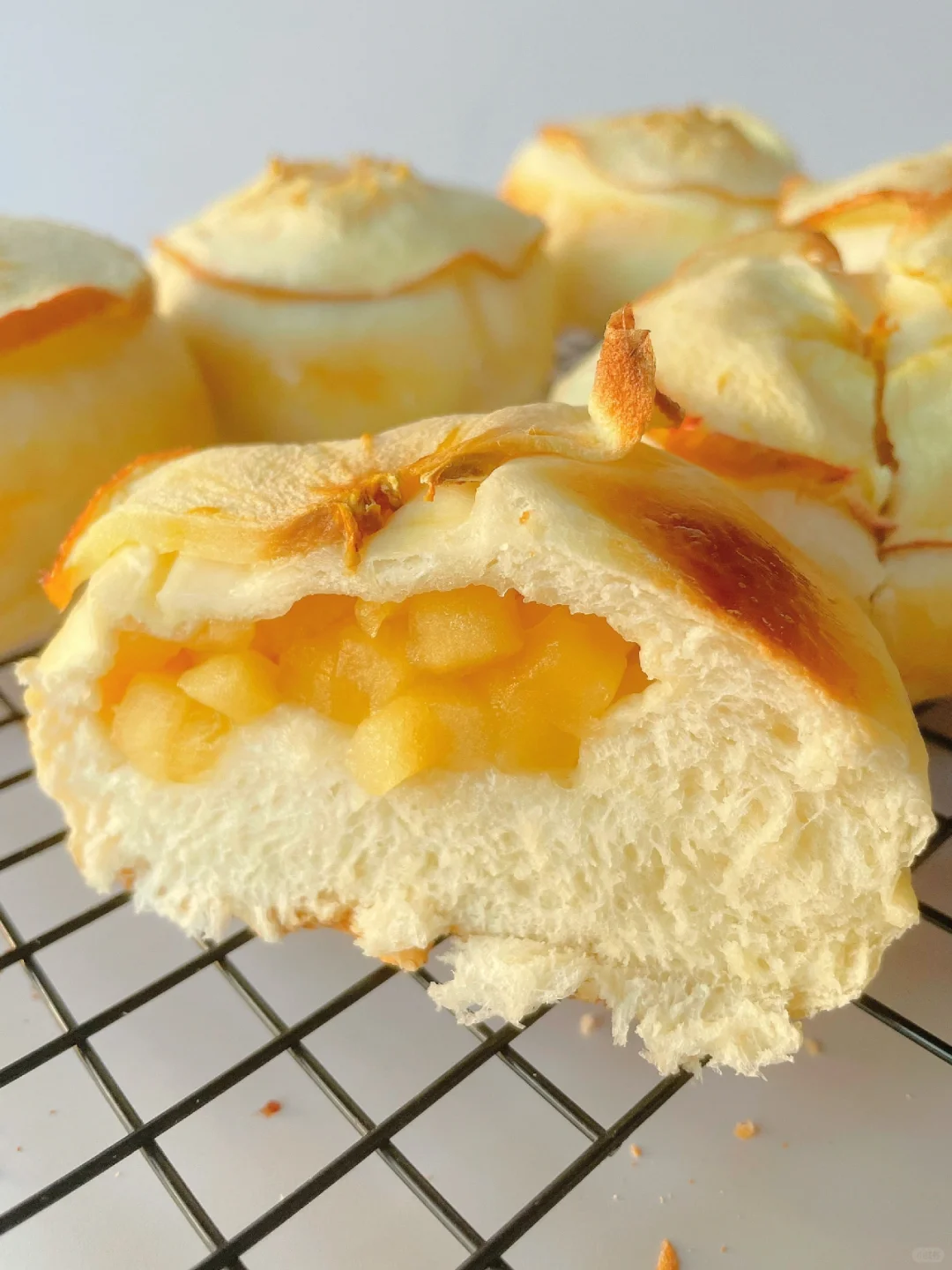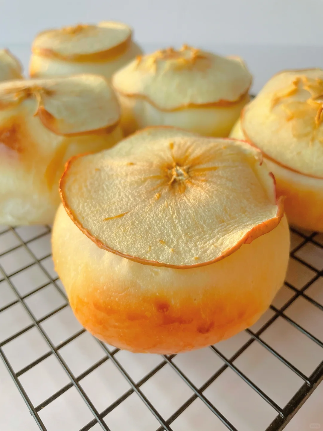 🌈酸甜可口的苹果馅搭配柔软的面包~ 🎈准备食材: 1️⃣面包:高筋面粉200克,酵母2克,糖20克,牛奶120克,全蛋液2克,盐1克,黄油15克; 2️⃣苹果馅:苹果肉280克,柠檬汁5克左右,糖30克; 🎈制作步骤: 1️⃣苹果切六片薄片,放入加了柠檬汁和盐的水中浸泡。苹果肉去皮切丁,加白糖和柠檬汁放入不粘锅中小火炒至果肉变成金黄色,切水份炒干 2️⃣除黄油和盐外所有面包食材倒入厨师机中,先打出粗膜,再倒入黄油和盐打出手套膜; 3️⃣面包整理团圆后盖上保鲜膜,放入温暖处发酵至两倍大,28度发酵一个小时左右; 4️⃣面团取出轻压排气,等分成六份,把面剂团圆后盖上保鲜膜醒15分钟,醒好后取出面剂擀成饼,放入苹果馅,收口捏紧摆入烤盘; 5️⃣盖上保鲜膜二次醒发38度35分钟,刷上全蛋液,放上苹果片,烤箱180度预热10分钟,烤20-25分钟即可。