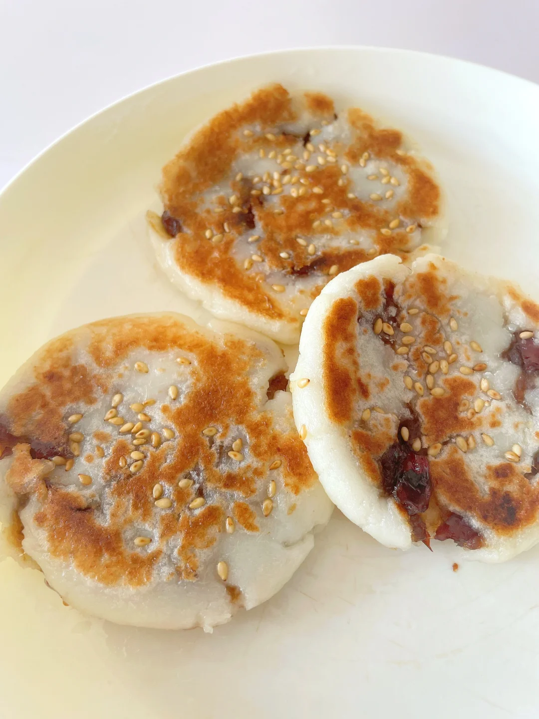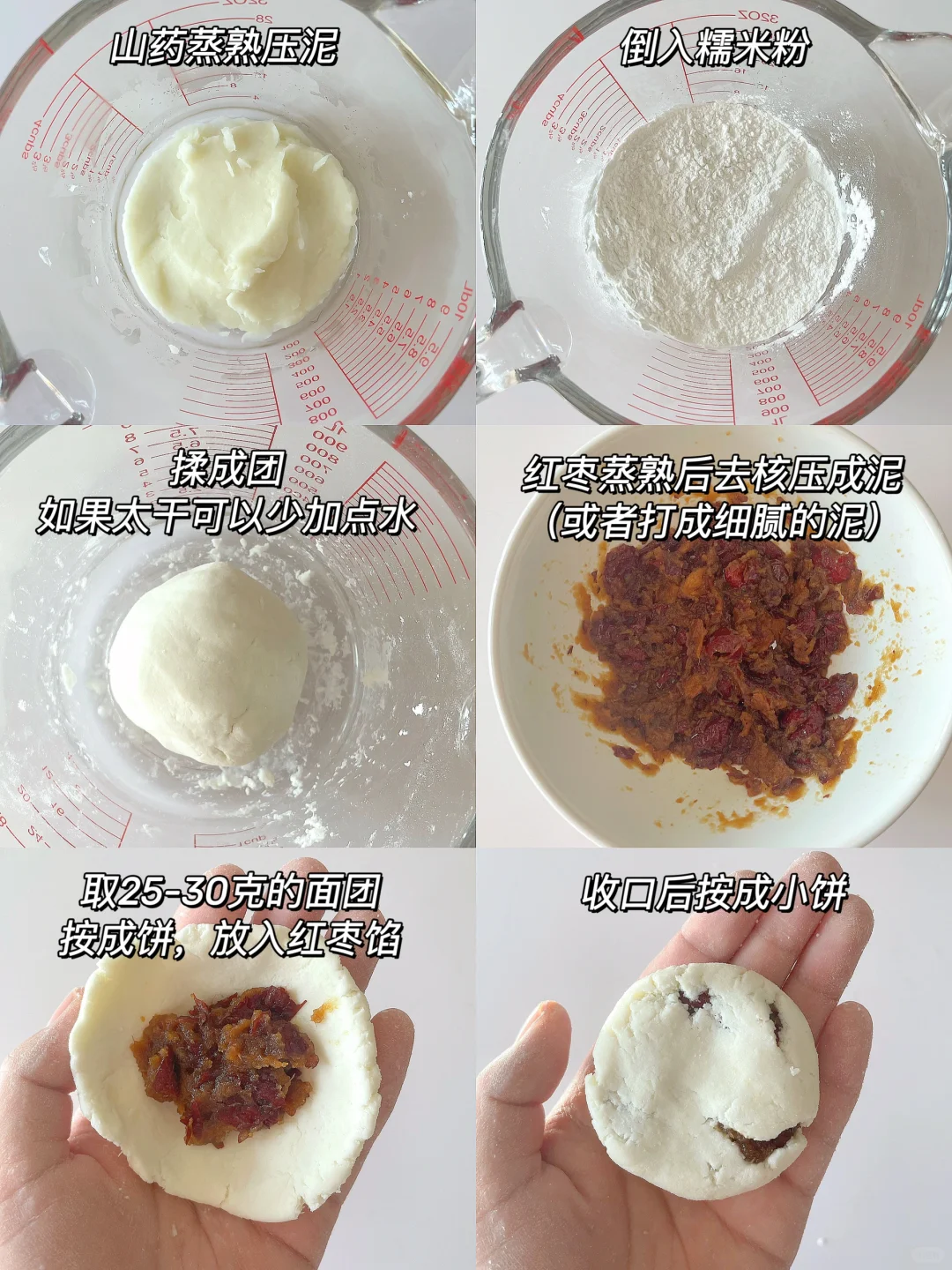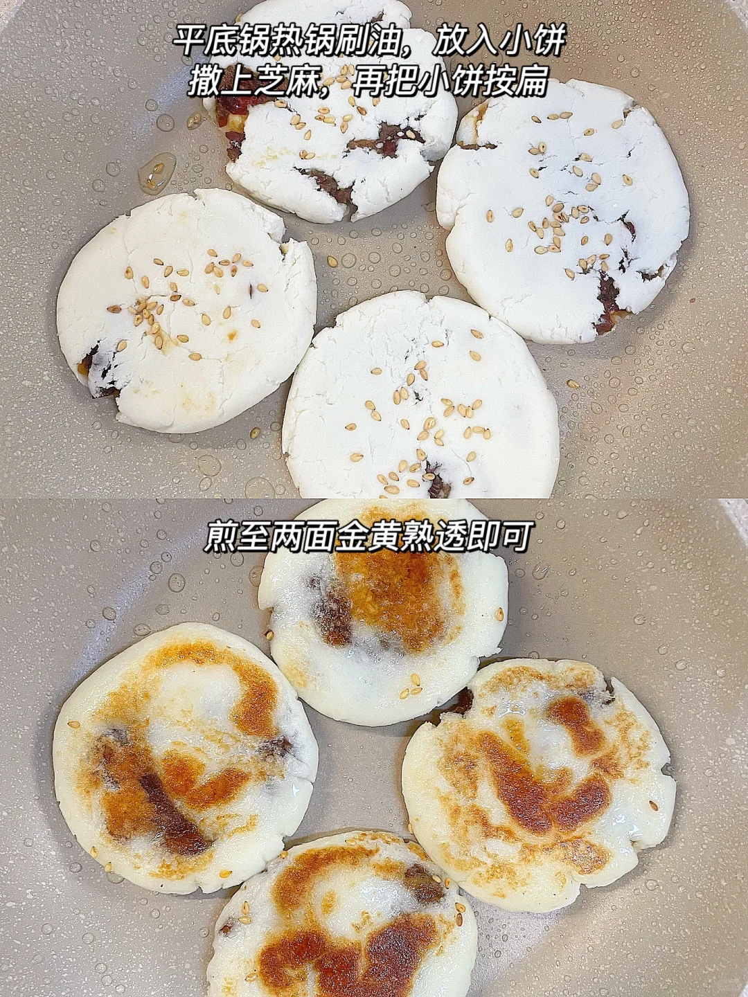 🌈软糯香甜的小饼,不用加糖也甜甜的~ 🎈准备食材: 1️⃣铁棍山药(去皮)100克,糯米粉50克,红枣适量; 🎈制作步骤: 1️⃣山药去皮切断,蒸熟压泥,倒入糯米粉,揉成面团,太干的话可以加点水; 2️⃣红枣洗净蒸熟,去核加点温水压成泥,或者可以放入料理机打成细腻的泥; 3️⃣取25克的面团,用掌心压成饼,放入适量红枣馅,收口后压扁; 4️⃣平底锅热锅刷油,放入小饼,撒上白芝麻,小火煎至两面金黄熟透即可~