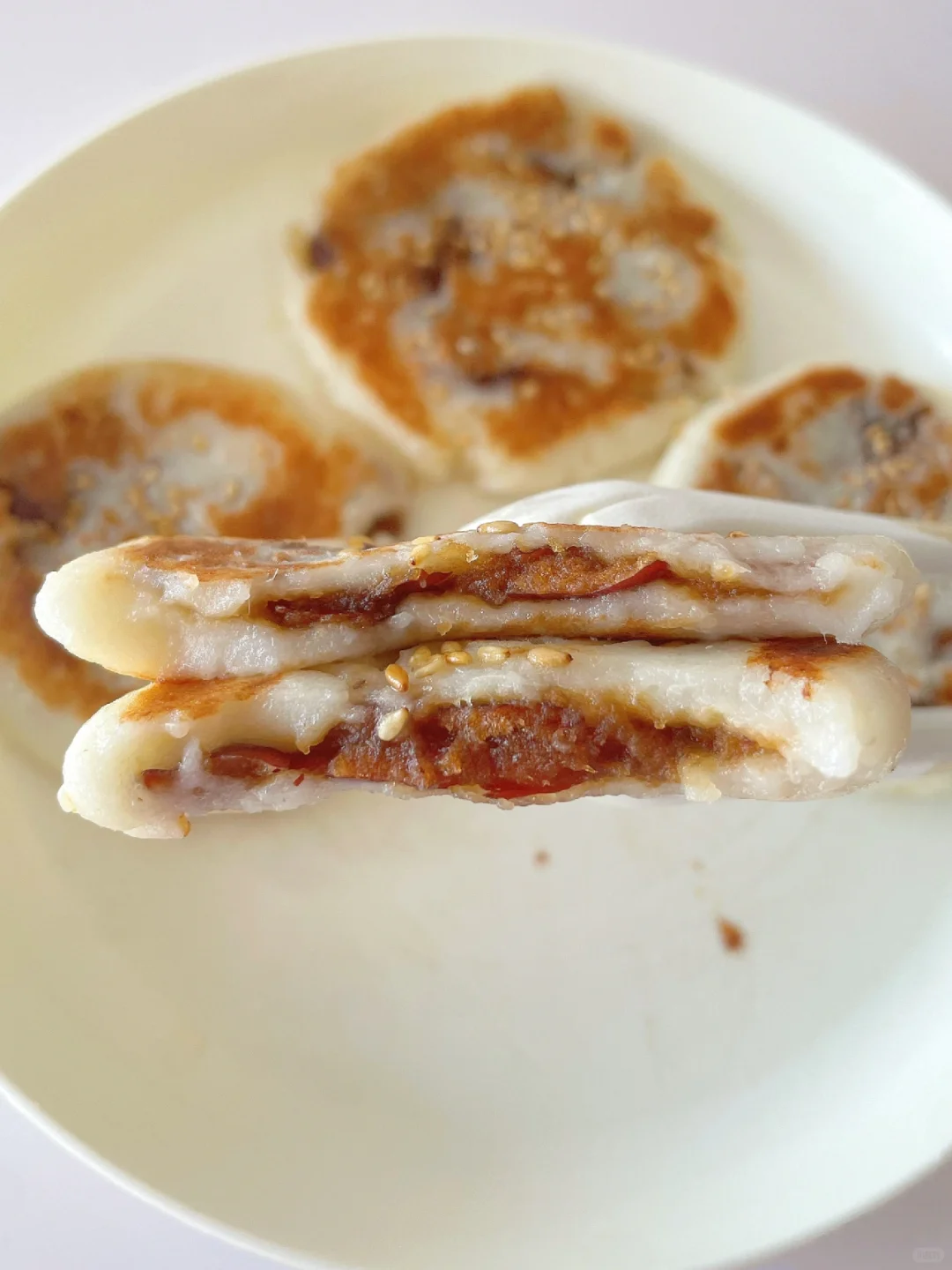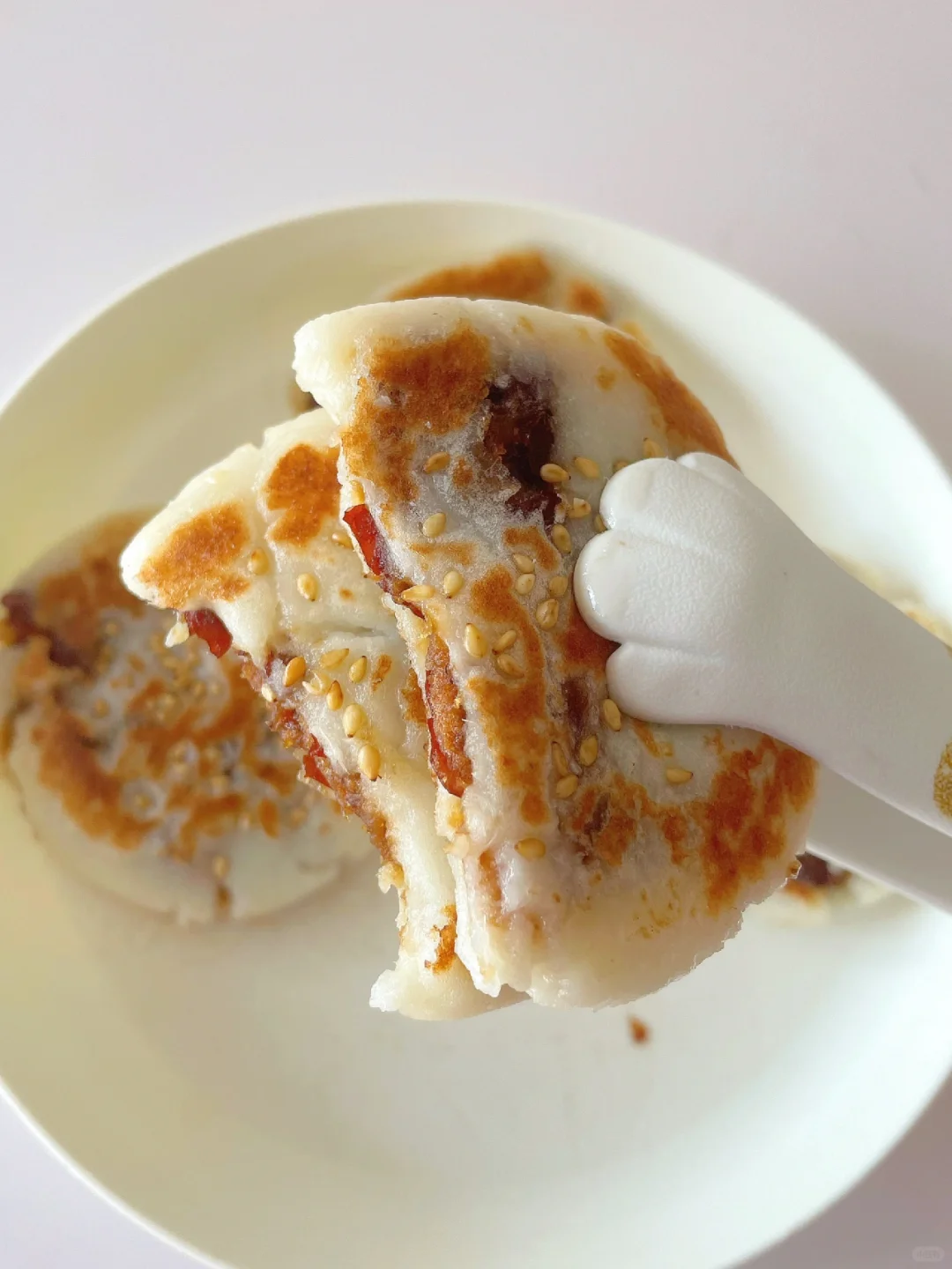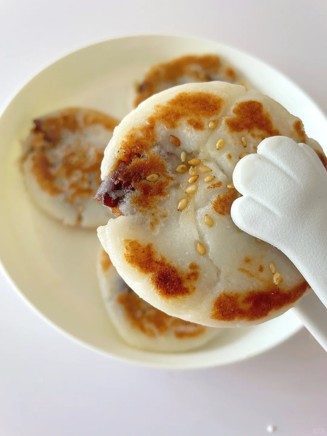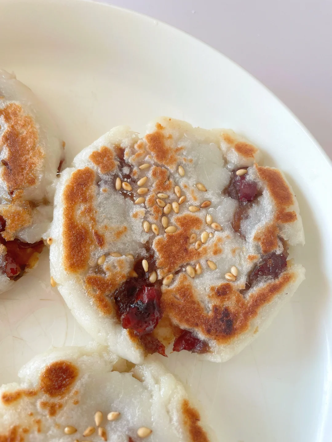 🌈软糯香甜的小饼,不用加糖也甜甜的~ 🎈准备食材: 1️⃣铁棍山药(去皮)100克,糯米粉50克,红枣适量; 🎈制作步骤: 1️⃣山药去皮切断,蒸熟压泥,倒入糯米粉,揉成面团,太干的话可以加点水; 2️⃣红枣洗净蒸熟,去核加点温水压成泥,或者可以放入料理机打成细腻的泥; 3️⃣取25克的面团,用掌心压成饼,放入适量红枣馅,收口后压扁; 4️⃣平底锅热锅刷油,放入小饼,撒上白芝麻,小火煎至两面金黄熟透即可~