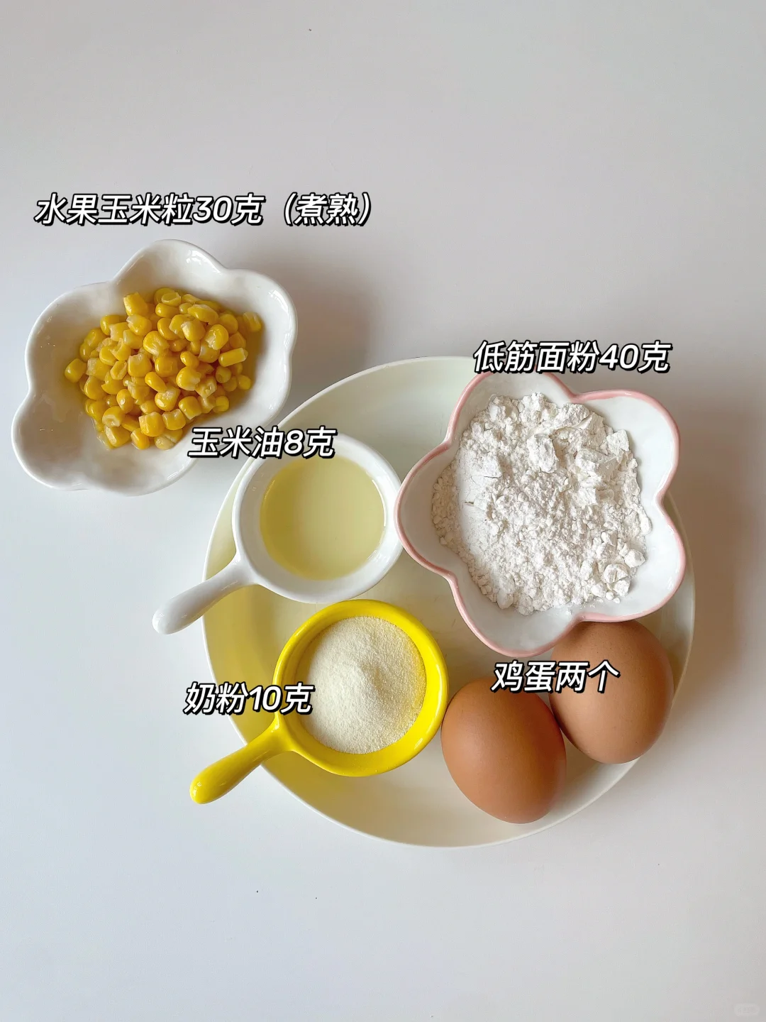 1️⃣煮熟的水果玉米粒30克,玉米油8克,鸡蛋两个,奶粉10克,低筋面粉40克;