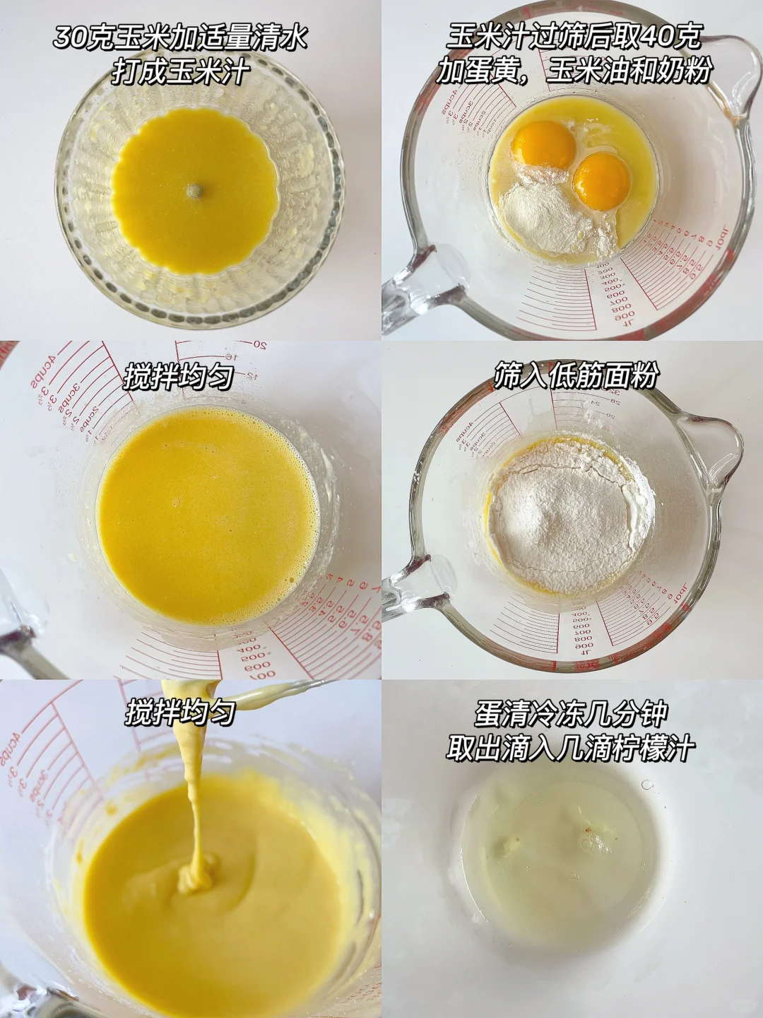 1️⃣玉米粒加水打成汁,过筛后取40克加玉米油、蛋黄和奶粉搅拌均匀,再筛入低筋面粉搅拌均匀;