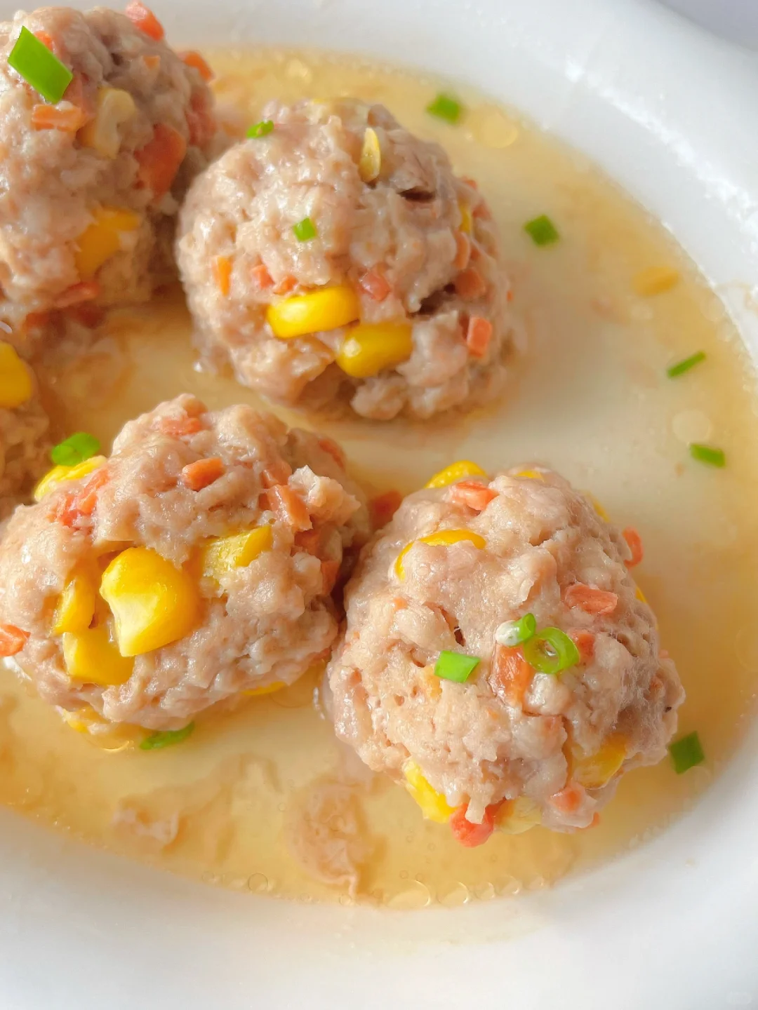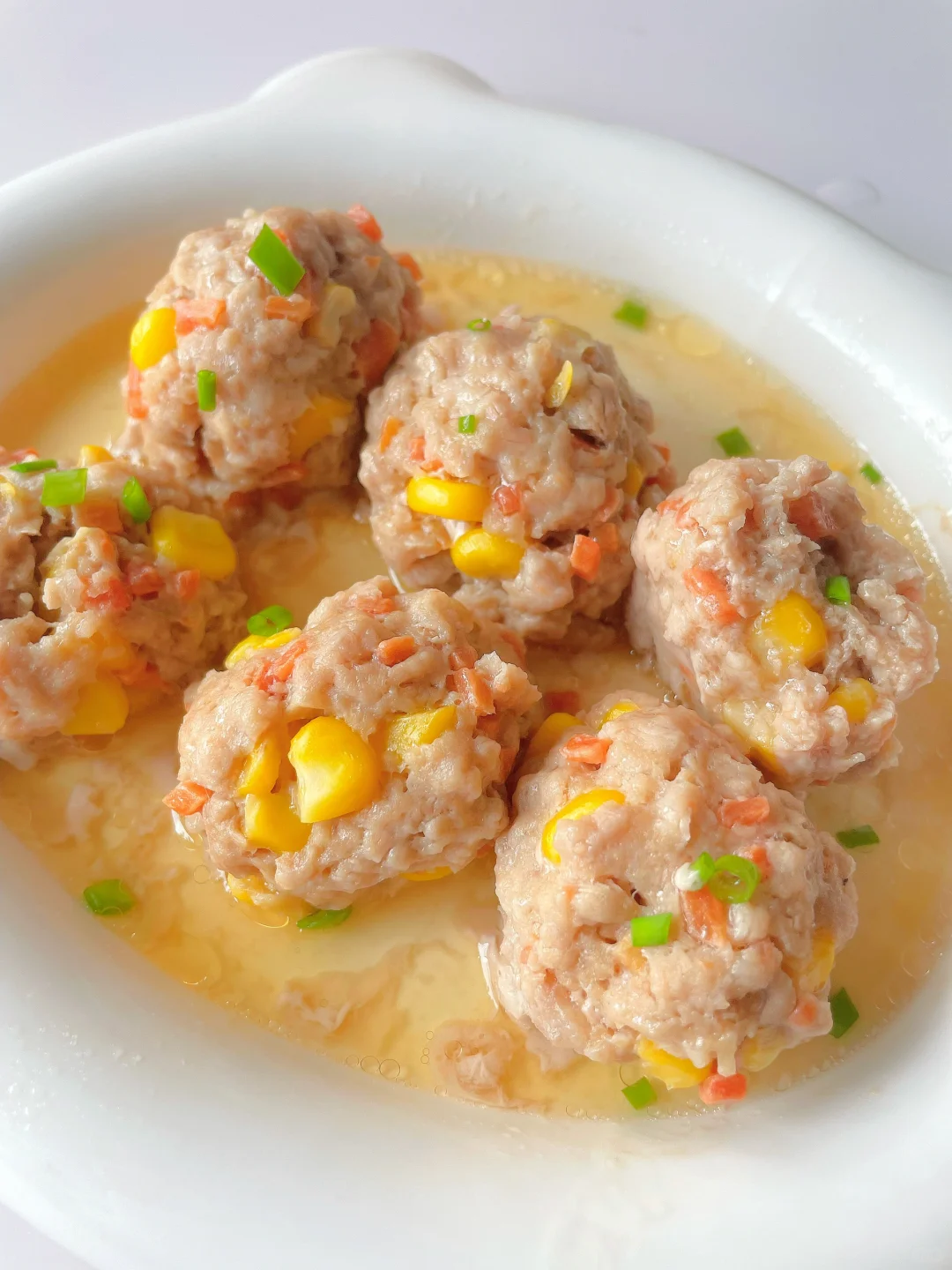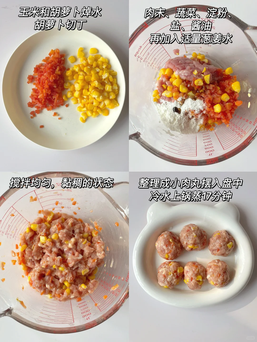 🌈柔软多汁又清甜的小肉丸~ 🎈准备食材: 1️⃣猪肉末150克(最好带点肥肉),水果玉米粒50克,胡萝卜适量,淀粉15克; 🎈制作步骤: 1️⃣玉米粒和胡萝卜焯水,再把胡萝卜切丁; 2️⃣猪肉末、蔬菜、淀粉、盐和酱油都倒入碗中,葱姜水少量多次添加,搅拌均匀,最后是黏稠的状态; 3️⃣肉馅整理成小肉丸摆入盘中,冷水上锅蒸17分钟左右,出锅时可以撒少许葱花增香。