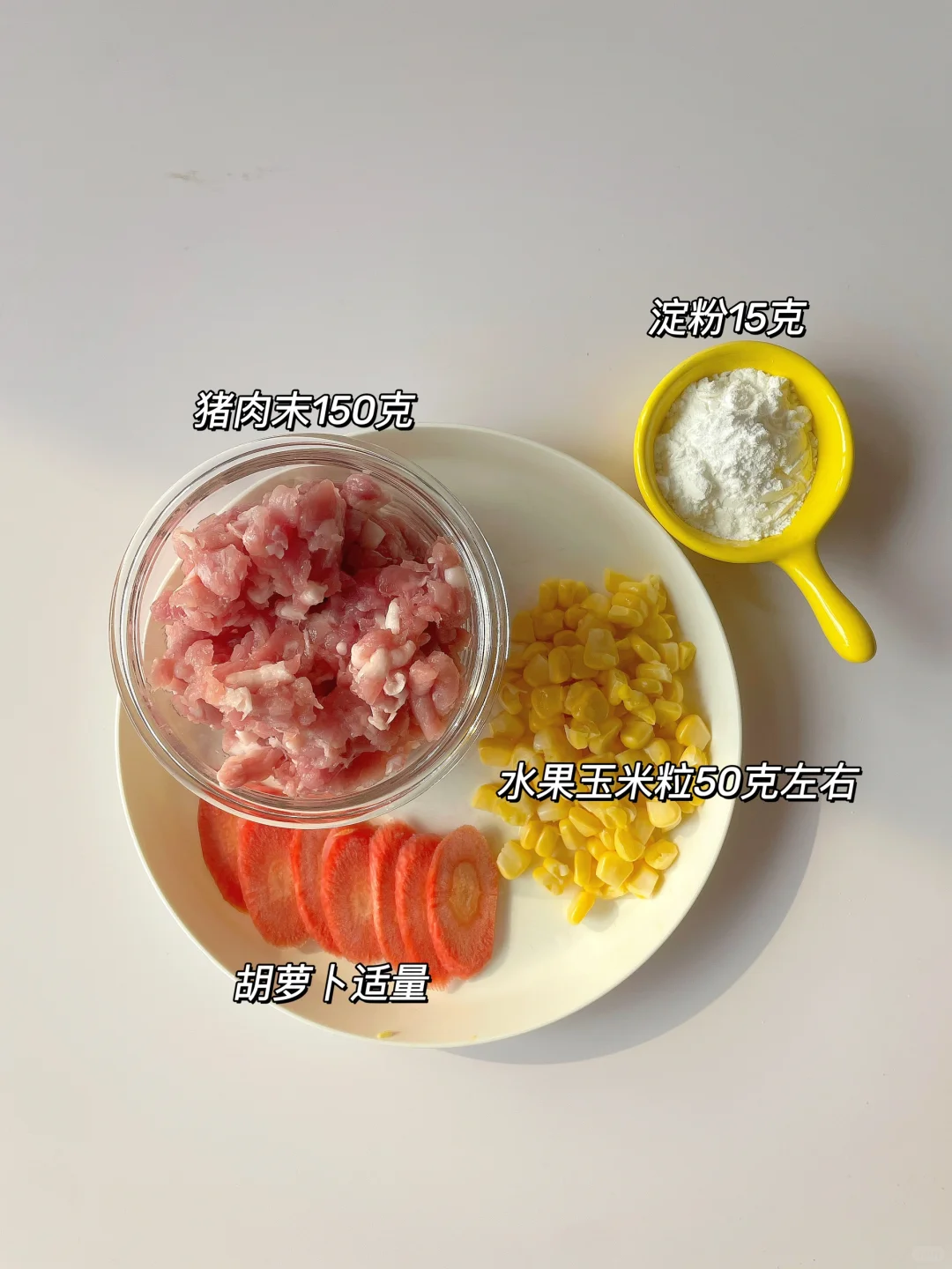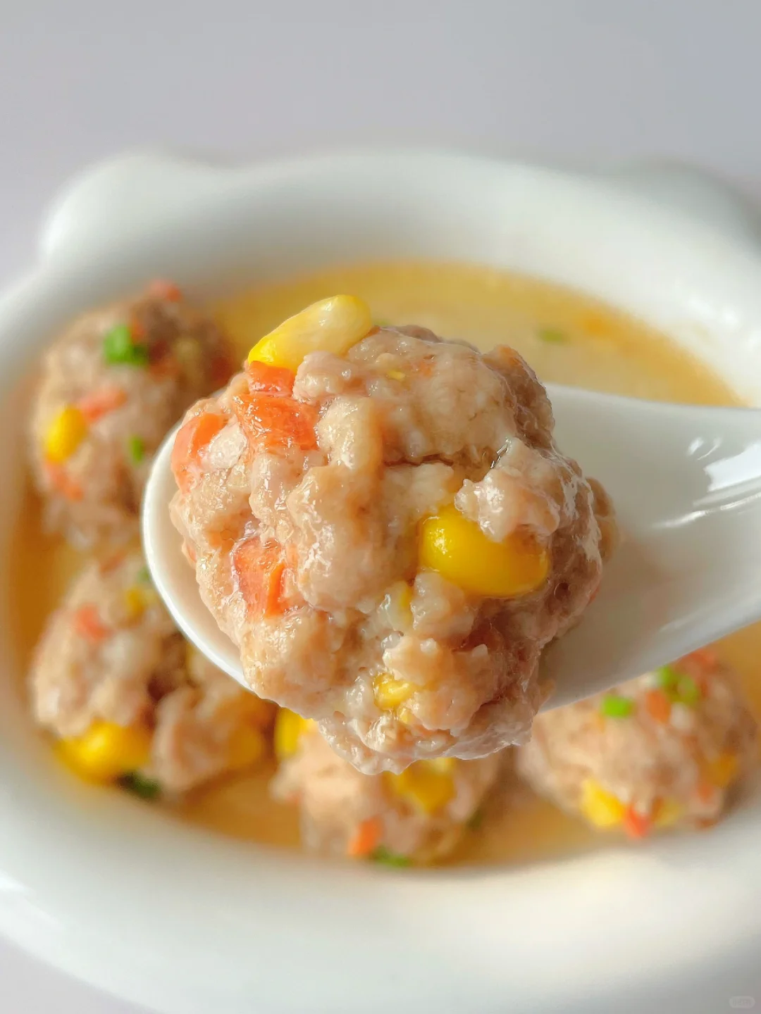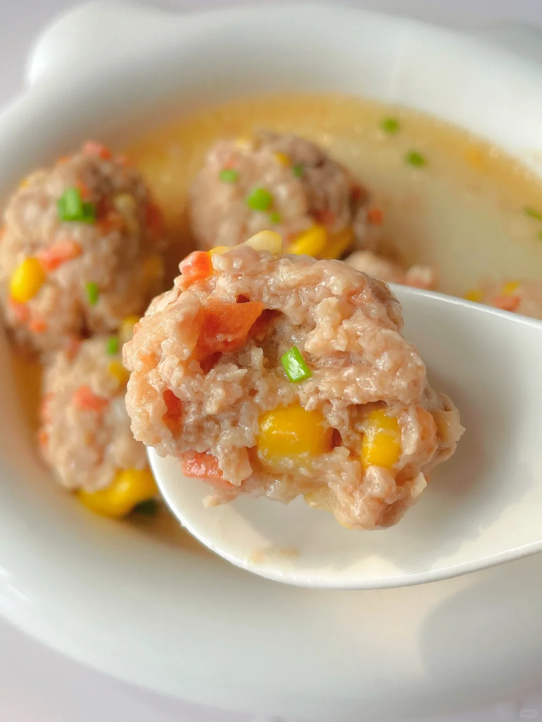 🌈柔软多汁又清甜的小肉丸~ 🎈准备食材: 1️⃣猪肉末150克(最好带点肥肉),水果玉米粒50克,胡萝卜适量,淀粉15克; 🎈制作步骤: 1️⃣玉米粒和胡萝卜焯水,再把胡萝卜切丁; 2️⃣猪肉末、蔬菜、淀粉、盐和酱油都倒入碗中,葱姜水少量多次添加,搅拌均匀,最后是黏稠的状态; 3️⃣肉馅整理成小肉丸摆入盘中,冷水上锅蒸17分钟左右,出锅时可以撒少许葱花增香。
