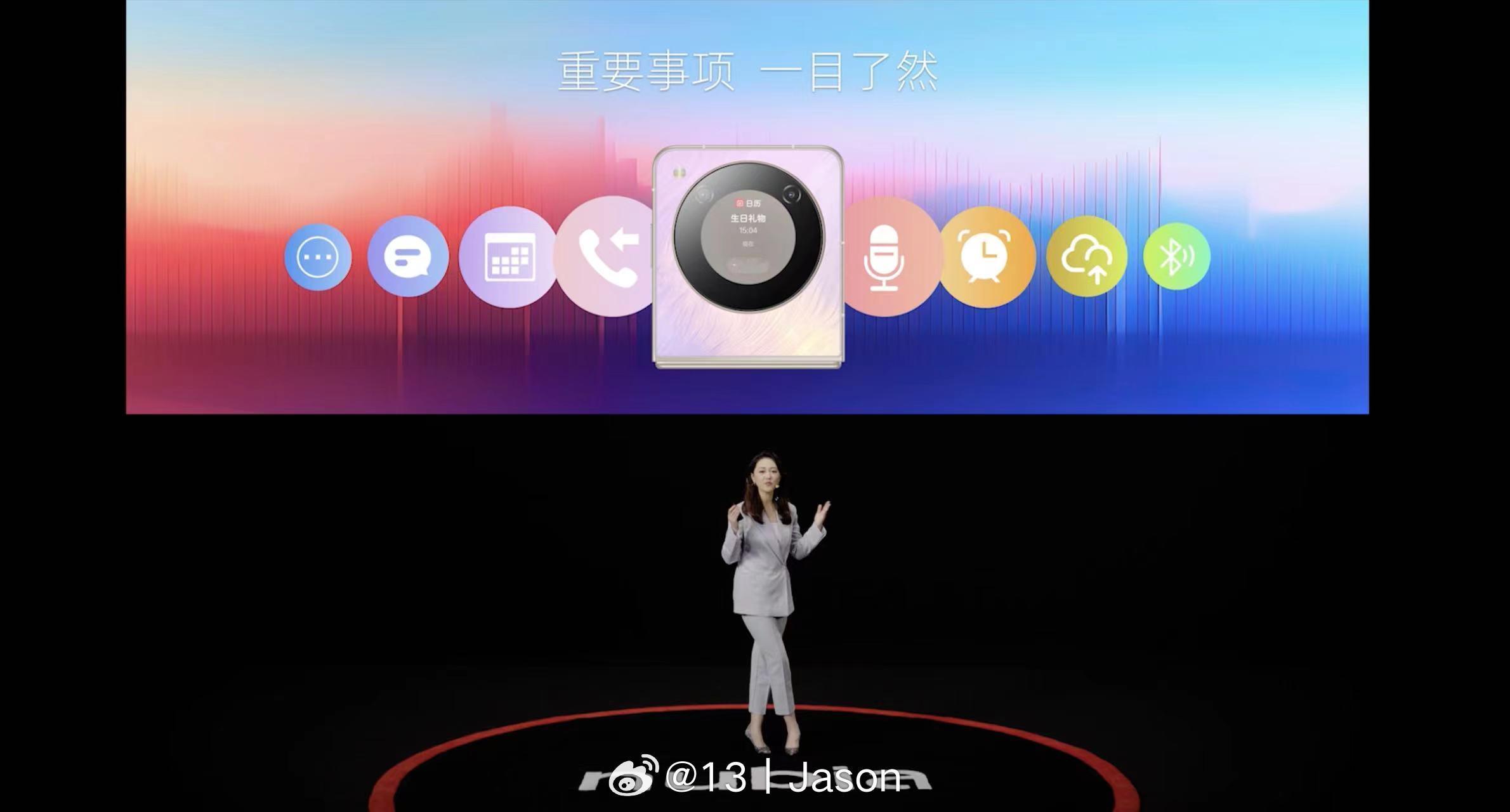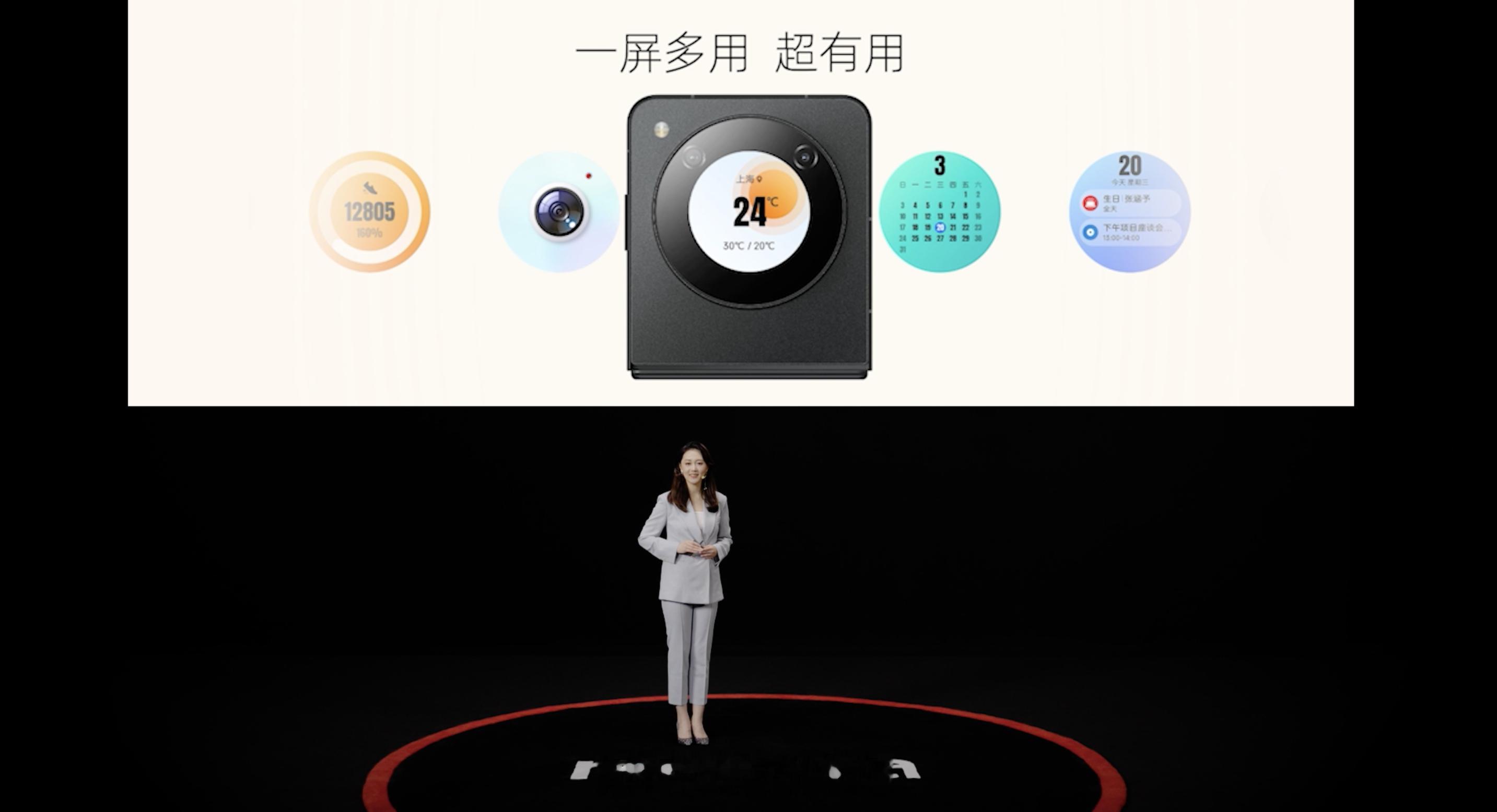 圆形影像模组中间,是一块圆形的外屏,外屏生态的营造和功能支持得比较全面,,无需开屏即可拍照、听歌、查看天气等,各种通知消息及来电也能通过外屏直接显示和操作。