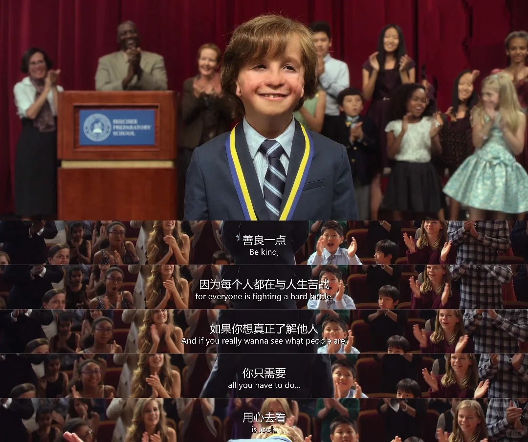 该片围绕面部畸形的小男孩奥吉(雅各布·特伦布莱饰)入学普通学校展开,最后在毕业典礼上,校长宣布奥吉荣获亨利·沃德·比彻奖,表彰他以勇气、善良影响了整个校园。奥吉走上台,面对全校师生,他以真诚的话语感谢家人、朋友和所有接纳他的人。他的话语触动了每一个人的心弦,现场爆发出热烈的掌声。这一场景展现了奥吉从被孤立到被接纳、被尊敬的转变,有力地证明了内在品质远胜外在表象!