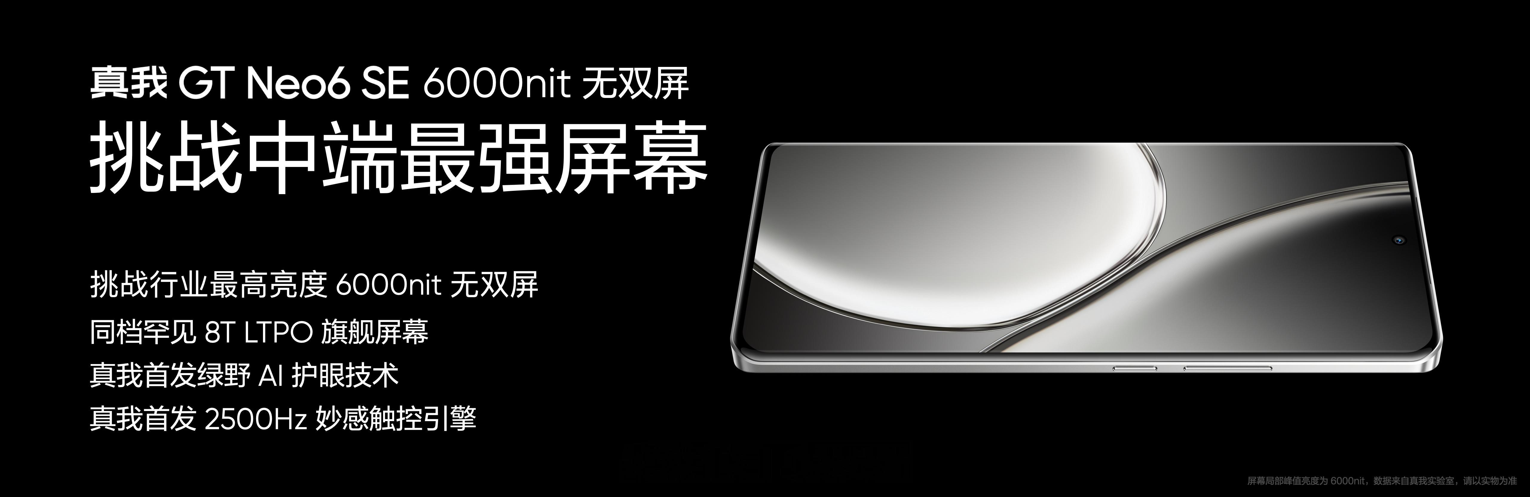 首先是屏幕,realme × 京东方联合打造了新一代无双屏。6000nit 的最高激发亮度,1000nit 的手动激发亮度,8T LTPO,2500Hz 妙感触控引擎……