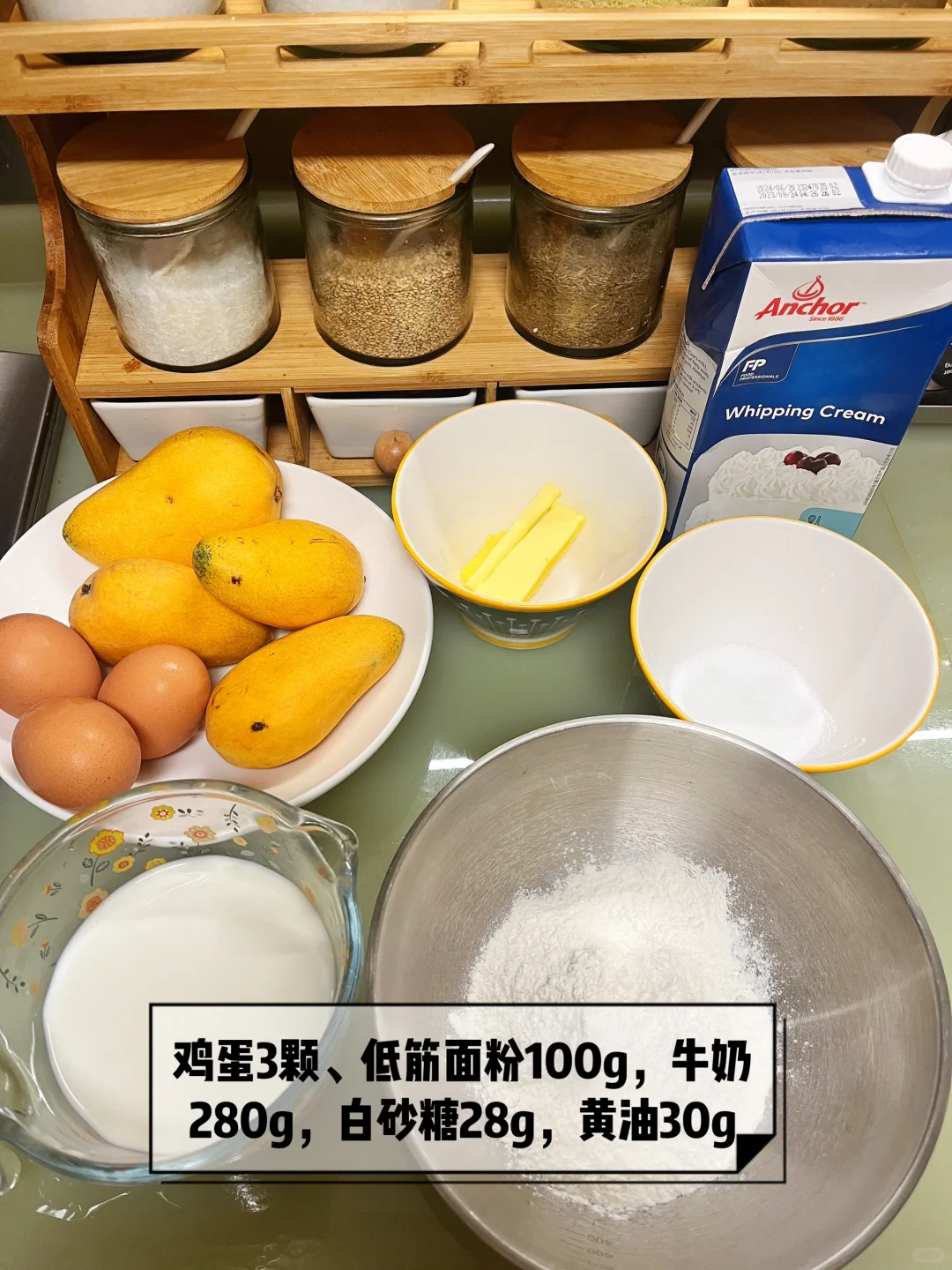 5️⃣奶油打发、芒果切成小块
