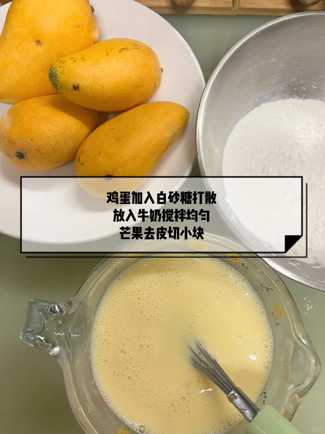 1️⃣3个鸡蛋加入28g糖打散,再加280g牛奶搅拌均匀