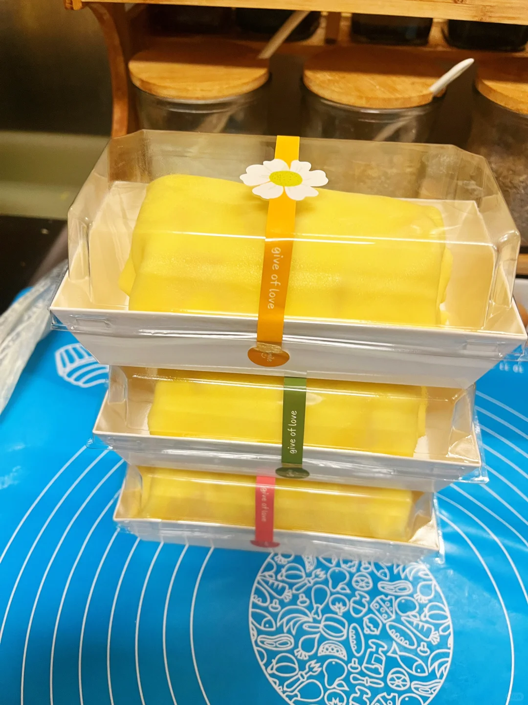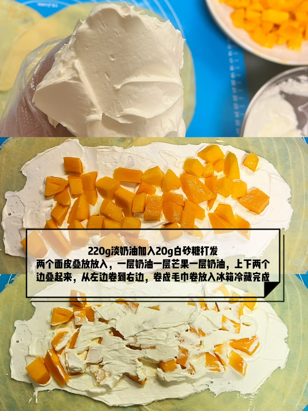 6️⃣两个面皮叠放,先铺一层奶油,再放一层芒果,再再来一层奶油卷起来就完成啦[派对R][派对R][派对R]