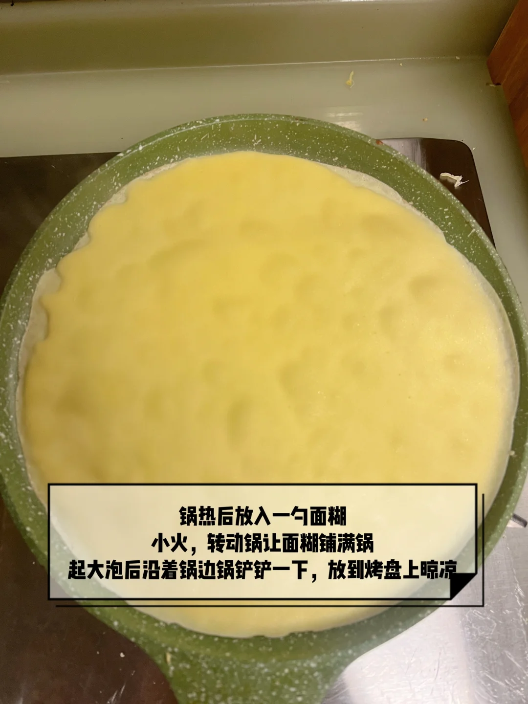 4️⃣小火锅热放入面糊,转动锅均匀铺满,面皮起大泡沿着锅边翘边一圈,将面饼倒在烤盘上晾凉
