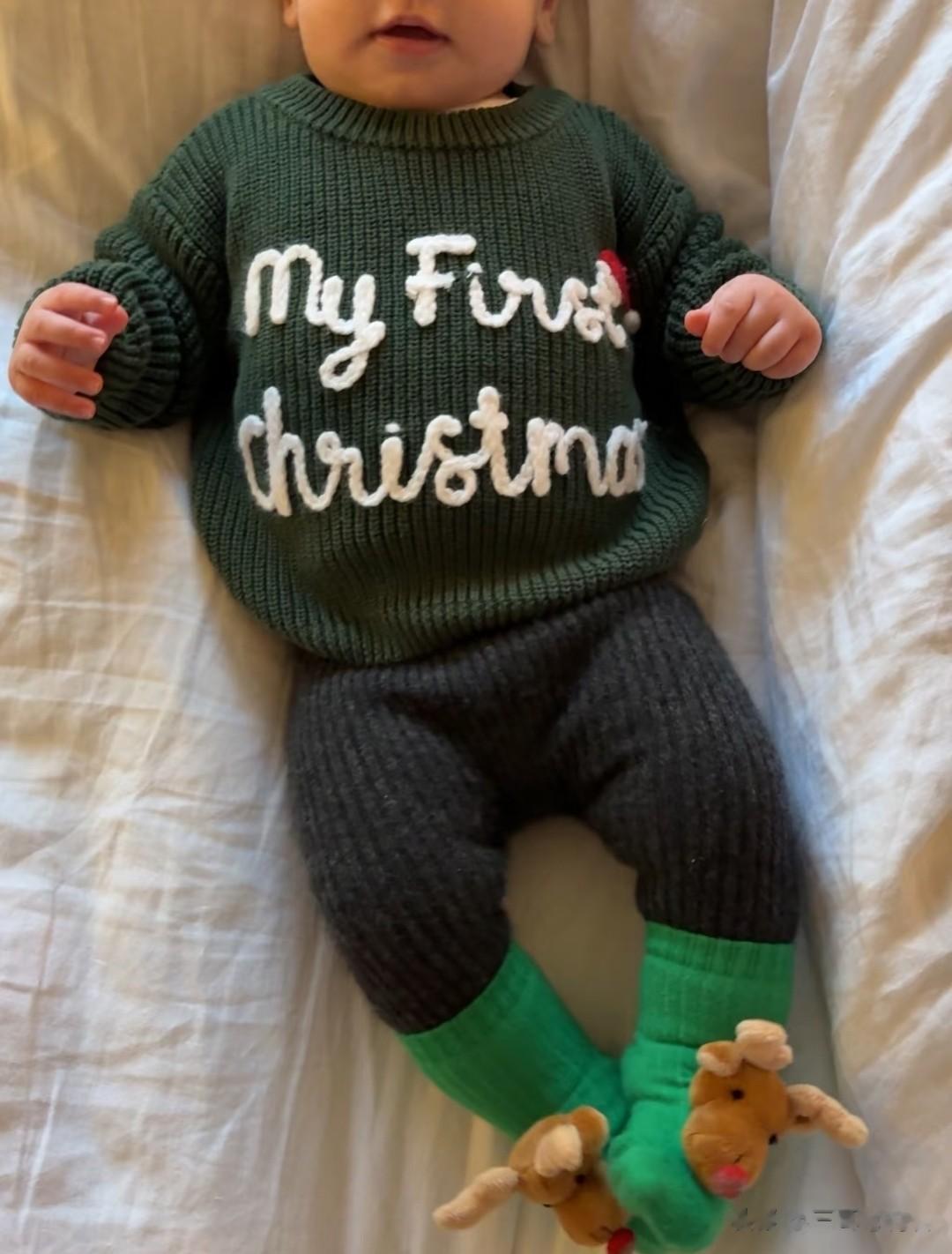 Brooklyn圆滚滚的脸蛋肉嘟嘟的,深邃的五官轮廓与稀疏的褐色头发,混血感十足,耳朵也非常大,又萌又可爱。