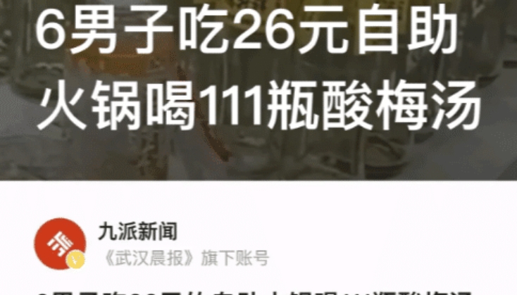 陕西西安,6个大老爷们去吃自助餐时,觉得酸梅汤的味道不错,也为了吃回本,便一口气喝了111瓶酸梅汤。店家表示,自助餐每人26元,包括水果、饮料、菜品都是免费的,看到6个人喝了这么多,觉得非常不可思议。