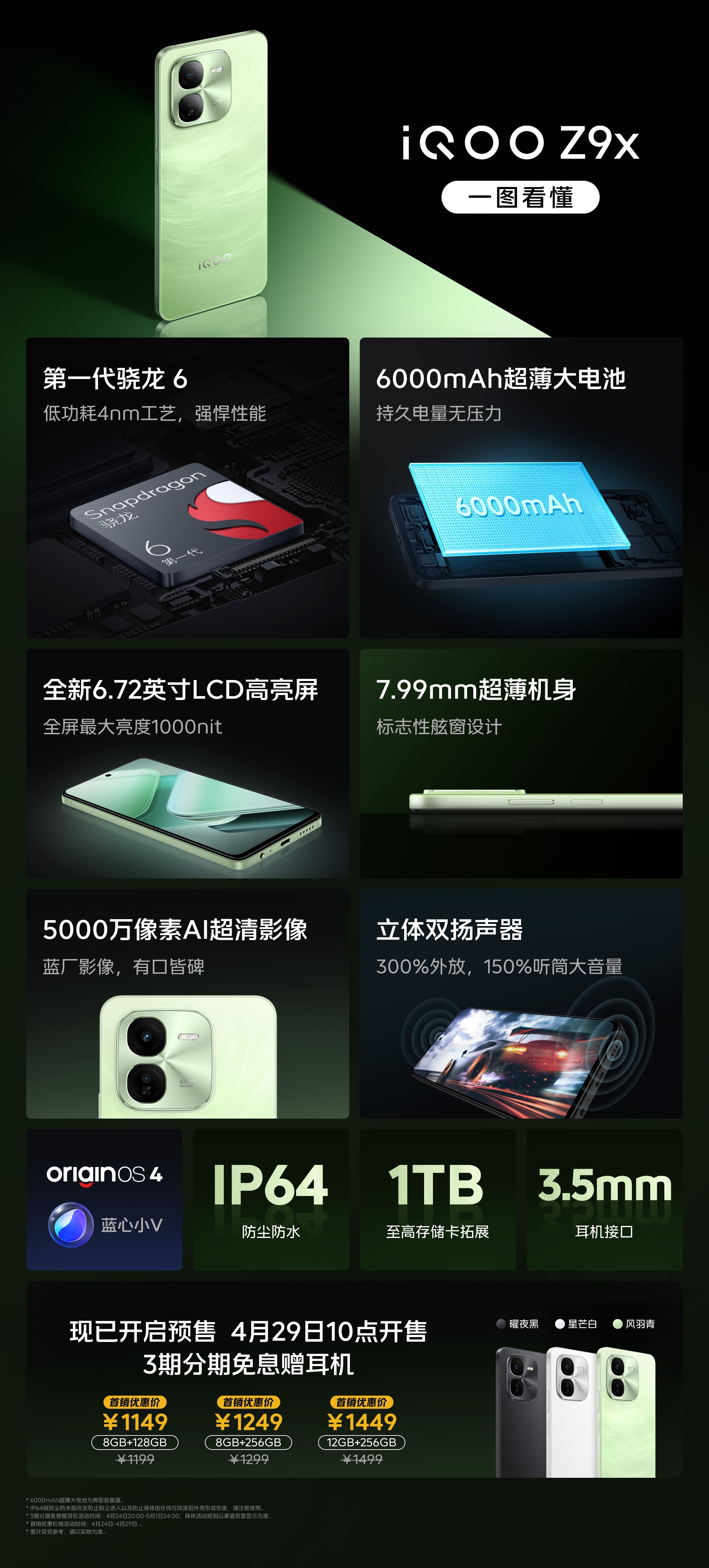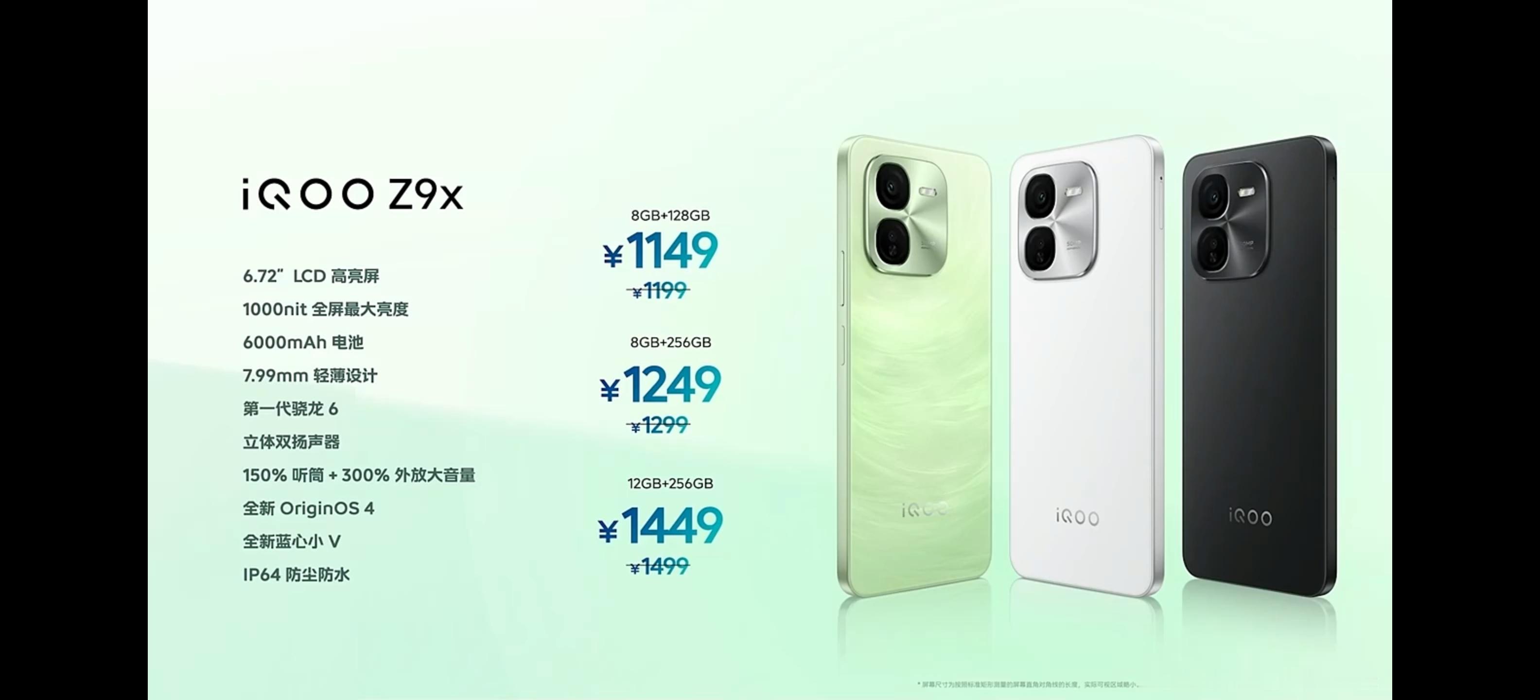 iQOO Z9x正式发布,1149元起,配备6.72英寸LCD高亮屏,支持120Hz七挡变速,内置6000mAh大电池。
