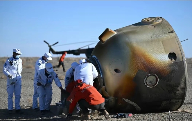 咱们17是上午08:43离开太空大别墅的,搭载三人和少量货物,采用6圈返回模式,返回舱于下午17:46伞降着陆东风着陆场(图3-4),整个下行过程耗时9小时03分钟