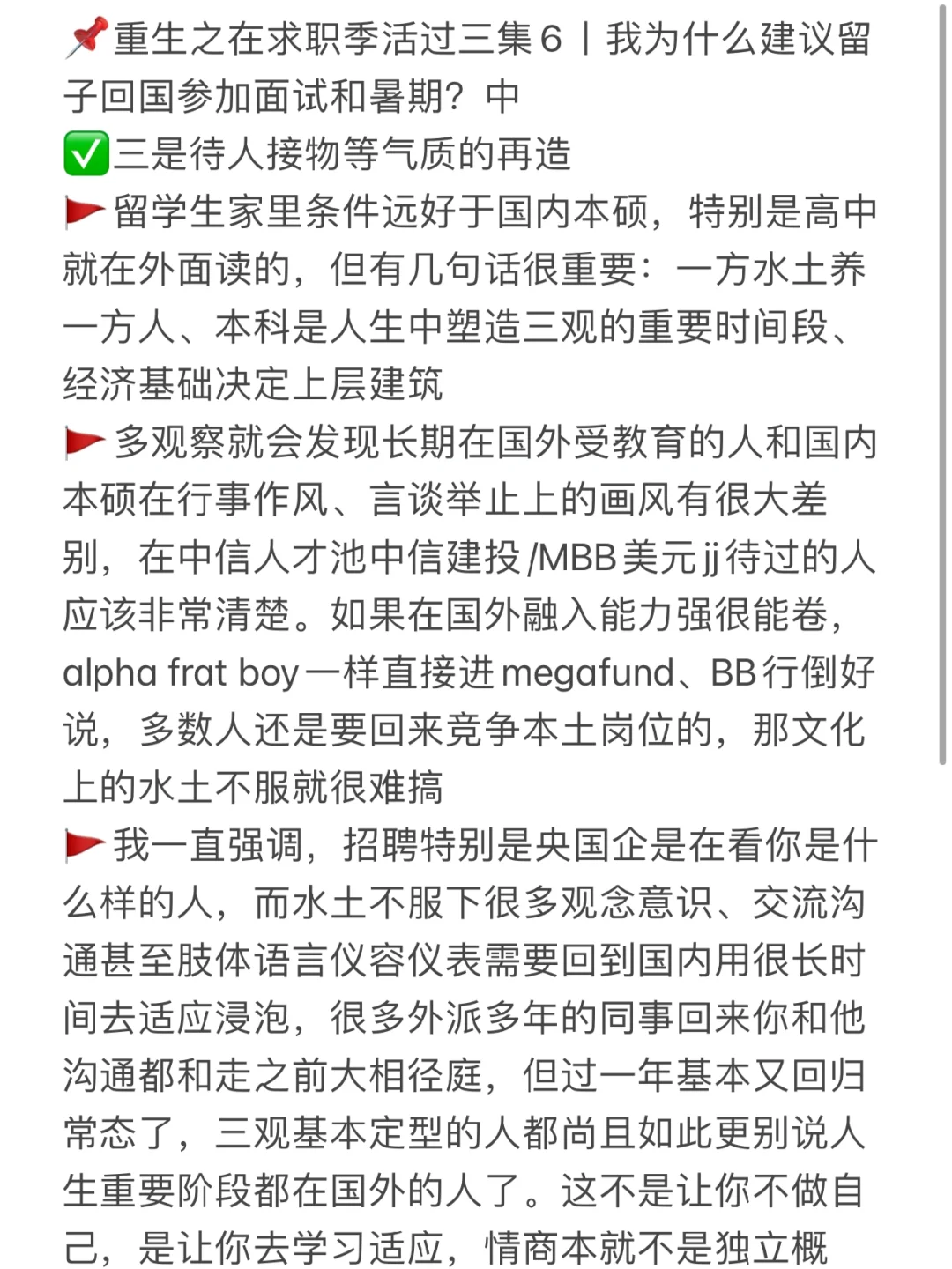 🚩多观察就会发现长期在国外受教育和国内本硕在行事作风、言谈举止上的画风有很大差别,在中信人才池中信建投/MBB美元jj待过的应该非常清楚。如果在国外融入能力强很能卷,alpha frat boy一样直接进megafund、BB行倒好说,多数人还是要回来竞争本土岗位的,那文化上水土不服就很难搞