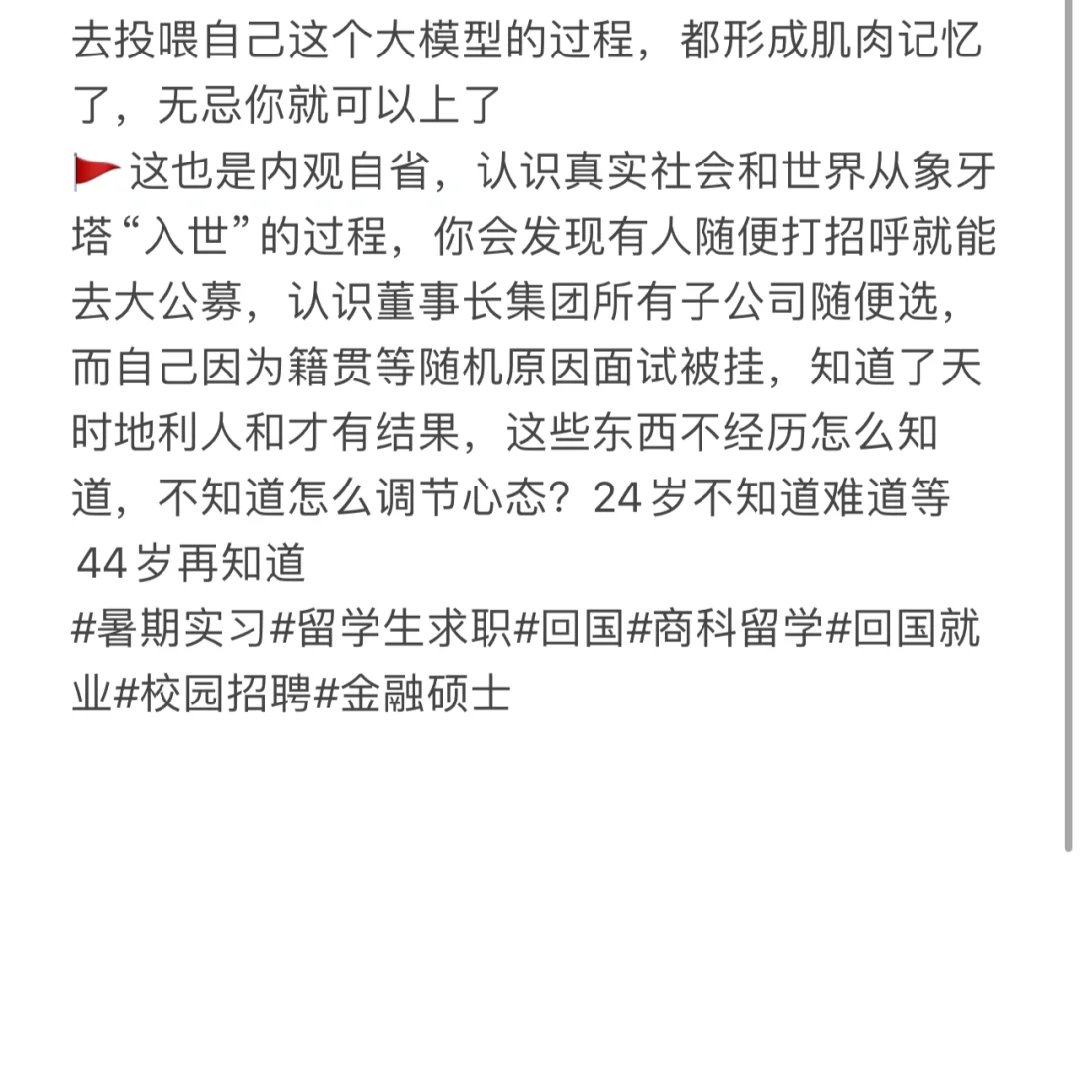 🚩这也是内观自省,认识真实社会和世界从象牙塔“入世”的过程,你会发现有人随便打招呼就能去大公募,认识董事长集团所有子公司随便选,而自己因为籍贯等随机原因面试被挂,知道了天时地利人和才有结果,这些东西不经历怎么知道,不知道怎么调节心态?24岁不知道难道等44岁再知道