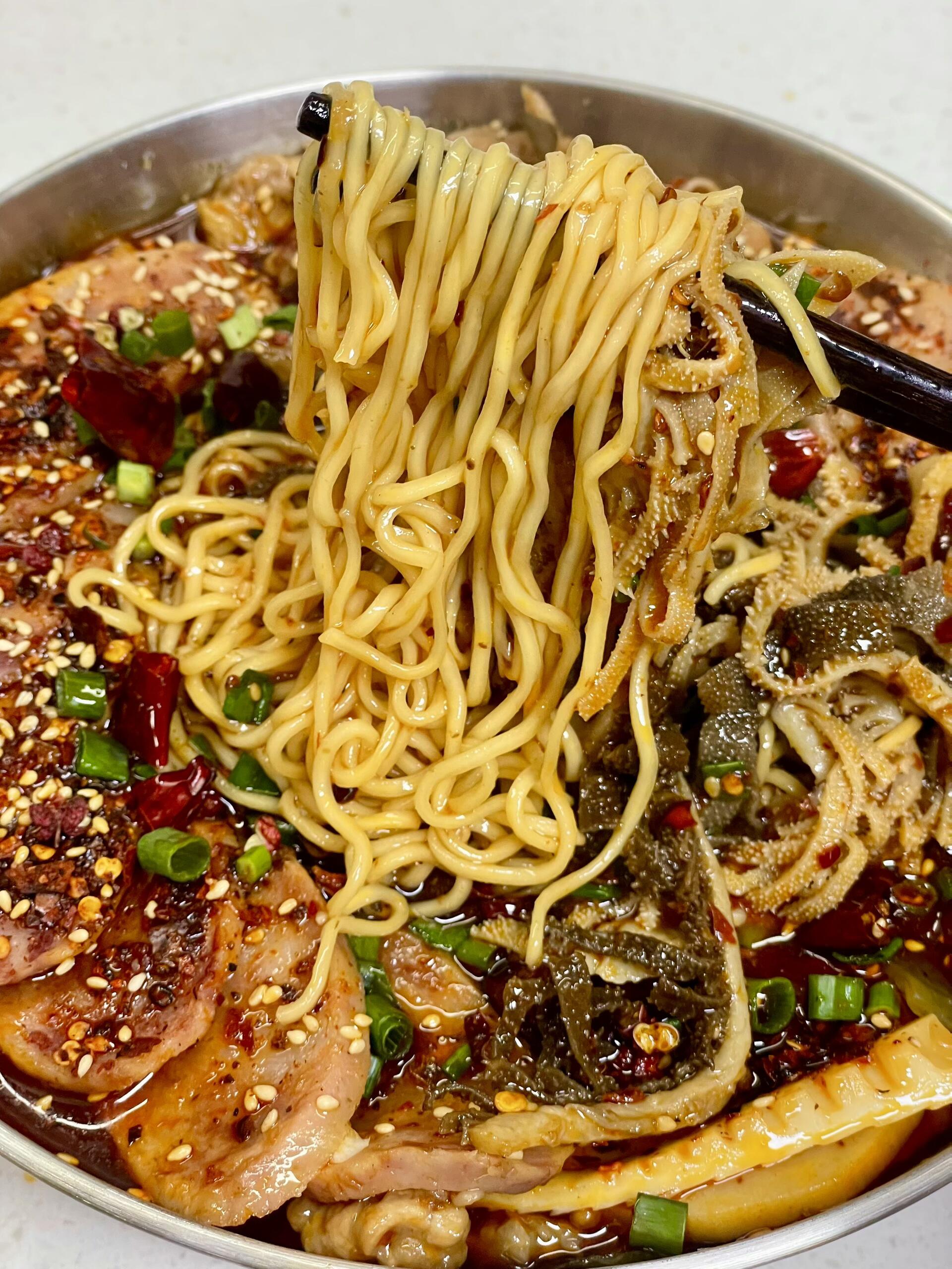5. 方便面最后放:煮2分钟刚好,软而不烂,吸饱汤汁后,每根面条都裹着红油,比单独煮泡面好吃100倍!