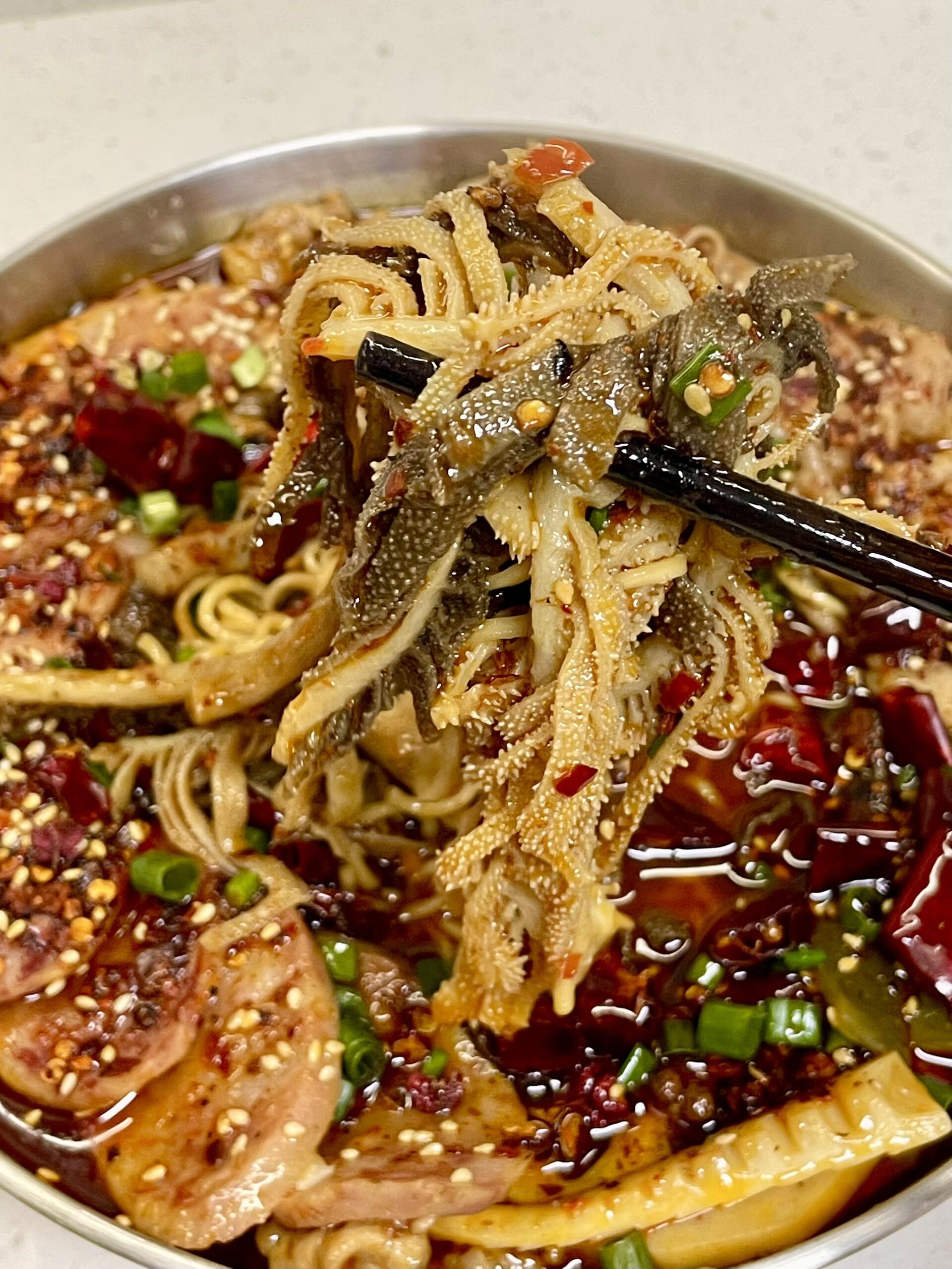 4. 千层肚煮30秒:买现成的冰鲜千层肚,不用焯水,直接下锅煮30秒,卷起来就捞,脆嫩爽口。