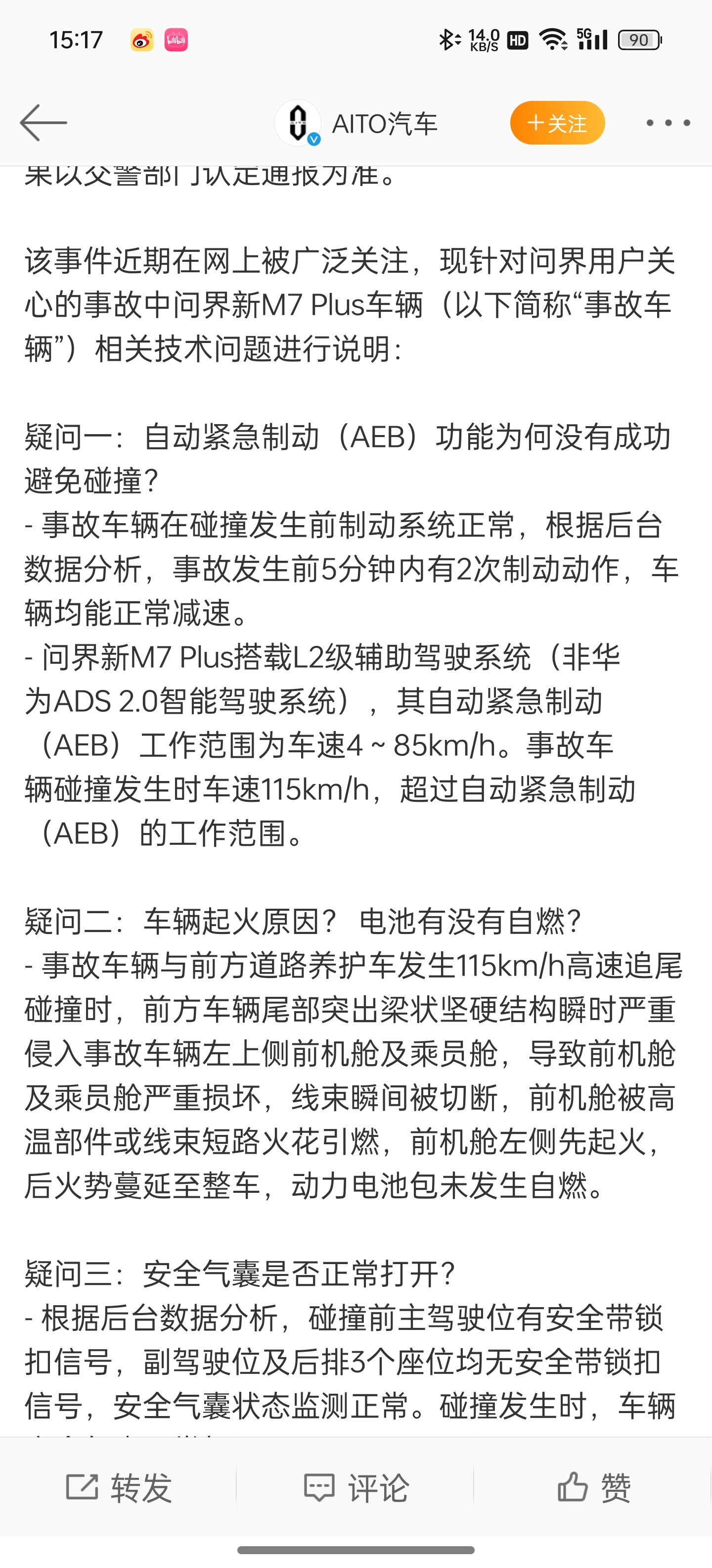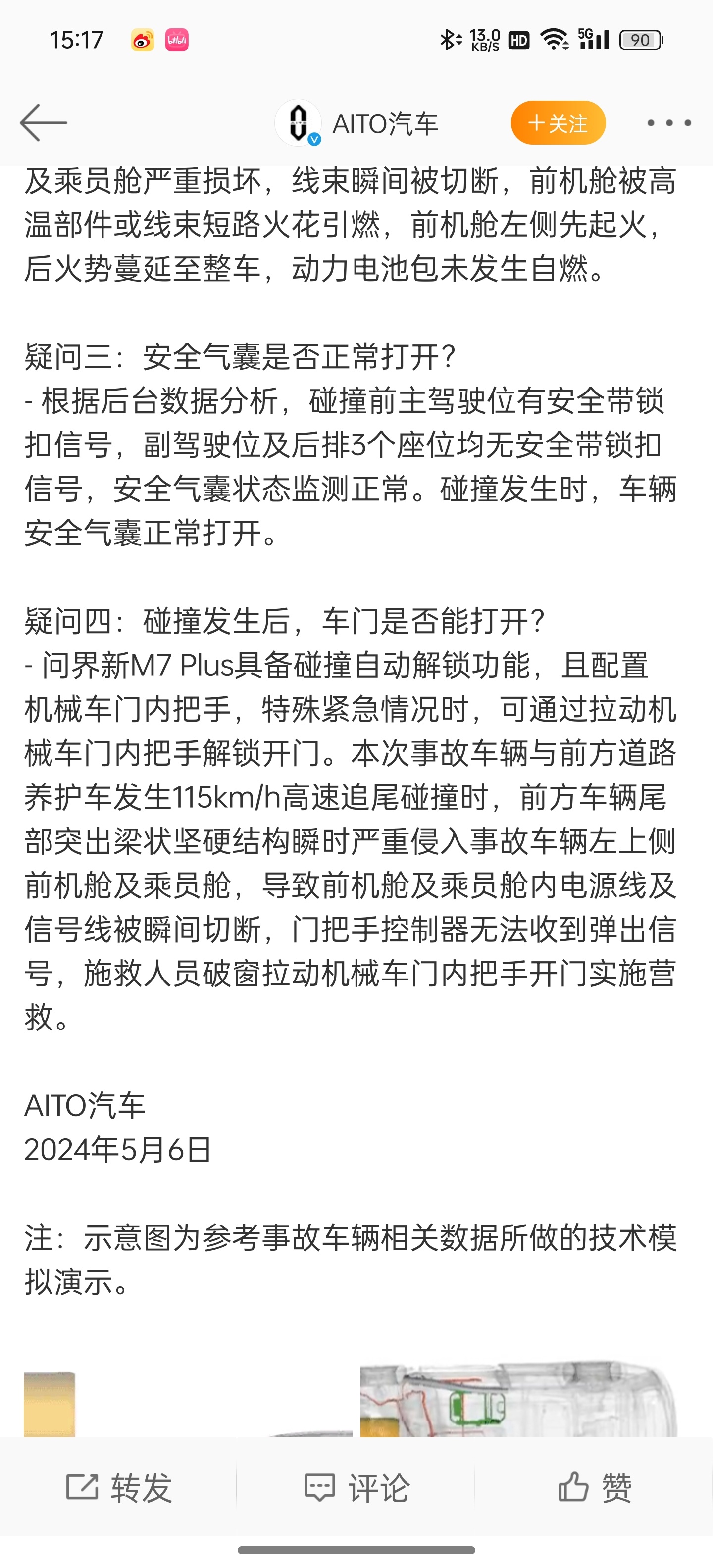 关于山西问界新M7 Plus车祸,问界汽车官方发布相关技术说明: