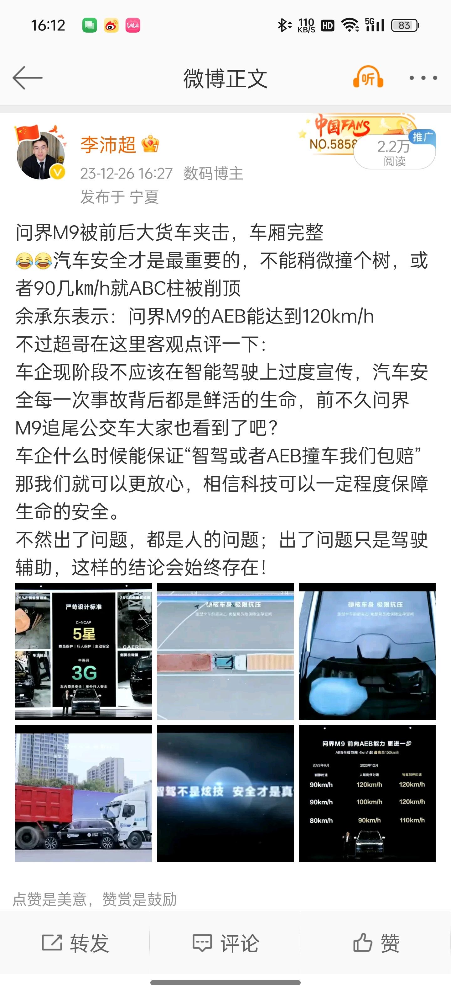 超哥虽然是个小自媒体,也没什么声量,很多人骂我们就是恰烂饭和给饭就恰,但其实我自己清楚我有什么样的底线和自我约束,我一年要拒绝无数通稿发布,纯广告推广的合作,所以我穷。通过这次问界出事,我看到一些光速为车企切割和洗地的博主,我明白媒体一旦没有底线,没有管控,没有道德准则是非常可怕和可悲的事。