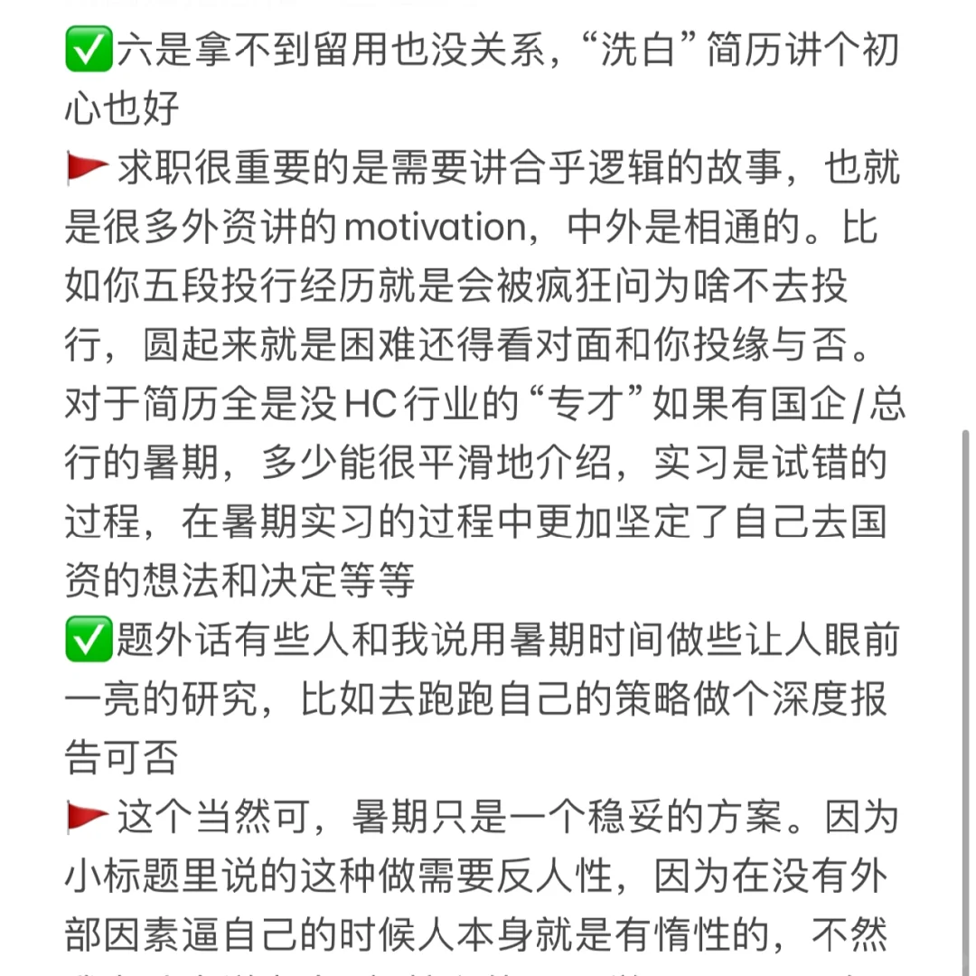 🚩求职很重要的是需要讲合乎逻辑的故事,也就是很多外资讲的motivation,中外是相通的。比如你五段投行经历就是会被疯狂问为啥不去投行,圆起来就是困难还得看对面和你投缘与否。对于简历全是没HC行业的“专才”如果有国企/总行的暑期,多少能很平滑地介绍,实习是试错的过程,在暑期实习的过程中更加坚定了自己去国资的想法和决定等等