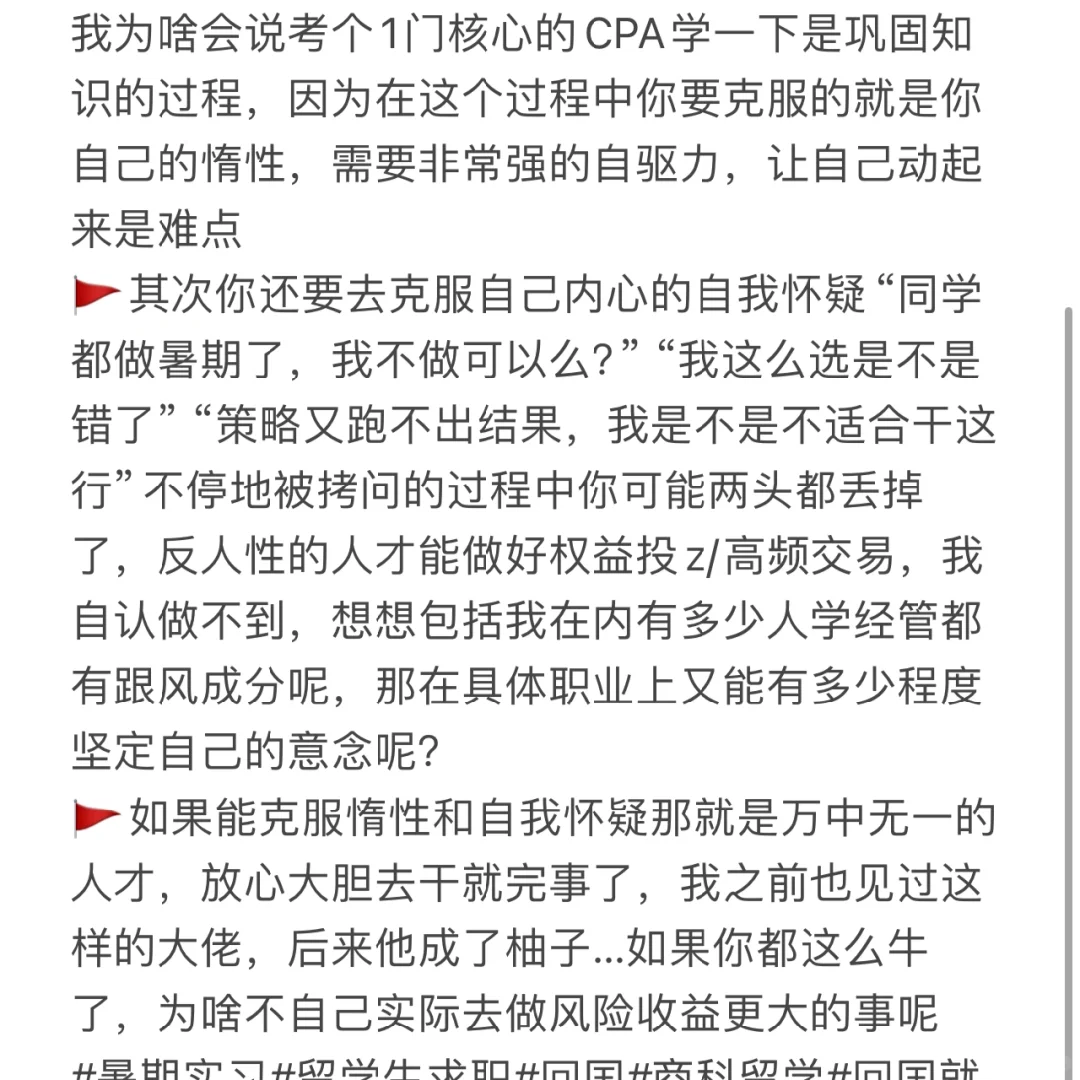 🚩这个当然可,暑期只是一个稳妥的方案。因为小标题里说的这种做需要反人性,因为在没有外部因素逼自己的时候人本身就是有惰性的,不然我为啥会说考个1门核心的CPA学一下是巩固知识的过程,因为在这个过程中你要克服的就是你自己的惰性,需要非常强的自驱力,让自己动起来是难点