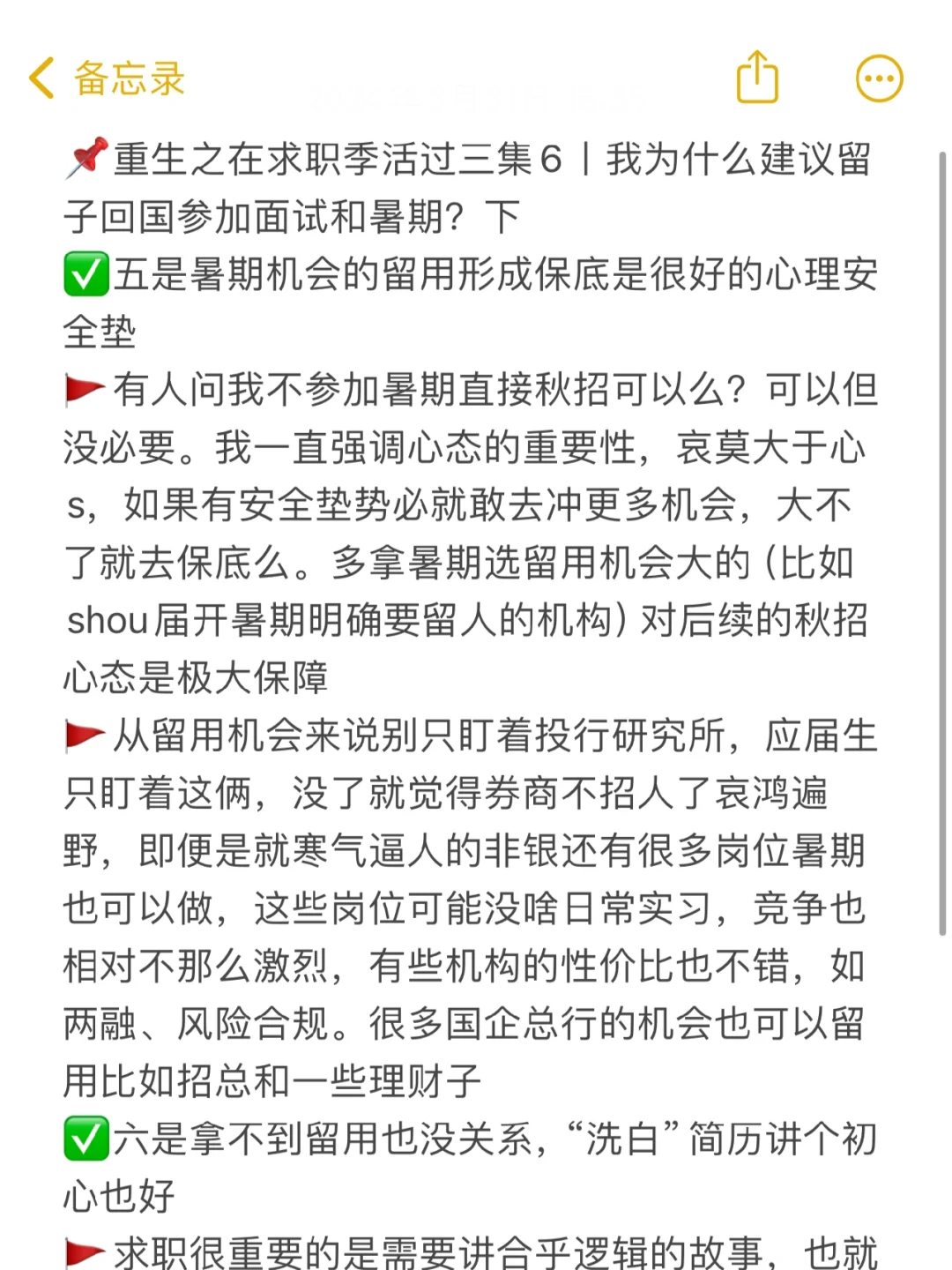 🚩有人问我不参加暑期直接秋招可以么?可以但没必要。我一直强调心态的重要性,哀莫大于心s,如果有安全垫势必就敢去冲更多机会,大不了就去保底么。多拿暑期选留用机会大的(比如shou届开暑期明确要留人的机构)对后续的秋招心态是极大保障