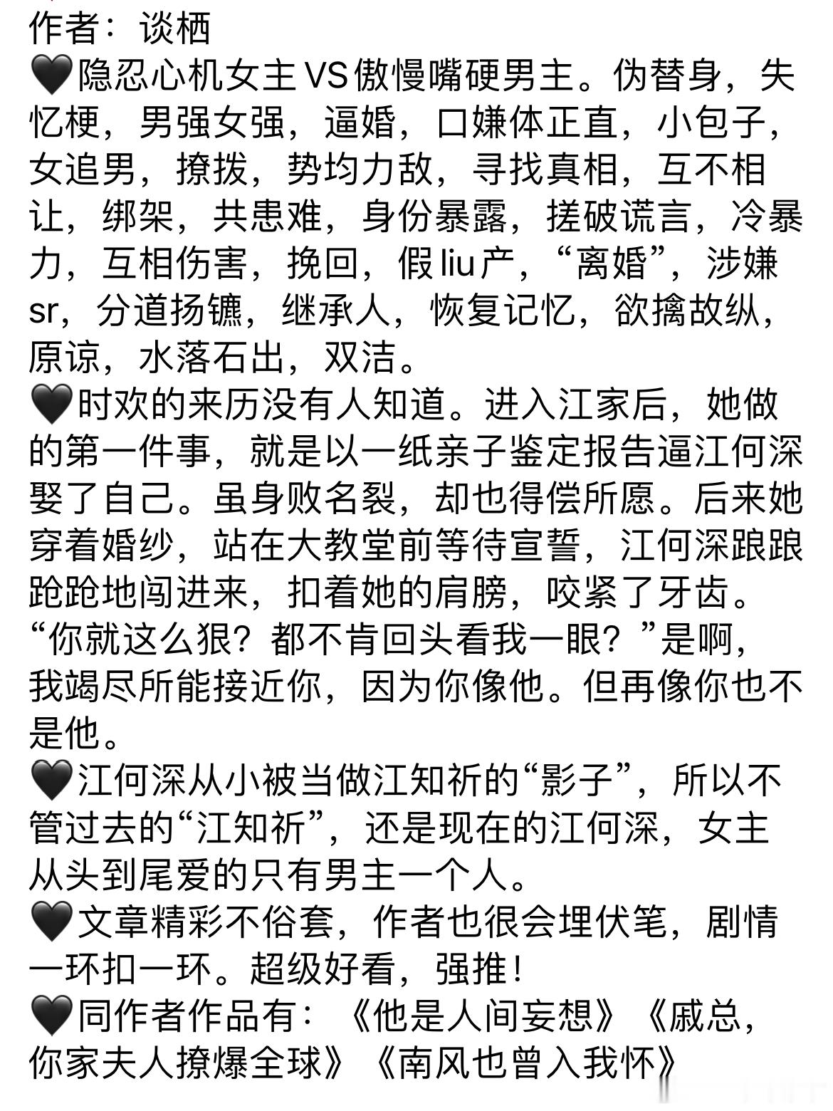 🖤时欢的来历没有人知道。进入江家后,她做的第一件事,就是以一纸亲子鉴定报告逼江何深娶了自己。虽身败名裂,却也得偿所愿。后来她穿着婚纱,站在大教堂前等待宣誓,江何深踉踉跄跄地闯进来,扣着她的肩膀,咬紧了牙齿。“你就这么狠?都不肯回头看我一眼?”是啊,我竭尽所能接近你,因为你像他。但再像你也不是他。总裁文推文小说推荐小说推文