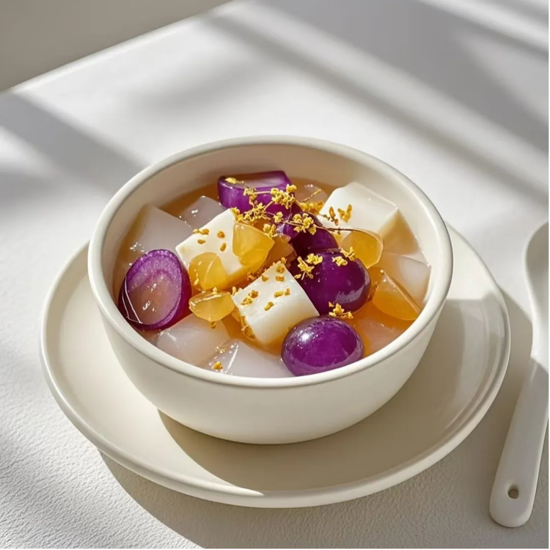 葡萄汁与桂花调制的冰粉果冻,晶莹剔透,入口酸甜沁凉,为周末增添一份甜蜜滋味。