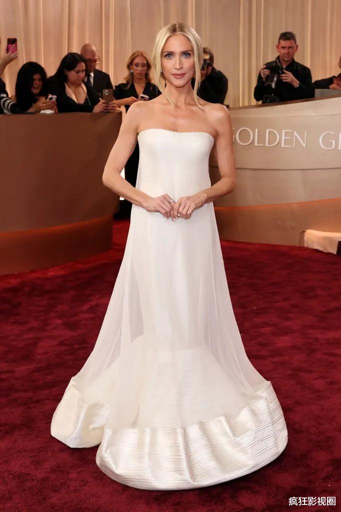 凭借新剧《我心中的野兽》获得三项大奖提名的布兰妮·斯诺,身着白色无袖钟形裙摆礼服,造型简洁低调。
