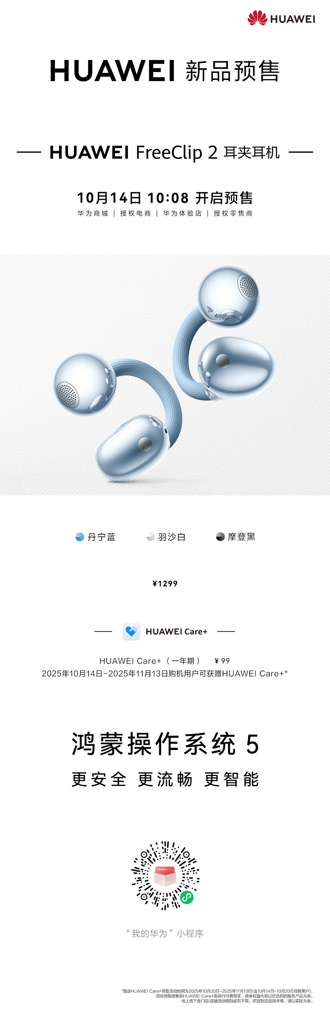 10月14日,伴随着@华为终端 发布预售海报,备受全球消费者瞩目的华为FreeClip 2 耳夹耳机正式开启预售!作为一款登上巴黎时装周的电子配饰,这款耳夹耳机自亮相以来,就受到了全球用户的广泛关注!