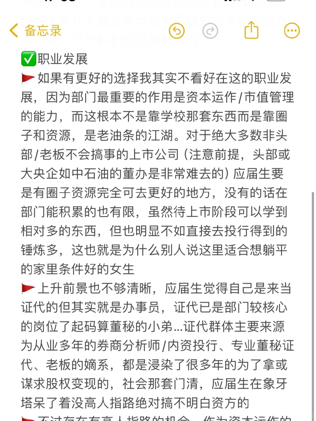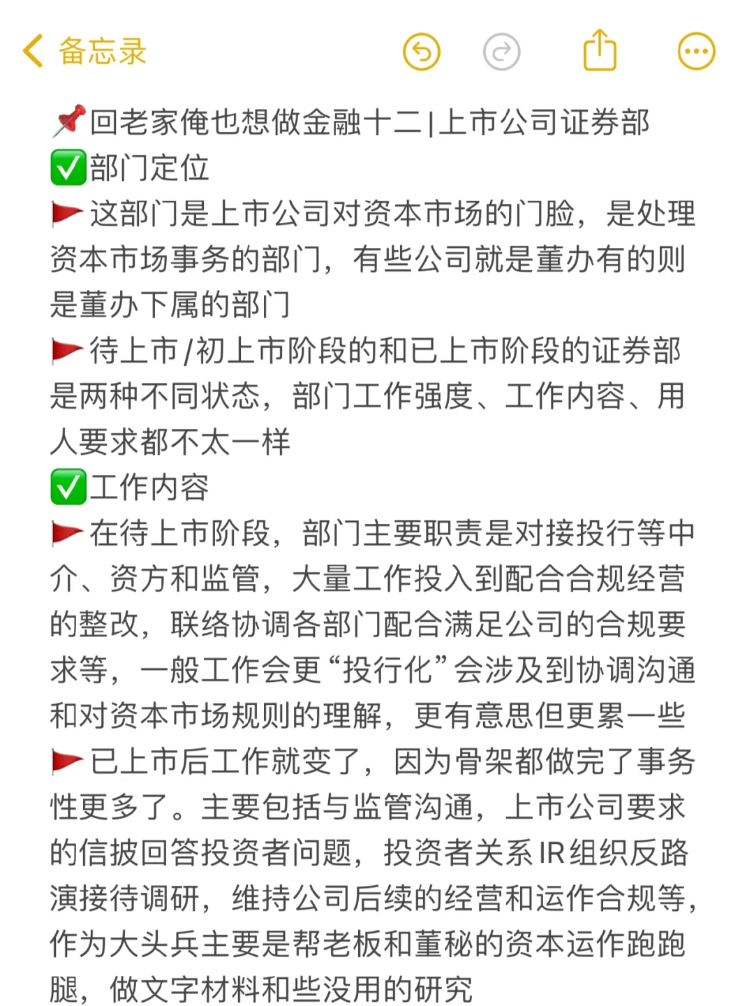 🚩如果有更好的选择我其实不看好在这的职业发展,因为部门最重要的作用是资本运作/市值管理的能力,而这根本不是靠学校那套东西而是靠圈子和资源,是老油条的江湖。对于绝大多数非头部/老板不会搞事的上市公司(注意前提,头部或大央企如中石油的董办是非常难去的)应届生要是有圈子资源完全可去更好的地方,没有的话在部门能积累的也有限,虽然待上市阶段可以学到相对多的东西,但也明显不如直接去投行得到的锤炼多,这也就是为什么别人说这里适合想躺平的家里条件好的女生