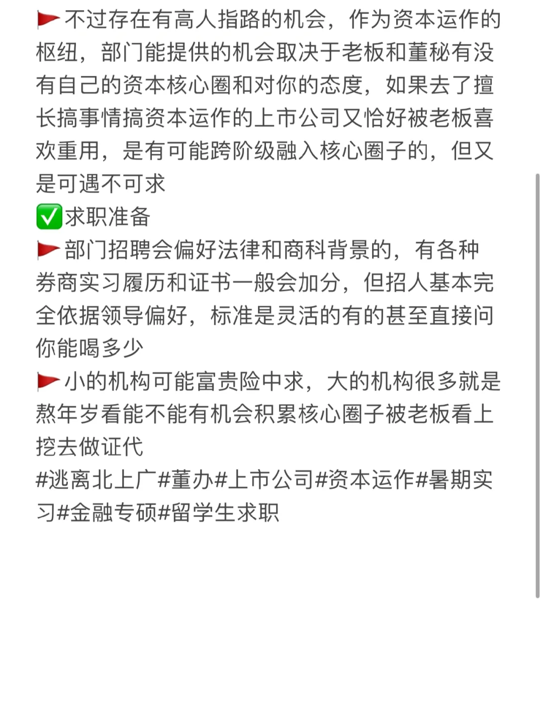 🚩不过存在有高人指路的机会,作为资本运作的枢纽,部门能提供的机会取决于老板和董秘有没有自己的资本核心圈和对你的态度,如果去了擅长搞事情搞资本运作的上市公司又恰好被老板喜欢重用,是有可能跨阶级融入核心圈子的,但又是可遇不可求