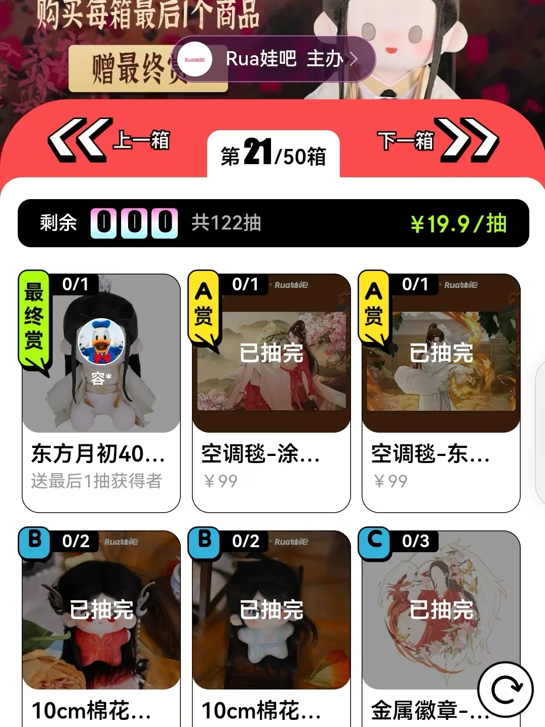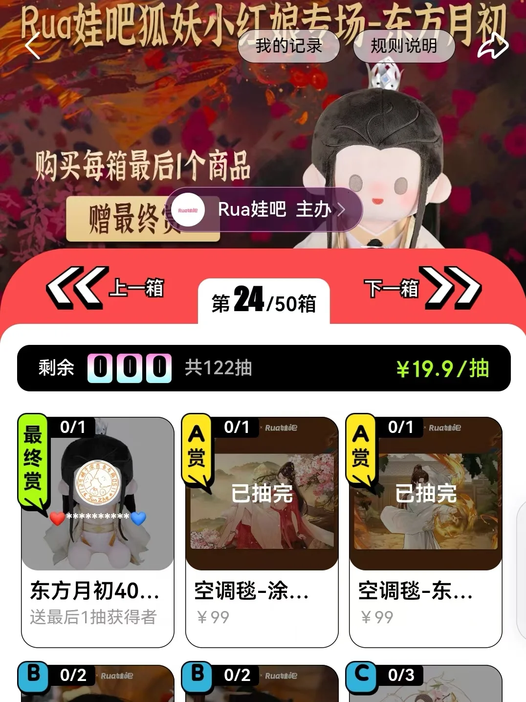 狐妖小红娘的Rua娃吧的周边!!点进去的时候很多都被抽没了!人太多是因为19.9的羊毛都在薅嘛‼️ 我抽的东方月初的箱子抽到了涂山荣荣吧唧也很不错~虽然是冲着有痣版的龚俊去的!我在努力努力!蹲一个限量版娃 👉在VD—rua娃吧—抽番 抓紧先去排队💫