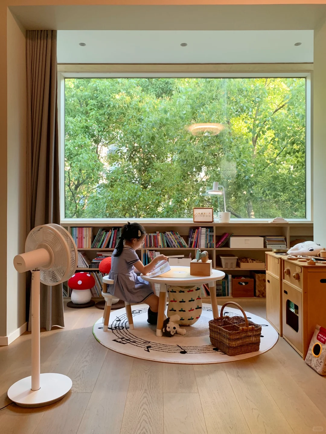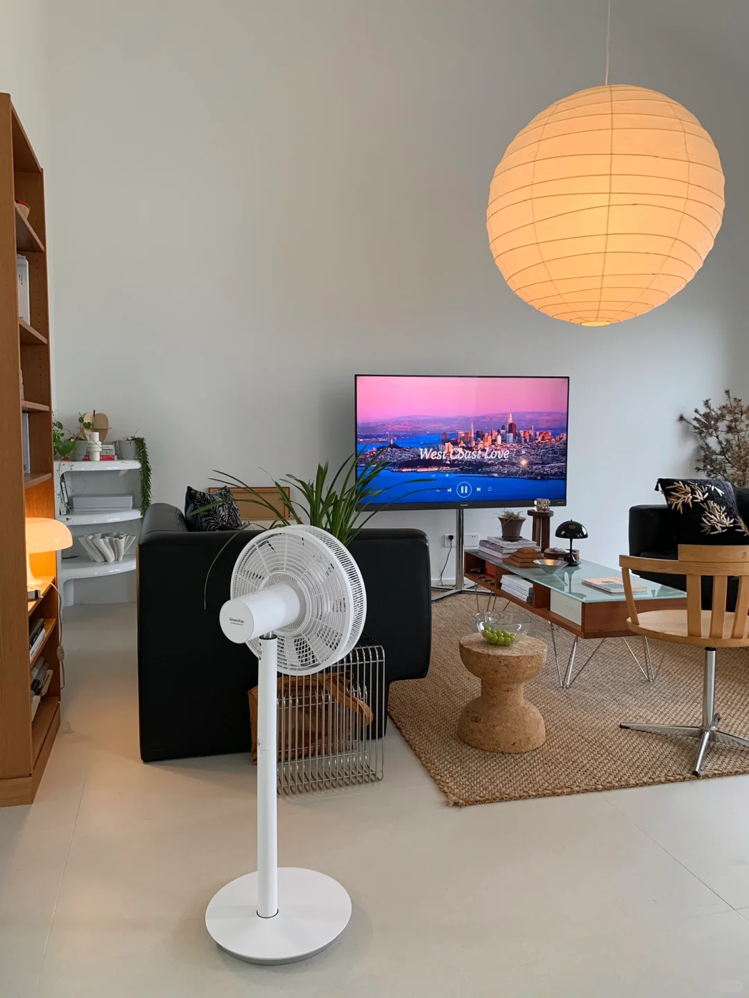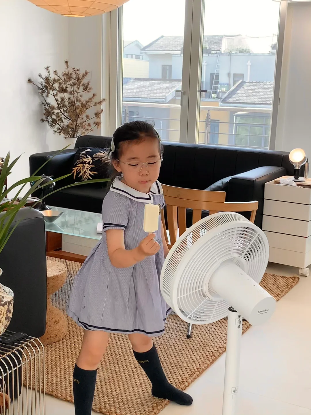 前两天看浪姐,主题是「雨」,而上海的天气,也很巧地从高温晴天,转入了夏雨🌧️ 雨后的夏天,空气清新湿润,屋里的风,吹来了刚刚割过的青草的香味,也吹来了西瓜的香甜。 这个季节,打开南北阳台的落地窗,打开电扇,看着刚拖完的地砖由湿变干,窗外的雨水淋湿了阳台,也清澈了内心的烦躁。 上个月我就把巴慕达果岭风扇搬到了客厅,让散落在客厅和餐厅角落里的植物们,可以保持通风,它外九内五的双层扇叶结构非常神奇,不同于一般风扇吹出的风不是直直的硬硬的,而是像大自然的风一样,体感柔和,风速轻缓,同时能覆盖的面积又很大,即使你把它开到大风速,站在风扇前,也不会有强烈的旋风捶打脸庞的感觉,而是很接近自然风的,从头到脚被风包裹着的清凉,所以女儿放学回家,会喜欢站在风扇前,边吹风边吃棒冰,而我也不用担心她被吹到头痛。 风扇1档的声音,人耳几乎捕捉不到,即使开到3档,也只有微弱的风声,所以夏季的夜晚,我们家会开一点点空调,把巴慕达当作空气循环扇,让整个屋子都凉爽起来,又不用担心会影响睡眠,也不用害怕太过阴凉。 它有150度的摆头范围,送风范围很广,关闭的时候,风扇会转回到中心位,强迫症直观感受真的非常好。 拆掉中间杆子,也能变成小型风扇,黄梅季节给厨房做循环扇,降低湿度就很合适,不用担心木头柄的厨具长霉点啦。 而且,它还可以选购配件,变成充电电扇❗️这样无论是带出去露营用,花园或者露台用,甚至放到没有安排电源的衣帽间都可以。