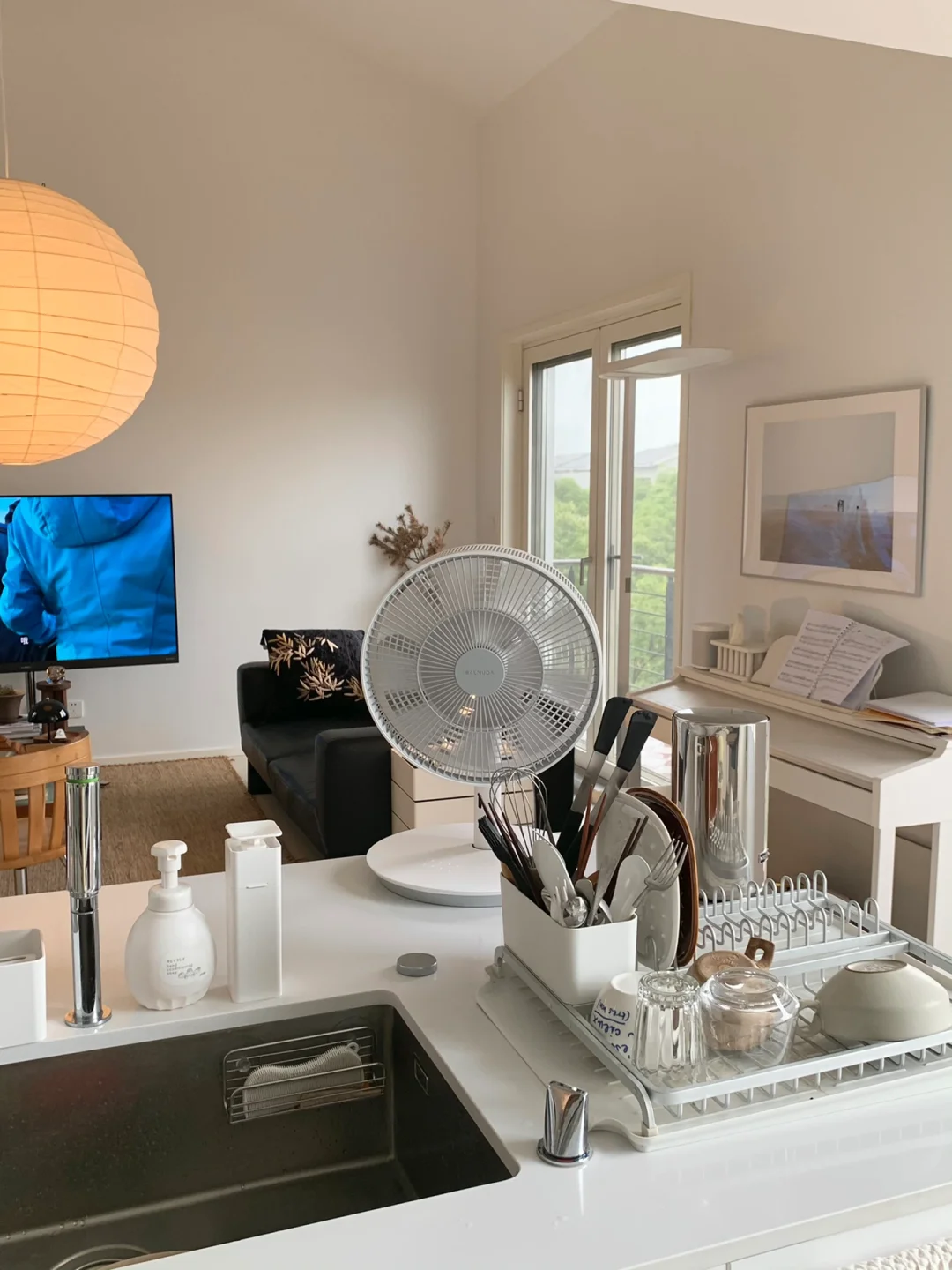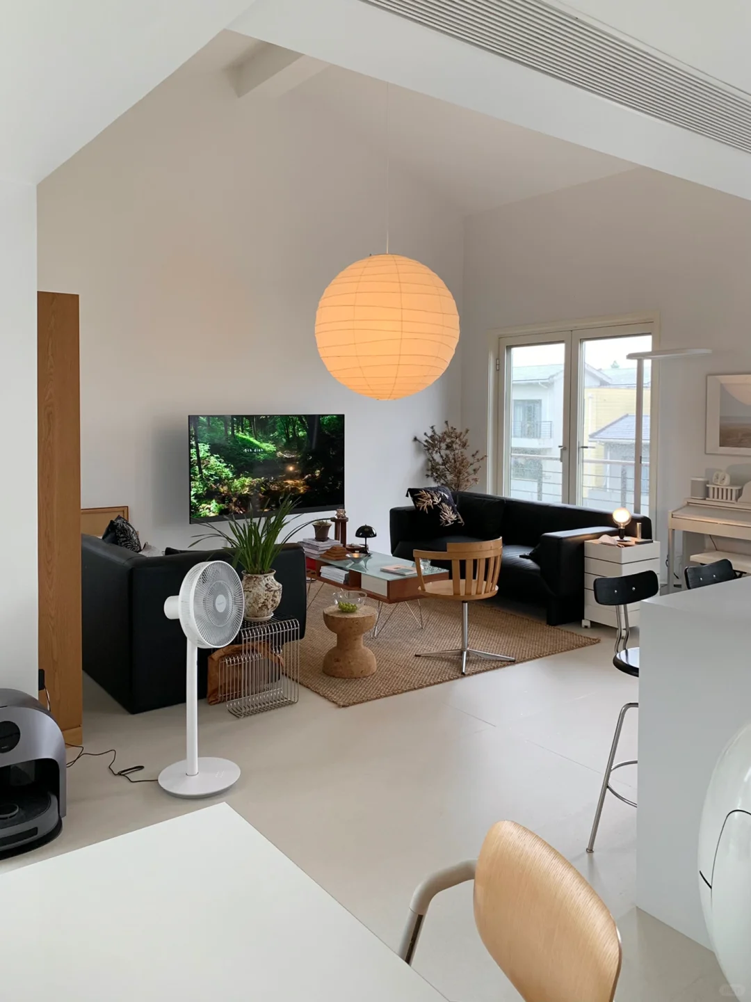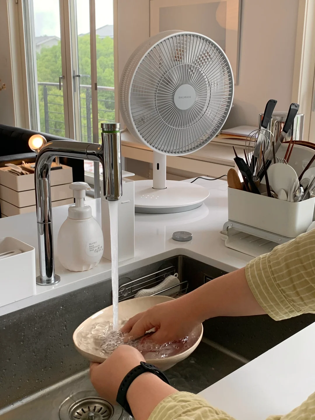 前两天看浪姐,主题是「雨」,而上海的天气,也很巧地从高温晴天,转入了夏雨🌧️ 雨后的夏天,空气清新湿润,屋里的风,吹来了刚刚割过的青草的香味,也吹来了西瓜的香甜。 这个季节,打开南北阳台的落地窗,打开电扇,看着刚拖完的地砖由湿变干,窗外的雨水淋湿了阳台,也清澈了内心的烦躁。 上个月我就把巴慕达果岭风扇搬到了客厅,让散落在客厅和餐厅角落里的植物们,可以保持通风,它外九内五的双层扇叶结构非常神奇,不同于一般风扇吹出的风不是直直的硬硬的,而是像大自然的风一样,体感柔和,风速轻缓,同时能覆盖的面积又很大,即使你把它开到大风速,站在风扇前,也不会有强烈的旋风捶打脸庞的感觉,而是很接近自然风的,从头到脚被风包裹着的清凉,所以女儿放学回家,会喜欢站在风扇前,边吹风边吃棒冰,而我也不用担心她被吹到头痛。 风扇1档的声音,人耳几乎捕捉不到,即使开到3档,也只有微弱的风声,所以夏季的夜晚,我们家会开一点点空调,把巴慕达当作空气循环扇,让整个屋子都凉爽起来,又不用担心会影响睡眠,也不用害怕太过阴凉。 它有150度的摆头范围,送风范围很广,关闭的时候,风扇会转回到中心位,强迫症直观感受真的非常好。 拆掉中间杆子,也能变成小型风扇,黄梅季节给厨房做循环扇,降低湿度就很合适,不用担心木头柄的厨具长霉点啦。 而且,它还可以选购配件,变成充电电扇❗️这样无论是带出去露营用,花园或者露台用,甚至放到没有安排电源的衣帽间都可以。
