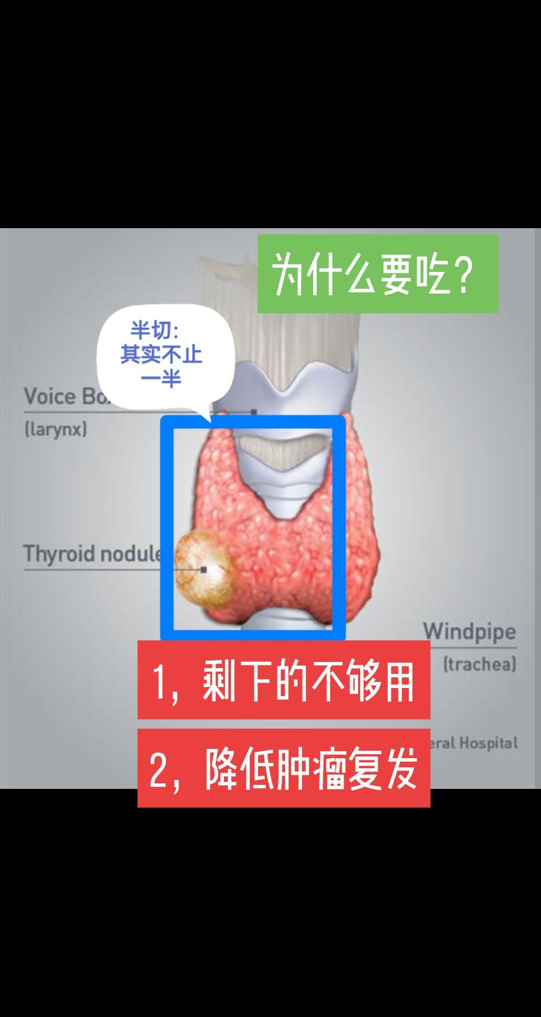 切了甲状腺,为什么要吃药?🍁🍁🍁🍁🍁 一般而言,良性结节半切一般可以不吃药。 这里讲得是恶性肿瘤。 图示可以看到,为了达到根治目的和要求,一般说的半切,切除的往往包括单侧腺叶和峡部。这就是说一般切了2/3。 剩下的往往就不够用。 所以得吃药,可能需要终身吃药。 两个目的:见图片。 甲状腺激素对每个人都很重要。需要规范剂量服用,定期复查,一般患者术后生活质量 都很好。 药物也容易获得,服用方便。 还有不清楚的,及时咨询专业外科医生💪